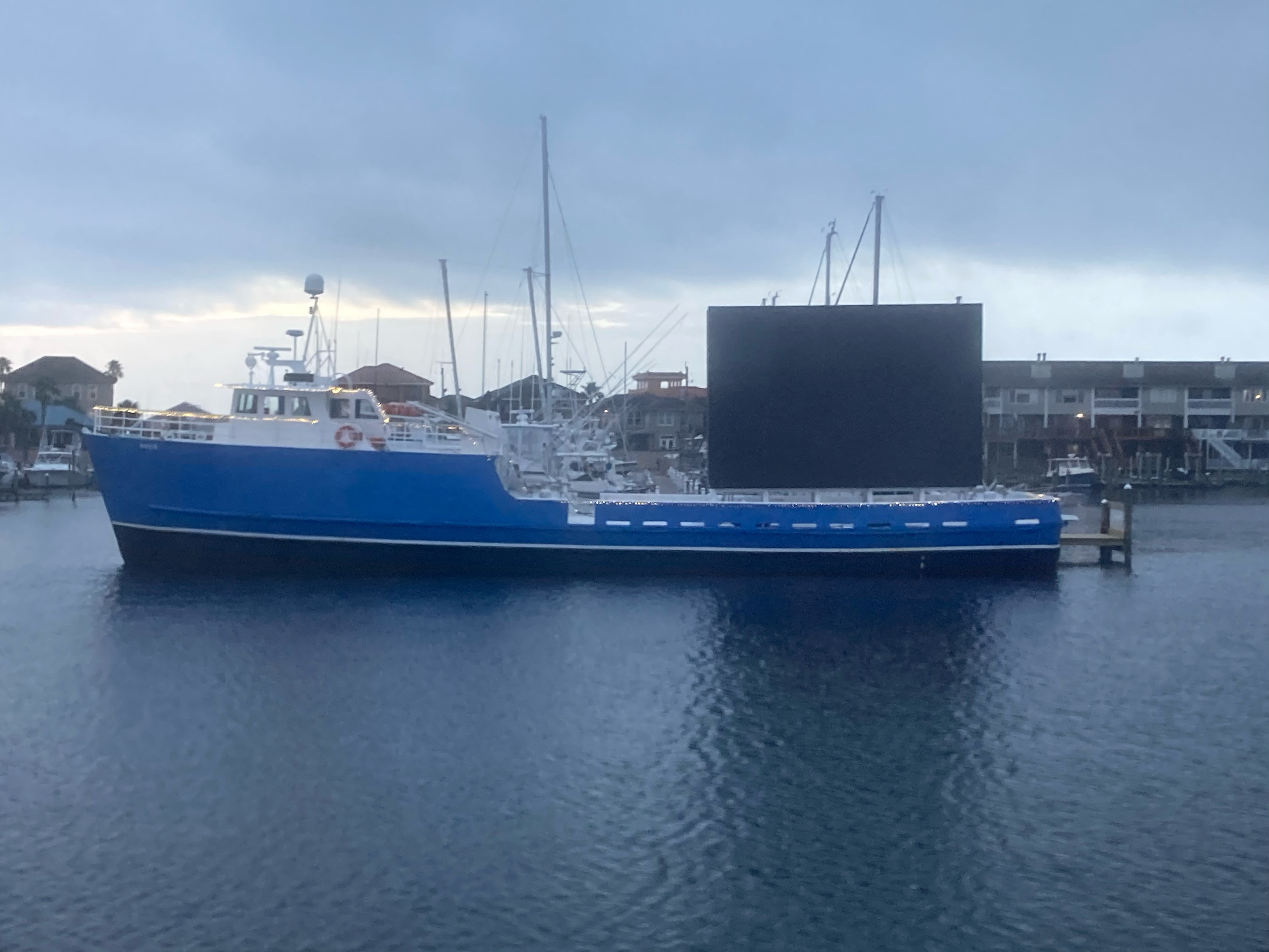 Here’s an example of an entreprenureal fellow. Old fishing boat with a HUGE video screen mounted on the deck. Marry Me, Happy Birthday wishes, etc.