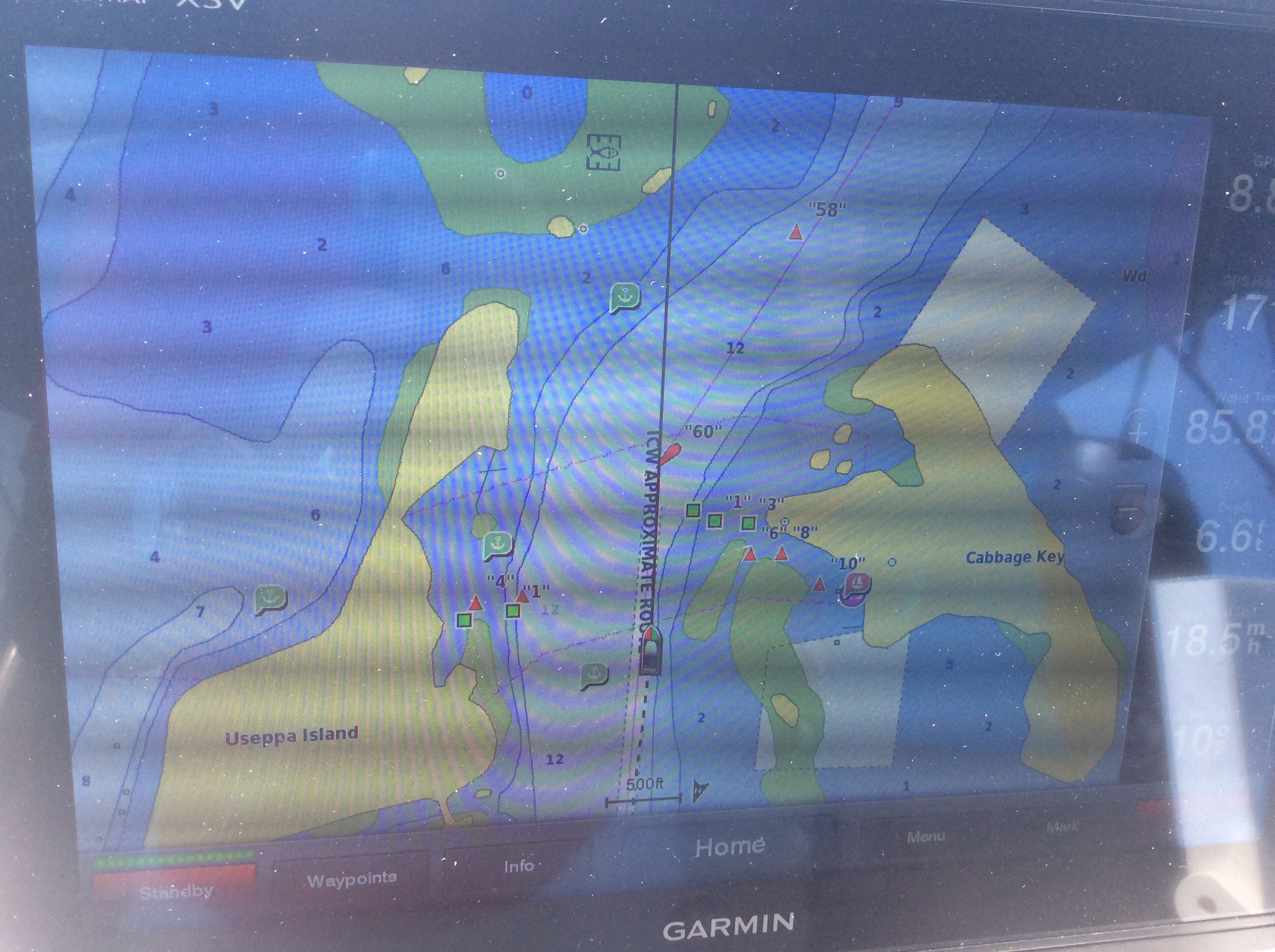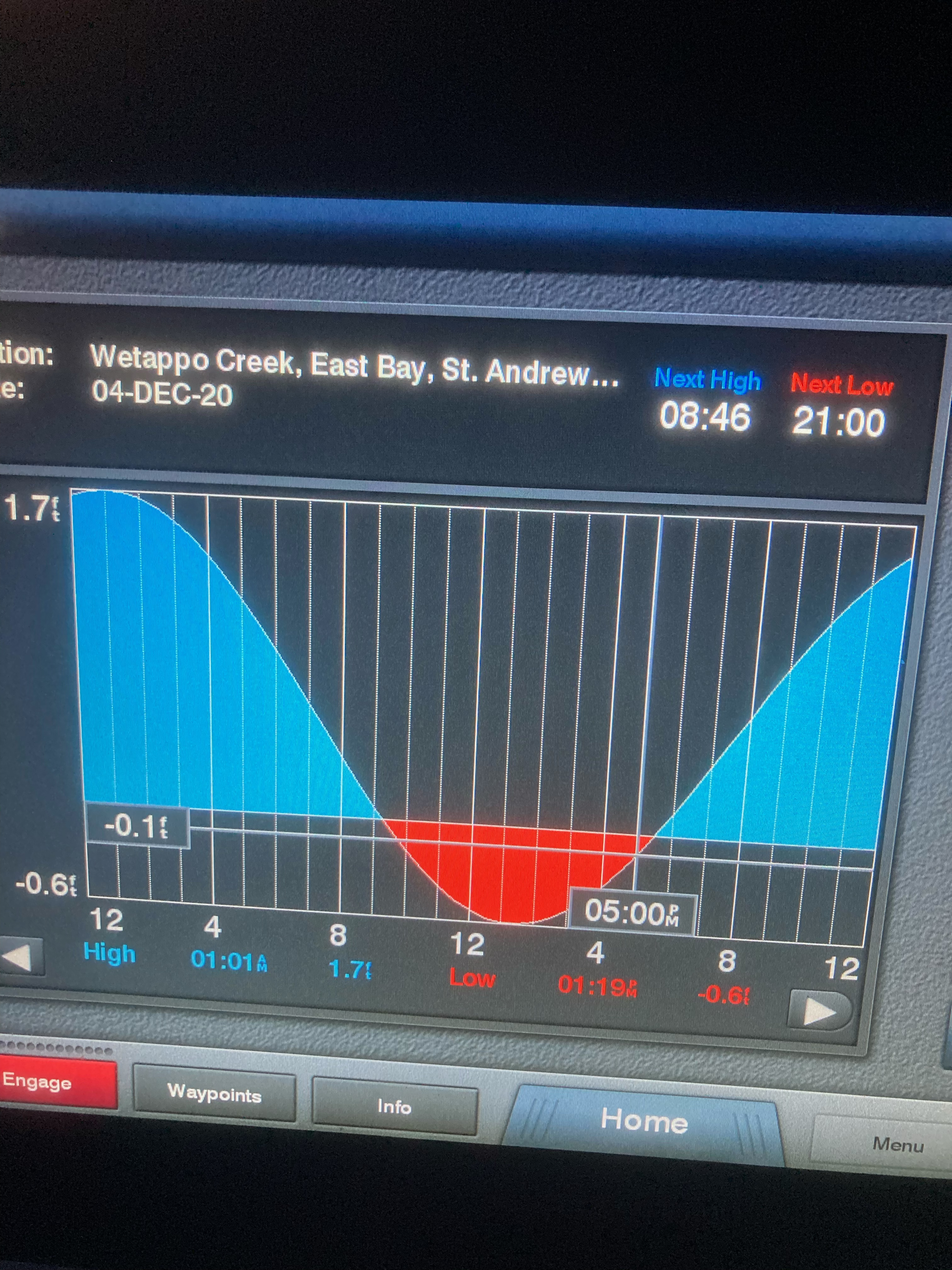 The above photo is of one of our multifunction displays. This display shows the tide where we are anchored tonight. Low tide will be around 1 AM with a rising tide starting around 5 AM. The wind and incoming tide will keep us straight in our anchorage without the boat making a 180 degree swing when the tide changes direction.