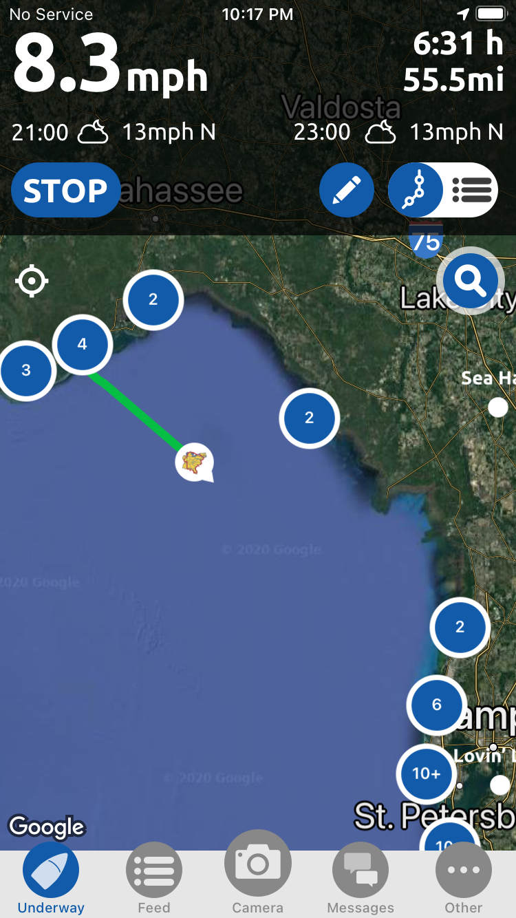 We had been underway for 6 and a half hours with 55 miles behind us when this photo was taken. All of the numbers in blue circles are boats that use this NEBO boat locator app, most of which are Loopers.