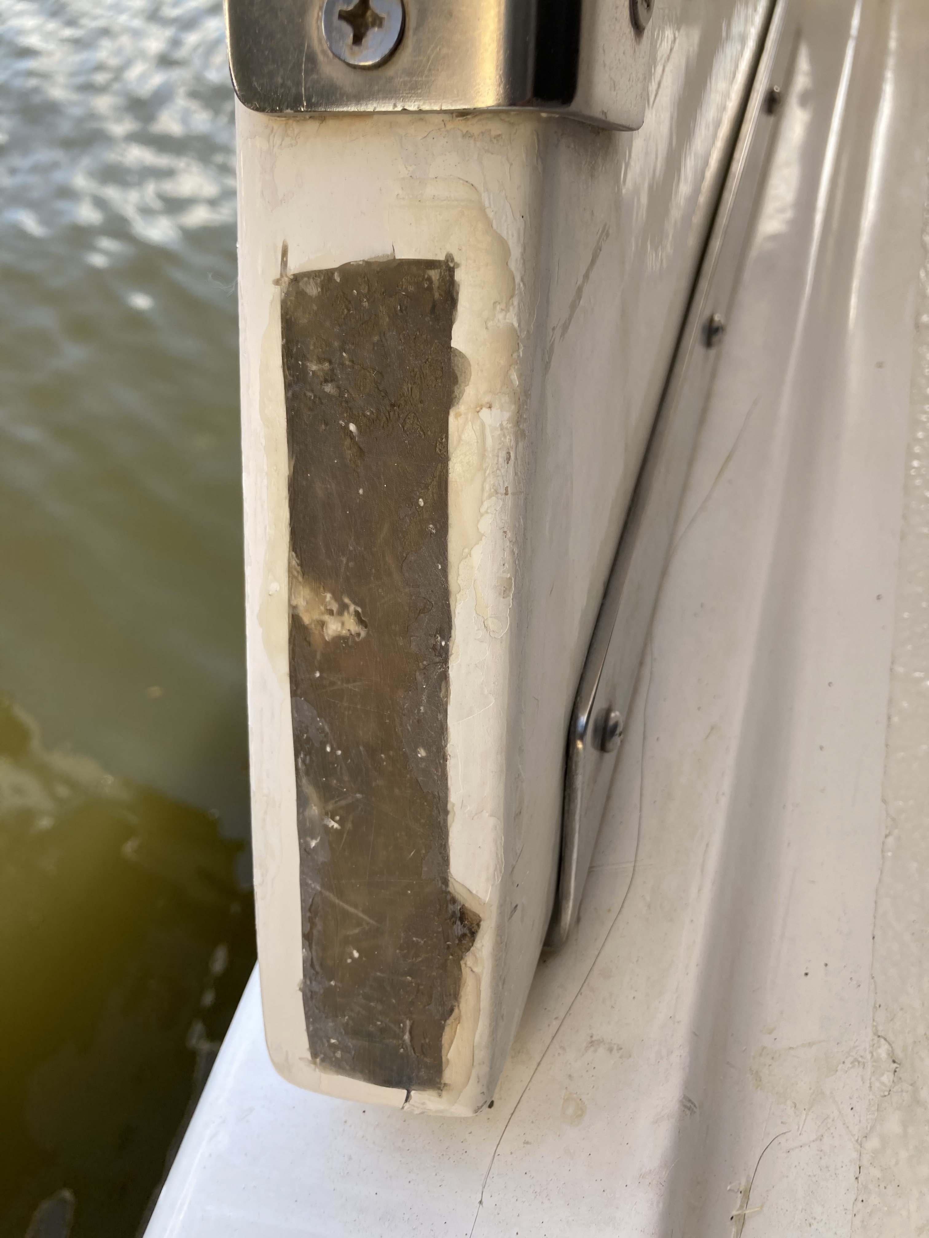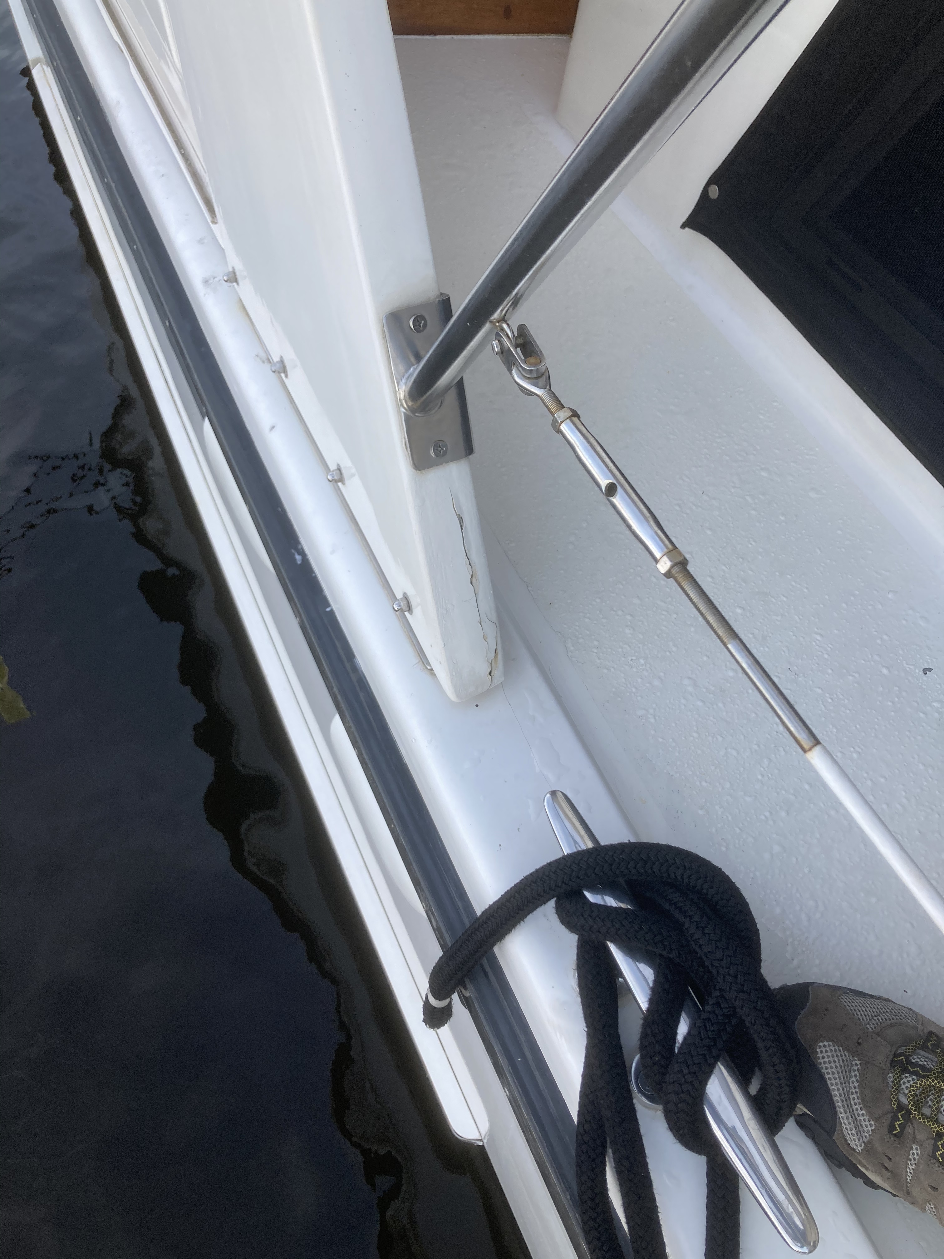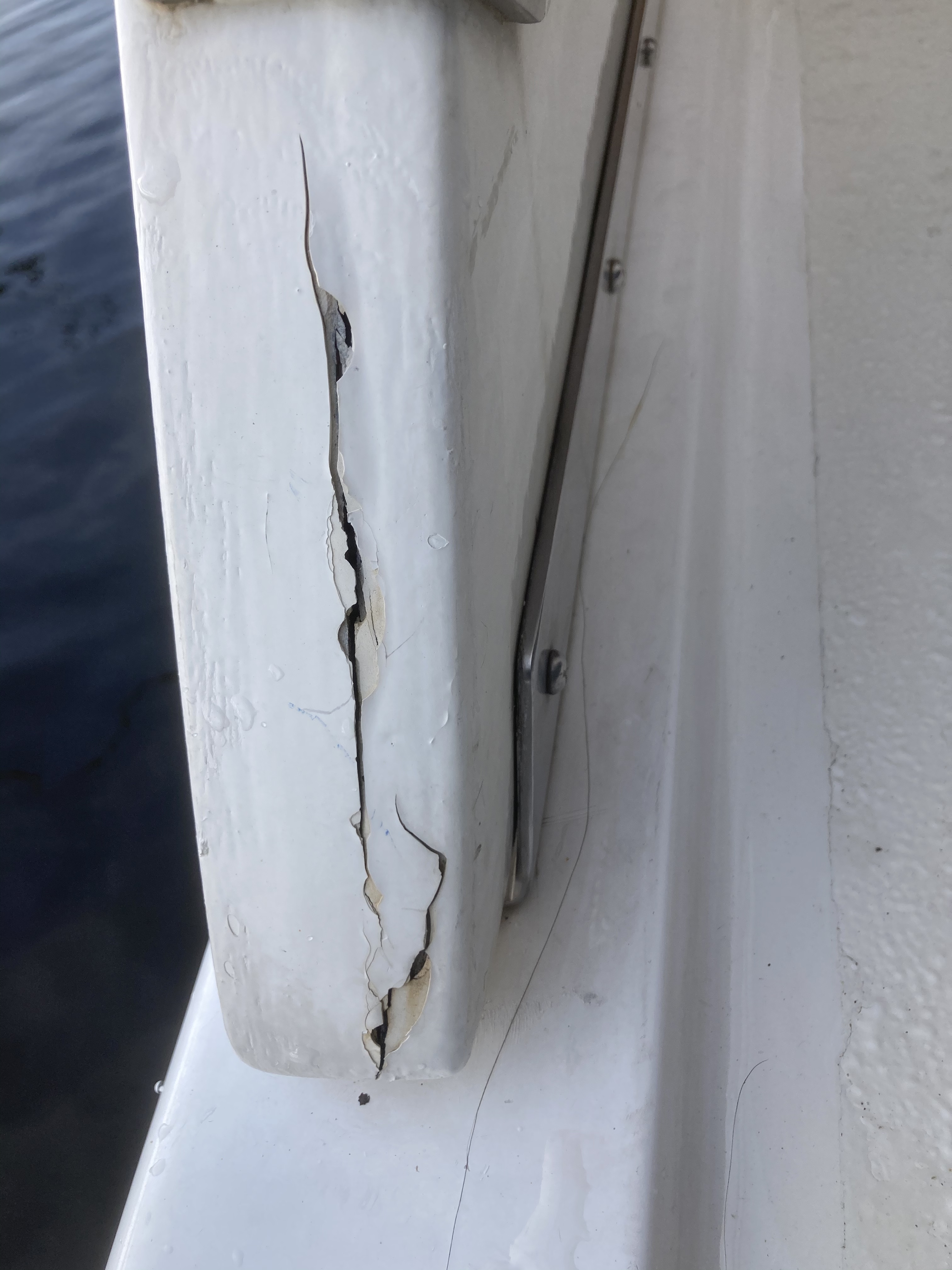 One issue that has been a bit of an eyesore on WB was a crack in the fiberglass on the aft deck hardtop supports. These cracks were present when Debbie and I purchased the boat but the surveyor said no big deal. So I never addressed it. Add to the fact that I know absolutely NOTHING about fiberglass repairs. Until now. You may recall the crew of Carried Away, a wonderful couple from Michigan that we met on the east coast in ‘19. Carrie worked for Trojan Yachts and actually did the layout schedule for that brand of boats. He knows fiberglass.