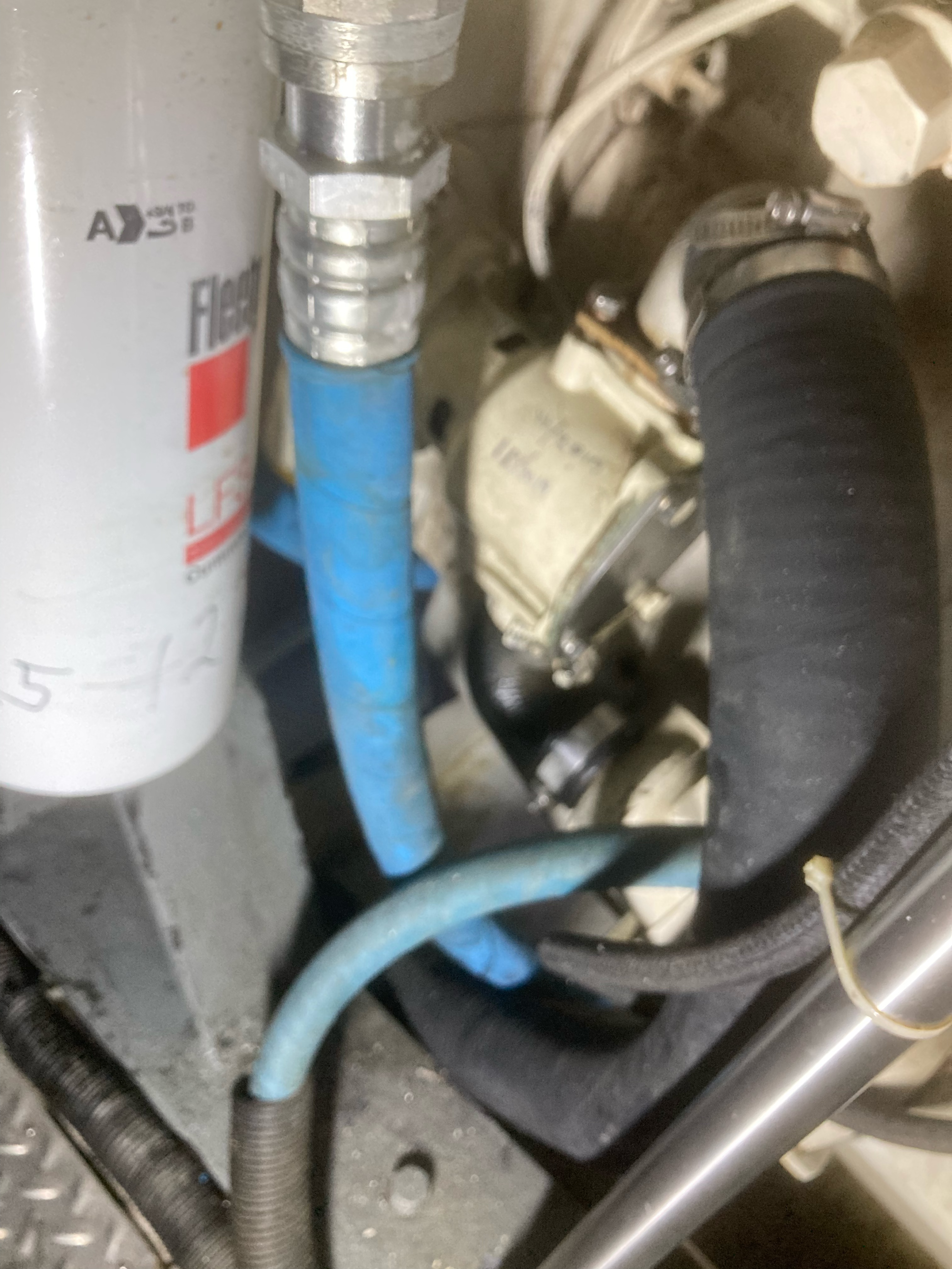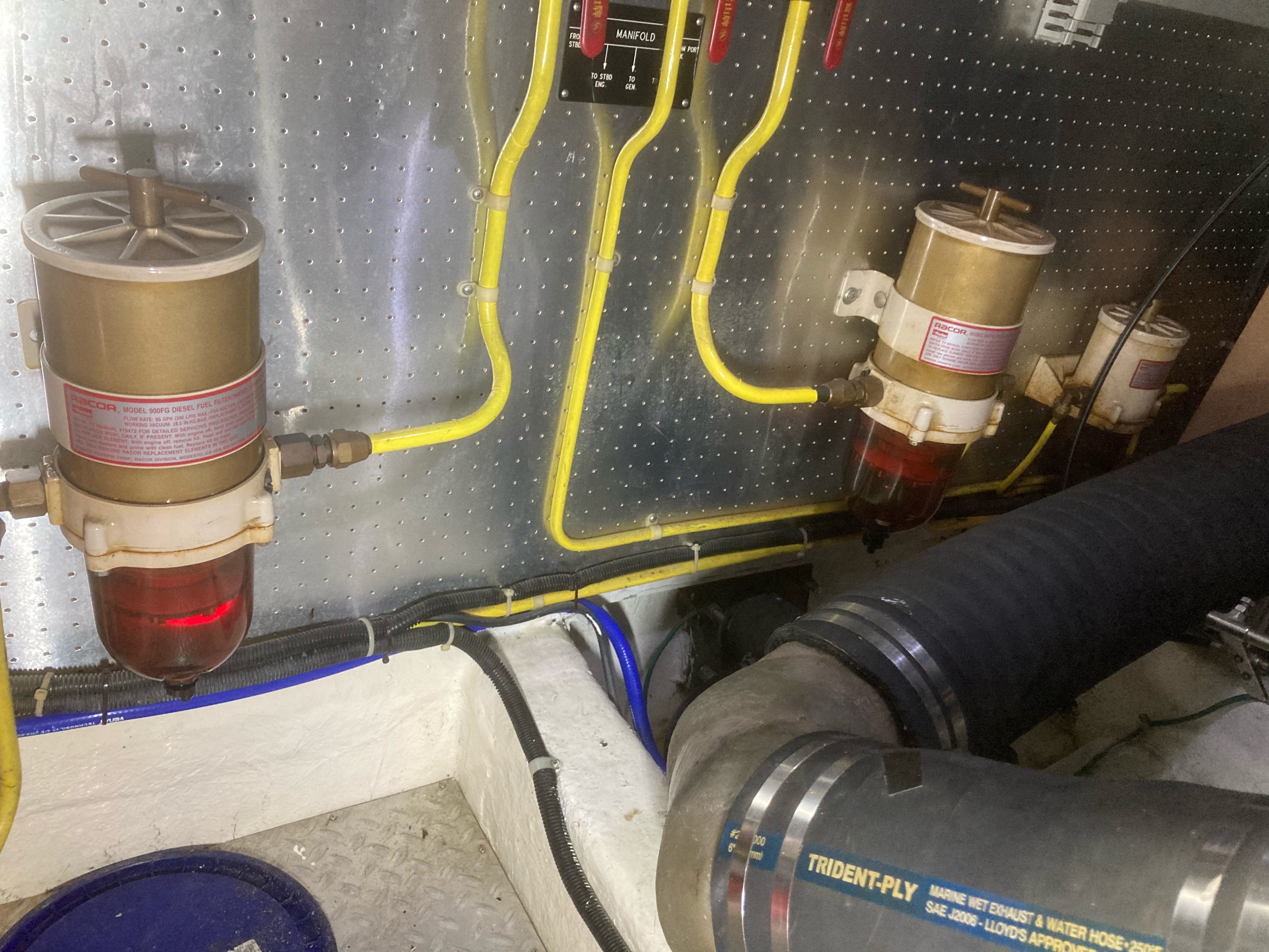 The item you see here is called a pig mat. Beneath each of WB’s engines a large pan resides to catch oil or anything else that might escape from an engine so as not to get in the bilge and get pumped overboard. In an effort to keep the engine room clean we line the pans with these pig mats. They are white. This one is pink. When red diesel fuel leaks on a white pig mat it shows up just like this. Uhhhh, leaking fuel is not a desireable condition. Unlike gasoline diesel fuel is quite difficult to ignite. Unless it is in a hot environment like an engine room where the point of ignition is raised. I discovered this after arriving at The Wharf Marina and commenced a search for the source of the fuel leak. On the side of each engine a rather large device called the after cooler hides a significant part of the engines. When I removed them this past winter to have them flushed I discovered there were primary fuel filters located behind the after coolers. Really can’t see ‘em unless you know they are there. On the bottom of these filters is a twist drain to bleed water out of the filter. Well I discovered this drain device was a bit loose. Tightened her up and all is good!