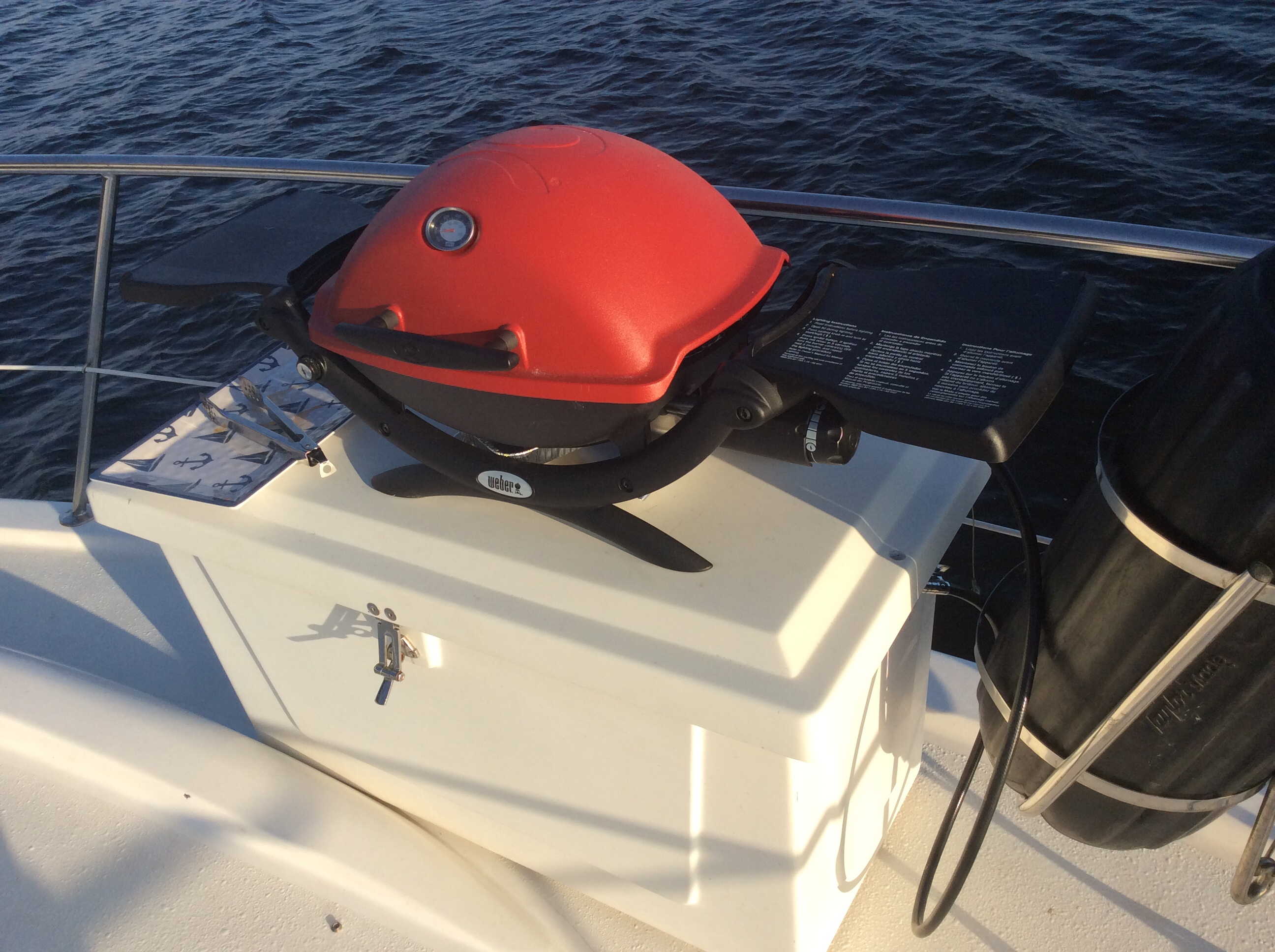 We just love our Weber Q grill. I installed a 20lb propane tank in the dock box and ran the hose to the grill through a hole in the side. If there is rain in the forcast it will use those little 1 lb. Coleman propane tanks and we cook on the aft deck.