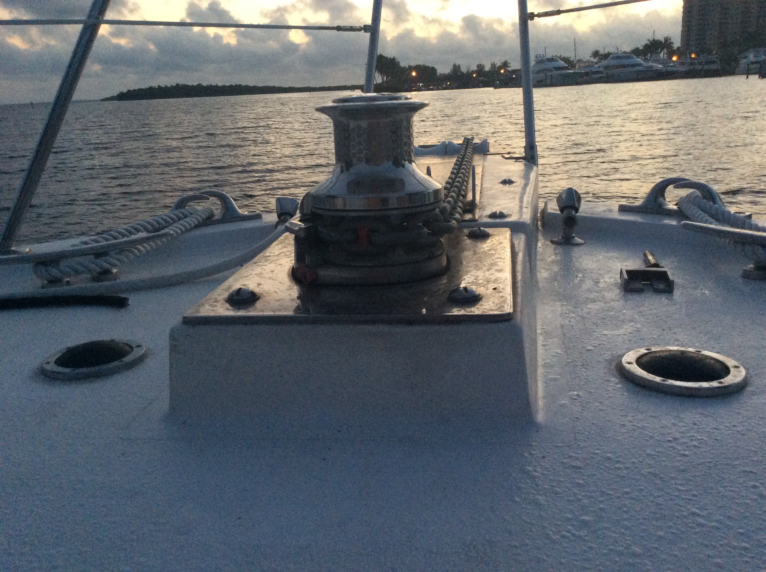 View from the windlass. Kinda cool how the chain links all line up. Do you have any idea how long it took me to get ‘em to do that? The large round black buttons are foot controls for lifting and lowering the anchor and chain.