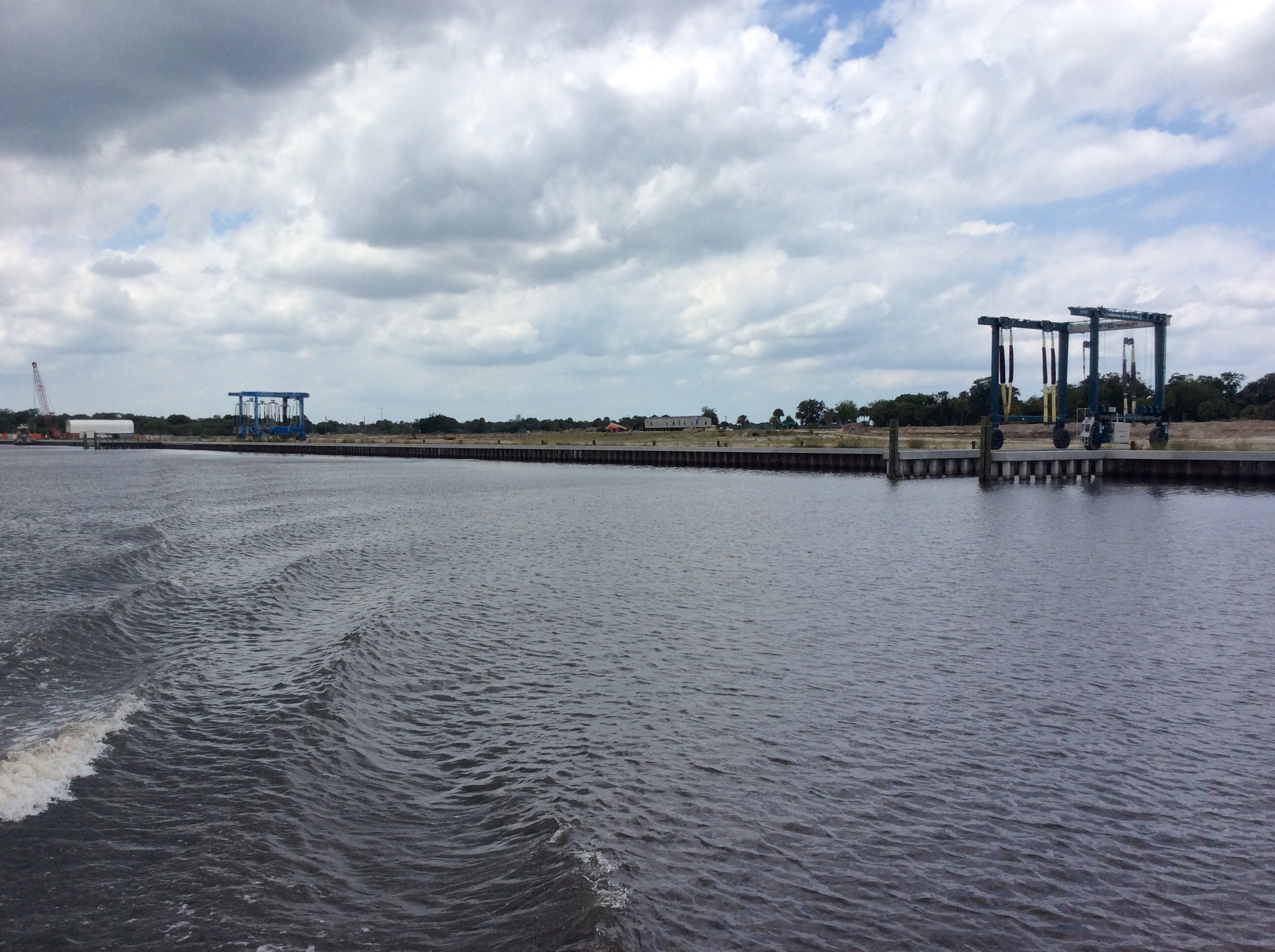 Once we crossed the lake there was a construction site with Travelifts. These ar large devices used to lift 30+feet and much larger boats out of the water. The one in the right of the photo is large enough for at least a 60 footer.