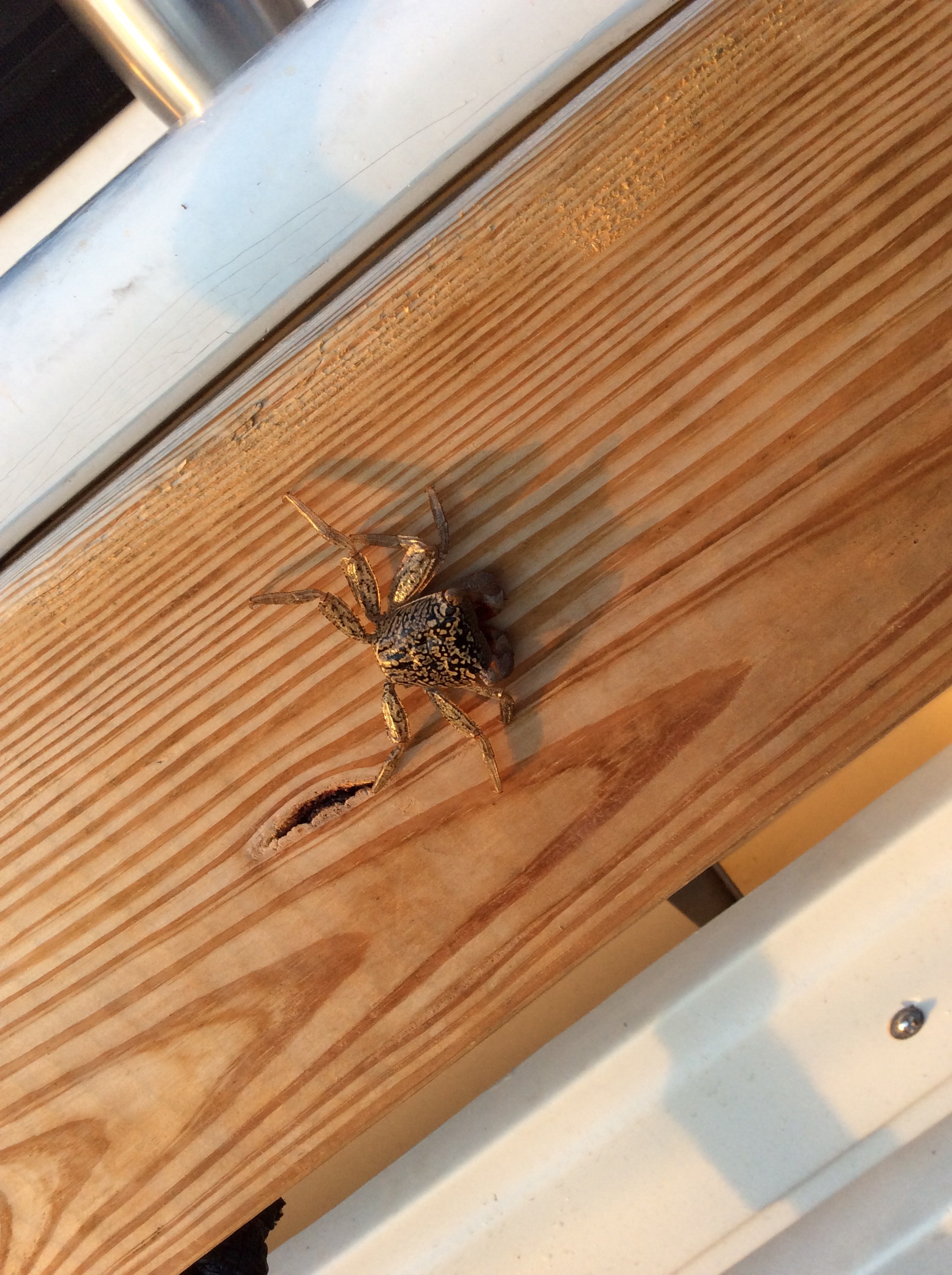 Woke up to find this guy on our fender board. If Debbie had seen him first she probably would have jumped ship! Don’t blame the little fella, small crabs are on the menu of lots of large fish.