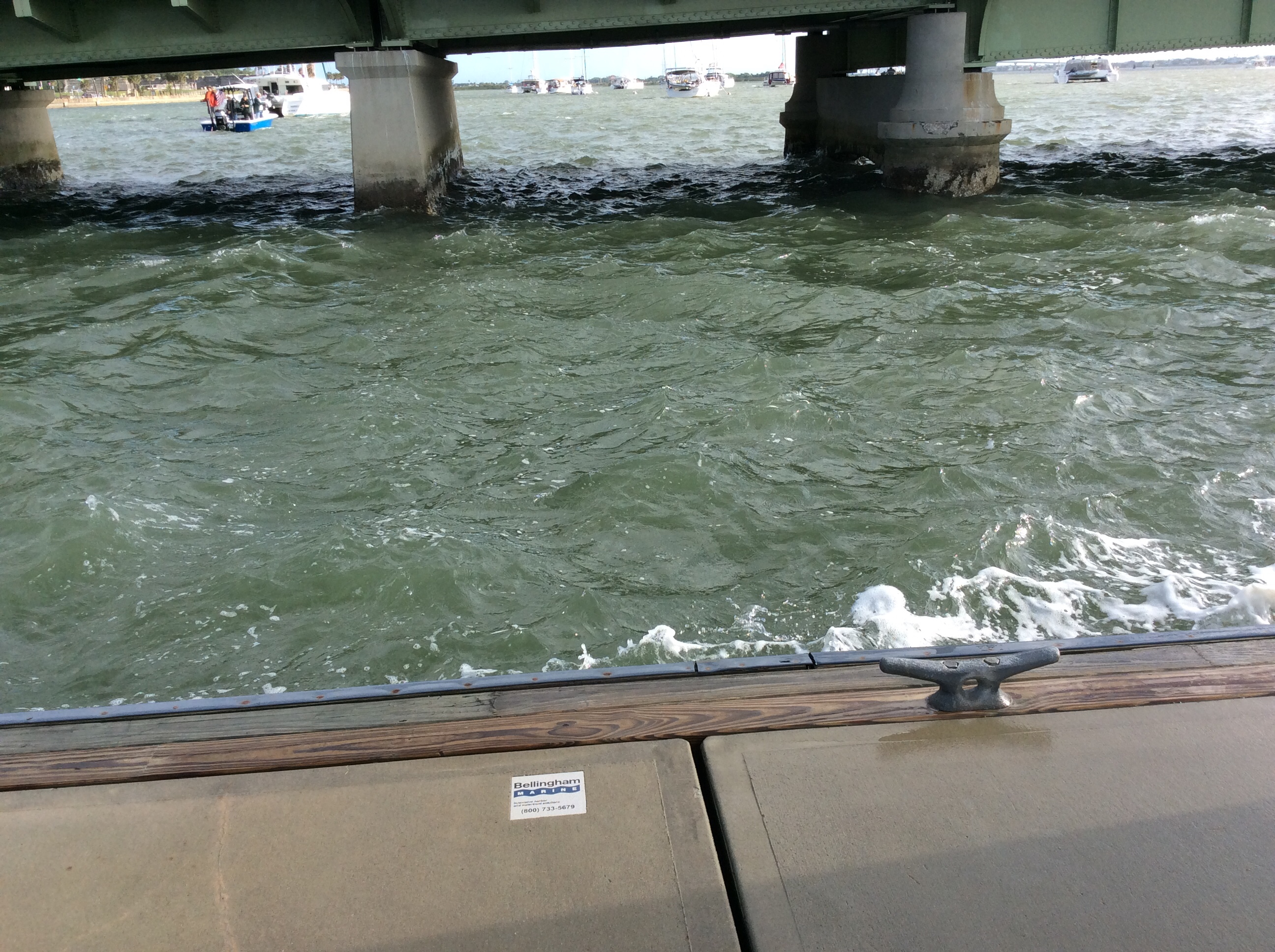 RYesterday on our way to St. A we had to traverse a couple of bridges that we could not squeeze under. Both times the bridge tenders opened the bridges immediately upon our call. That was great as sitting in a 10-15 mph wind is kinda tough since it can blow you into shallow water if ya don’t pay really close attention. Notice the left side of the bridge did not open? that side of the bridge was inoperable but plenty of room for the sail catamaran and Whisky Business to get through.