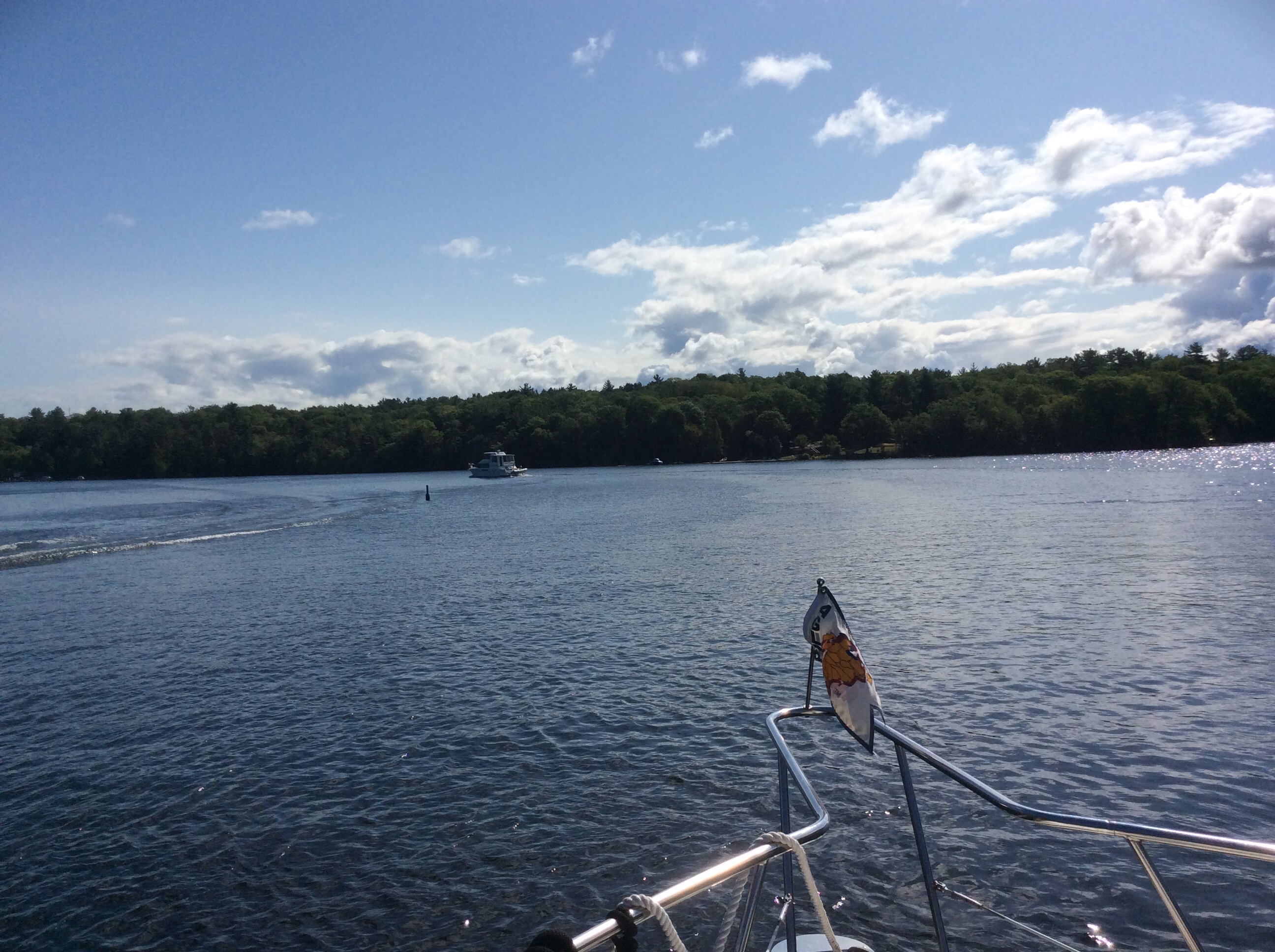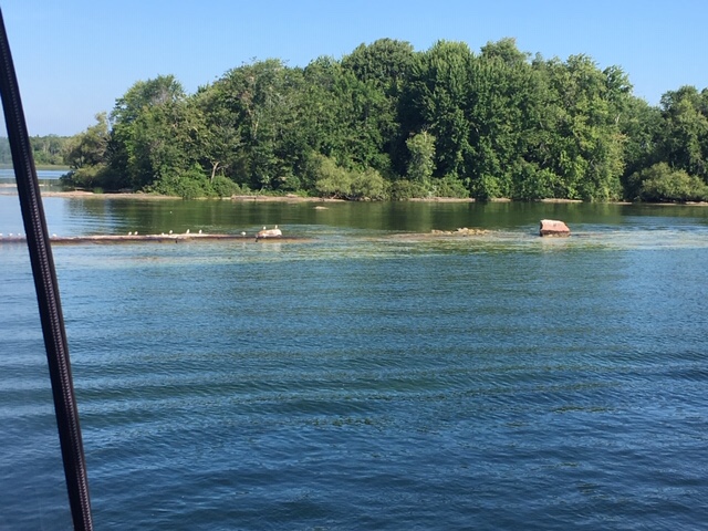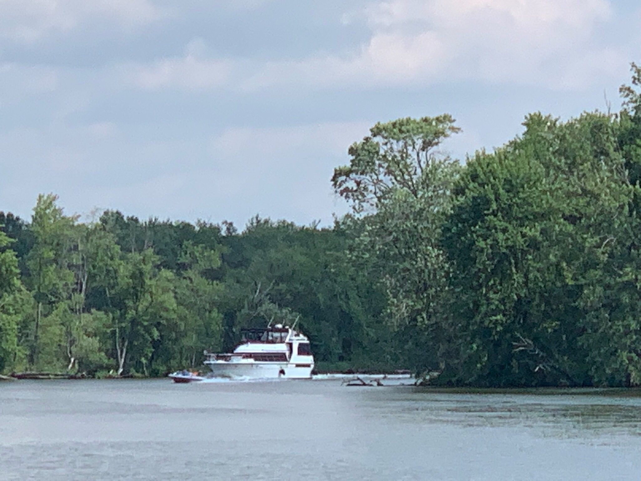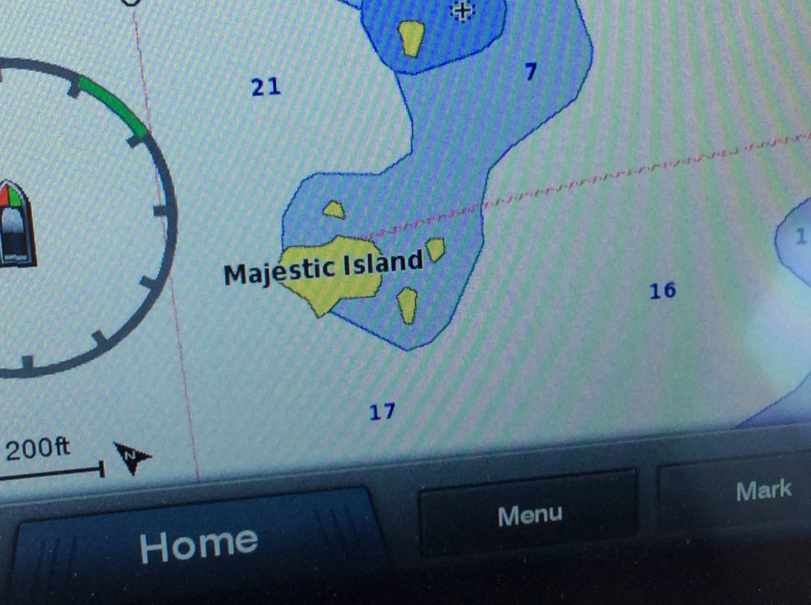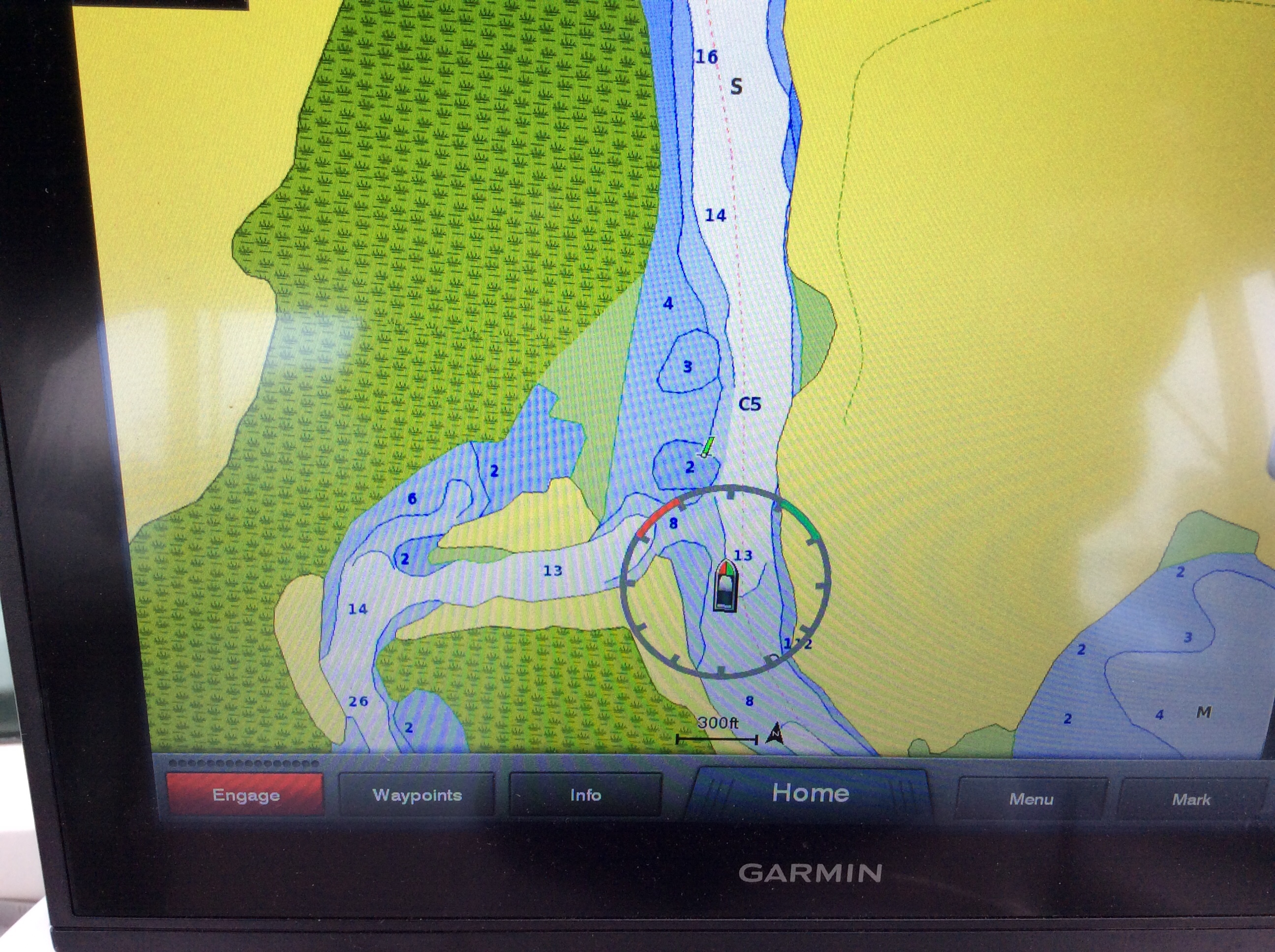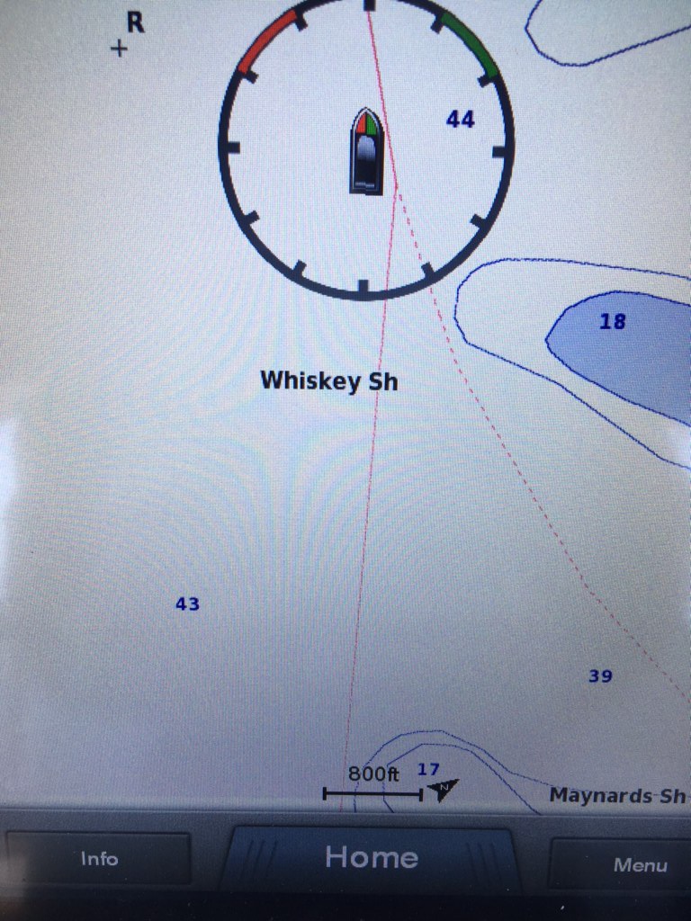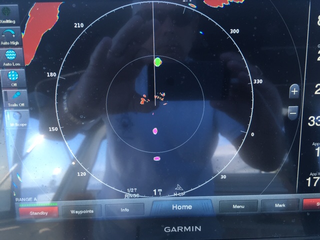 This is an image of our radar screen. Whisky Business’ location is at the bottom of the vertical white line. The large green blob is Golden Daze. It’s green because they are moving away from us at a faster speed. If we were moving faster and closing in on them, it would be red. Below the end of the white line in the center of the image you can see 2 red-ish blobs. Captains Dan and Sam were doing such a splendid job of matching WB’s warp like speed (that would be 9 MPH) that the doppler effect built in to our radar isn’t really sure if we are going faster or slower. Maybe fast-ish.