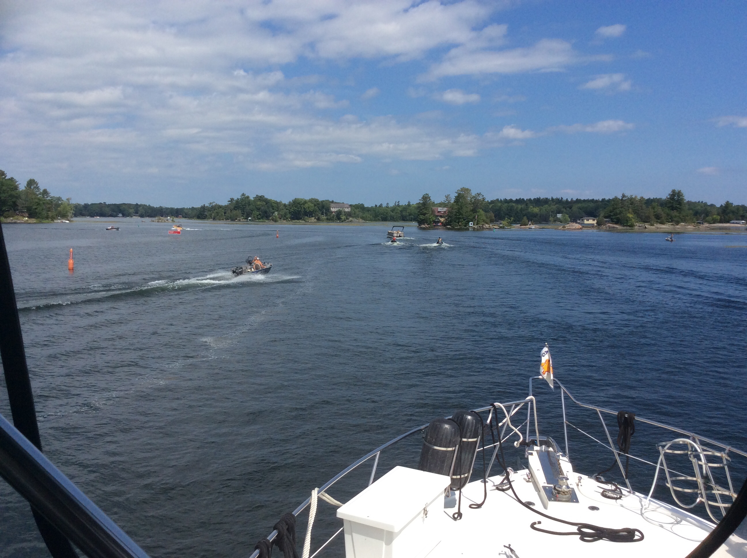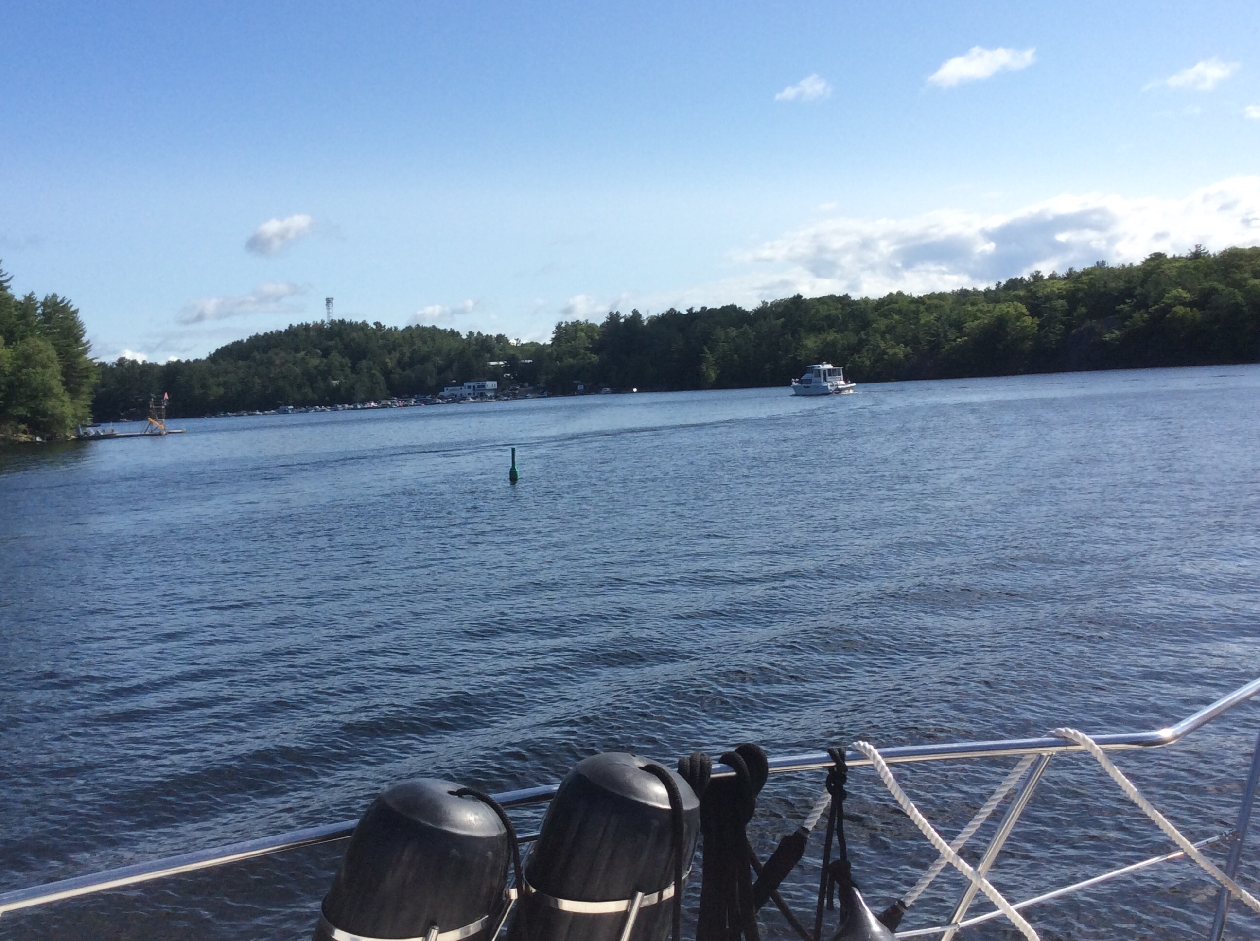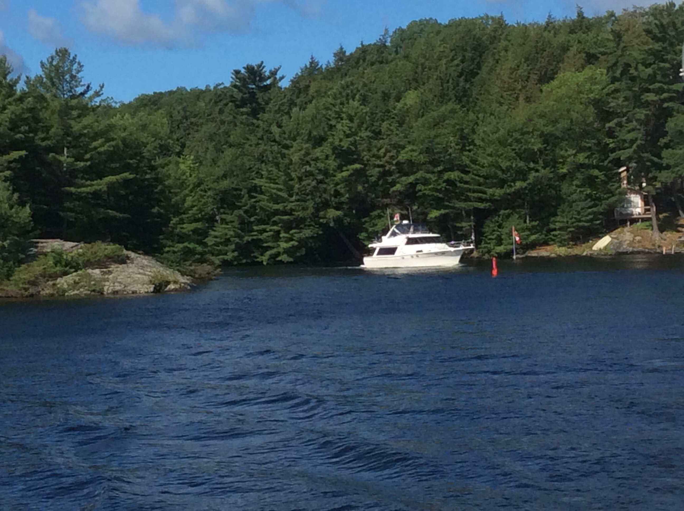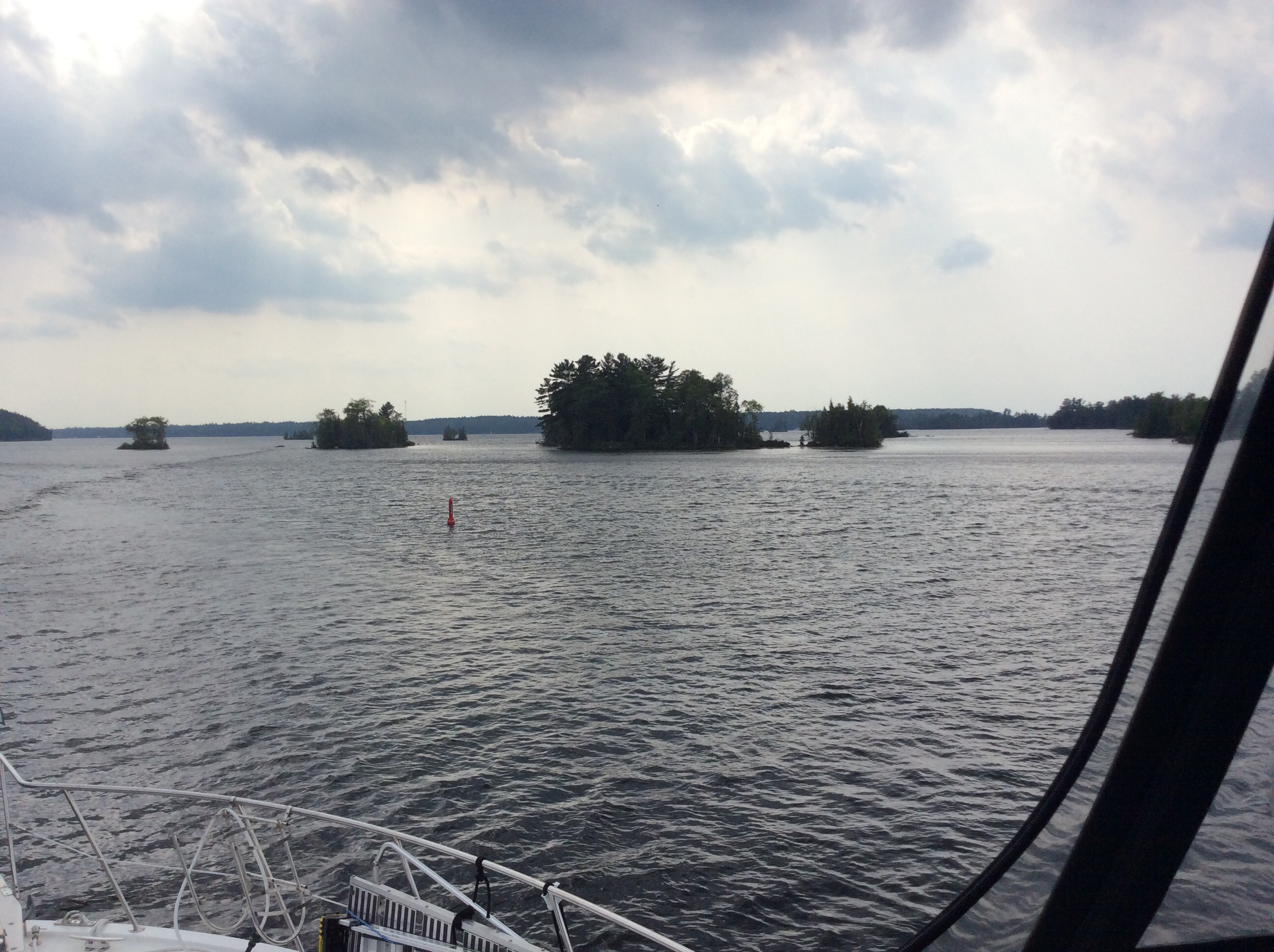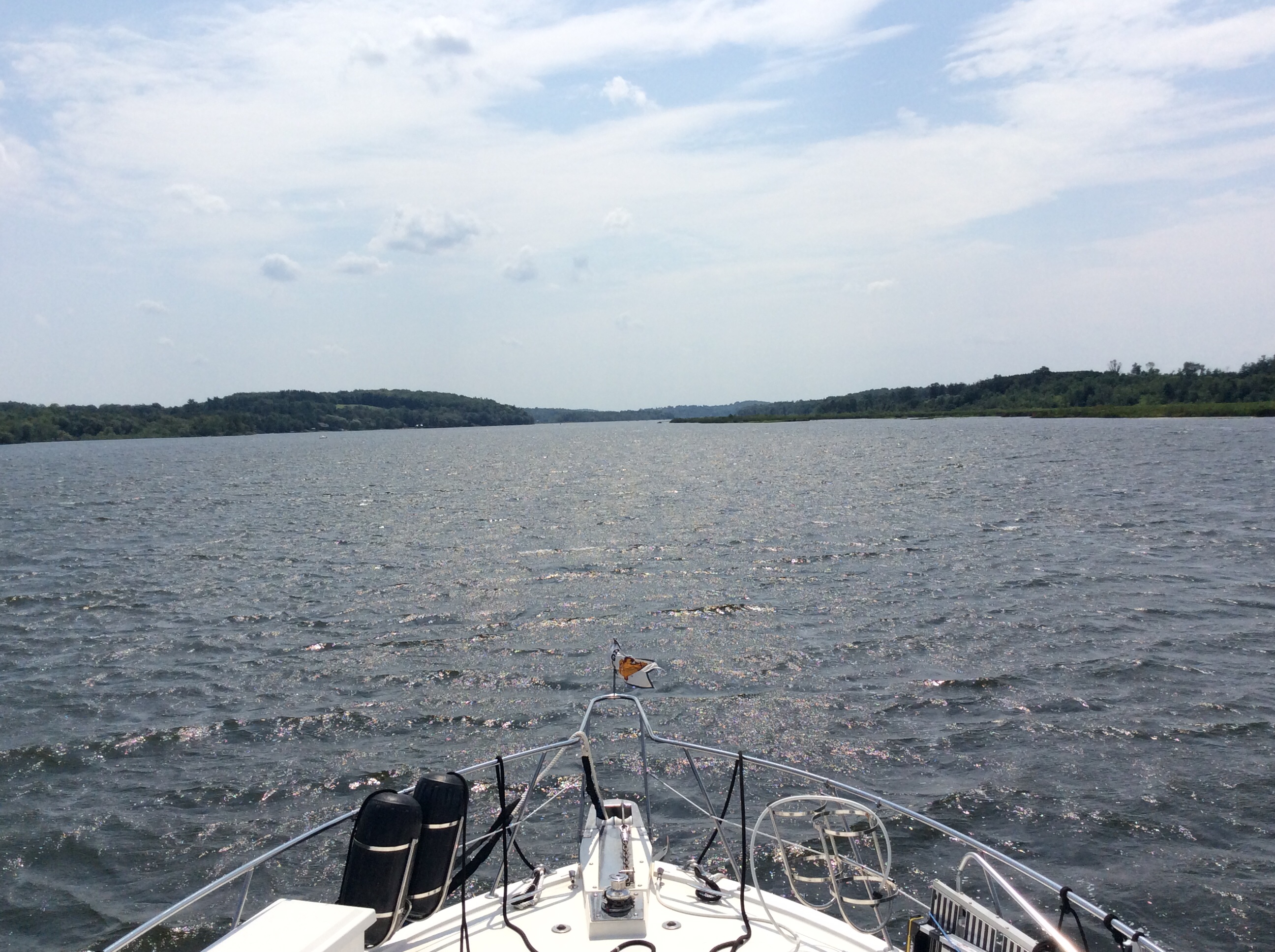 This is an image of our radar screen. Whisky Business’ location is at the bottom of the vertical white line. The large green blob is Golden Daze. It’s green because they are moving away from us at a faster speed. If we were moving faster and closing in on them, it would be red. Below the end of the white line in the center of the image you can see 2 red-ish blobs. Captains Dan and Sam were doing such a splendid job of matching WB’s warp like speed (that would be 9 MPH) that the doppler effect built in to our radar isn’t really sure if we are going faster or slower. Maybe fast-ish.