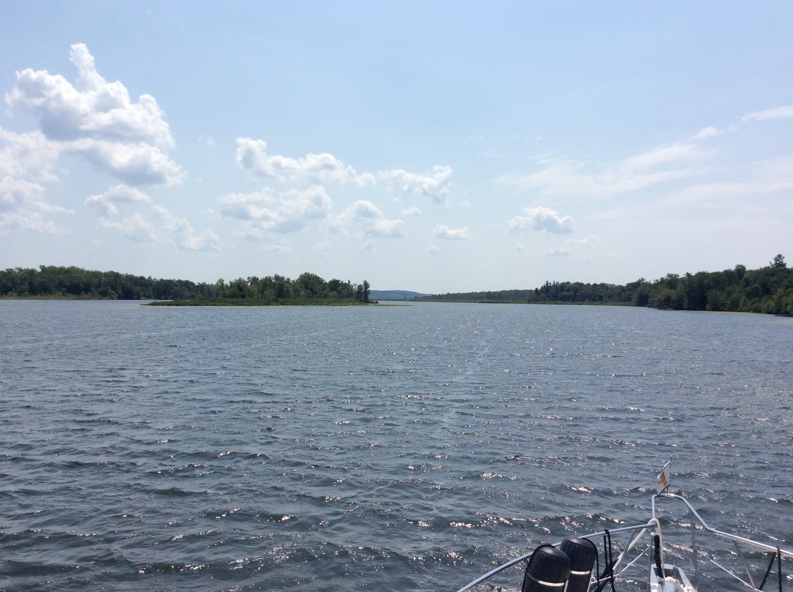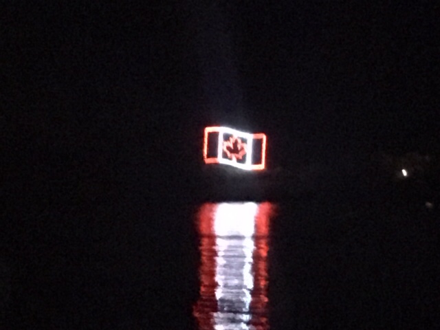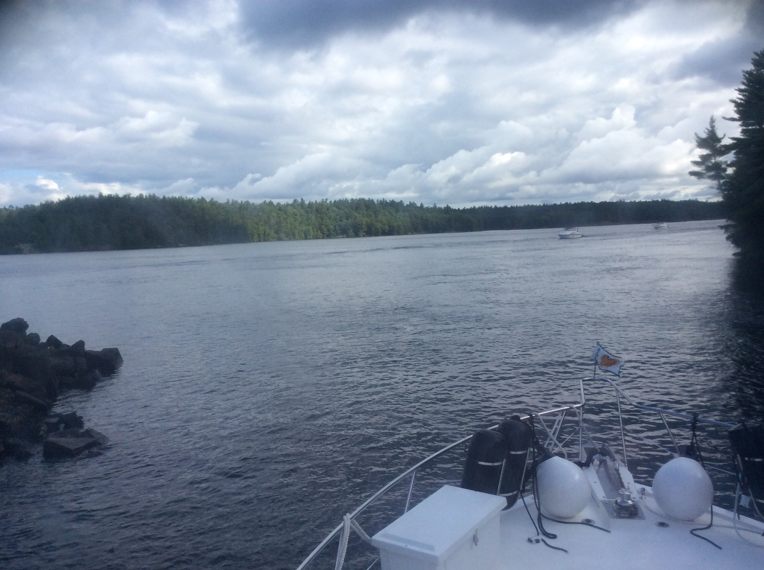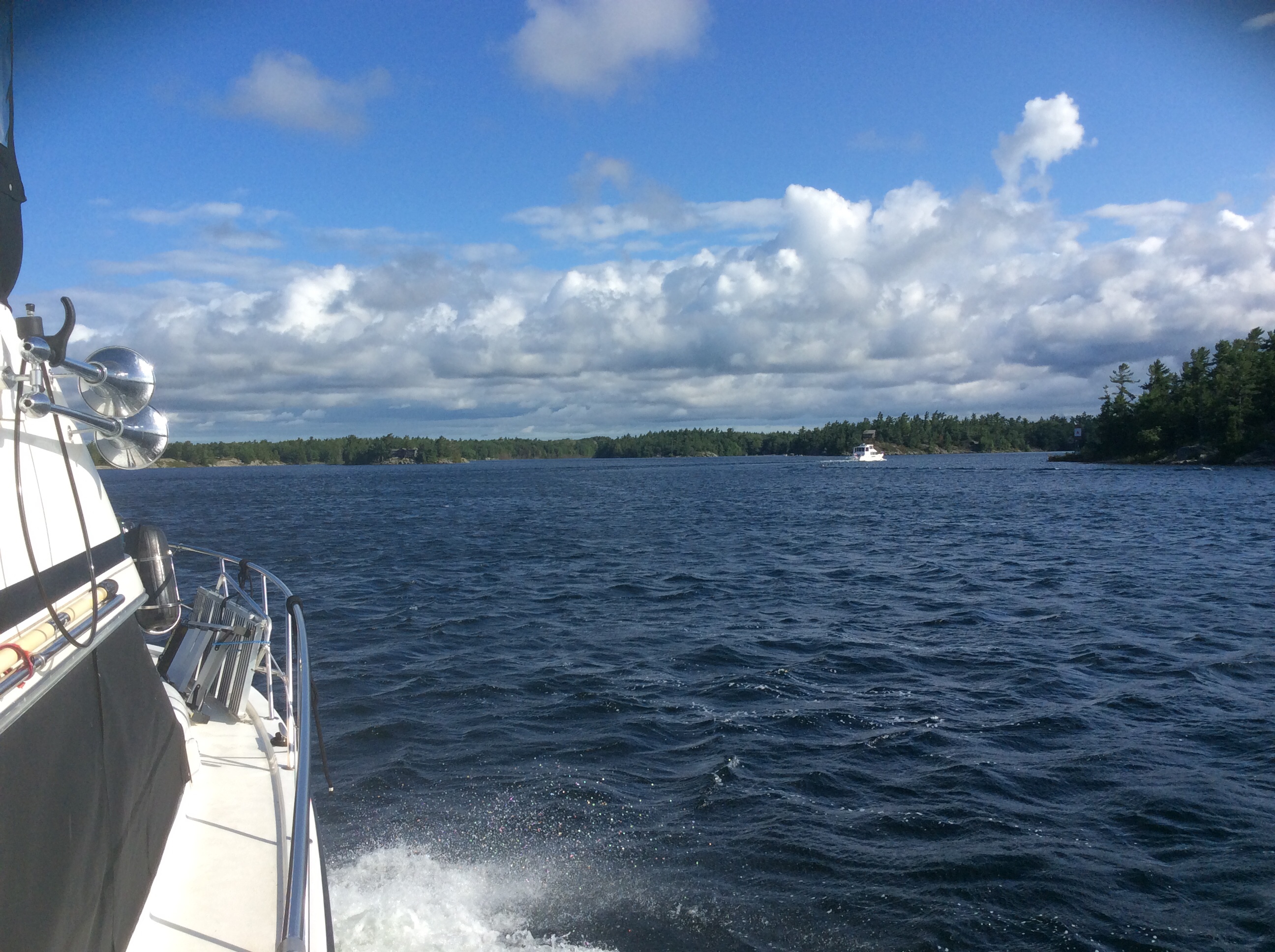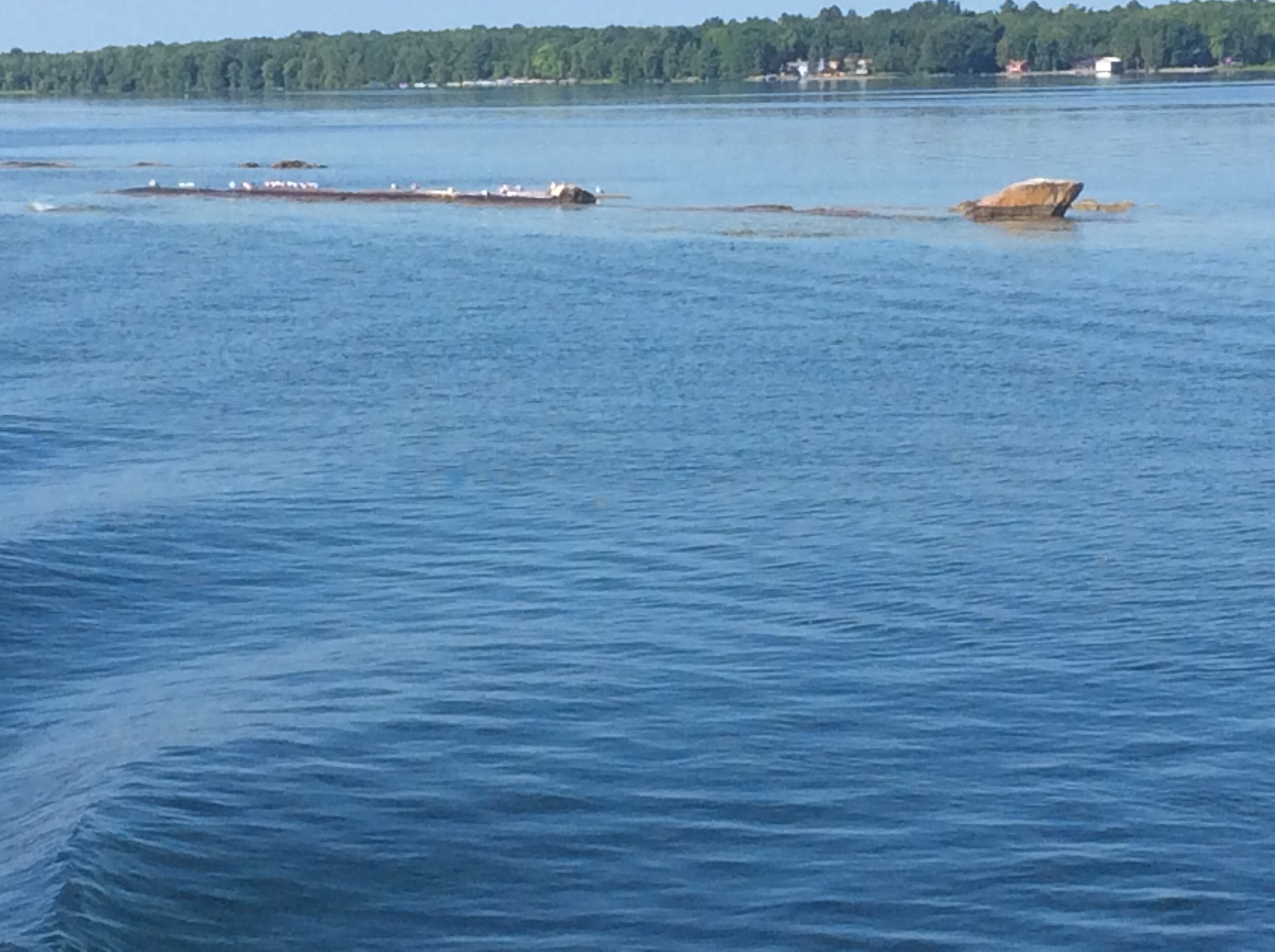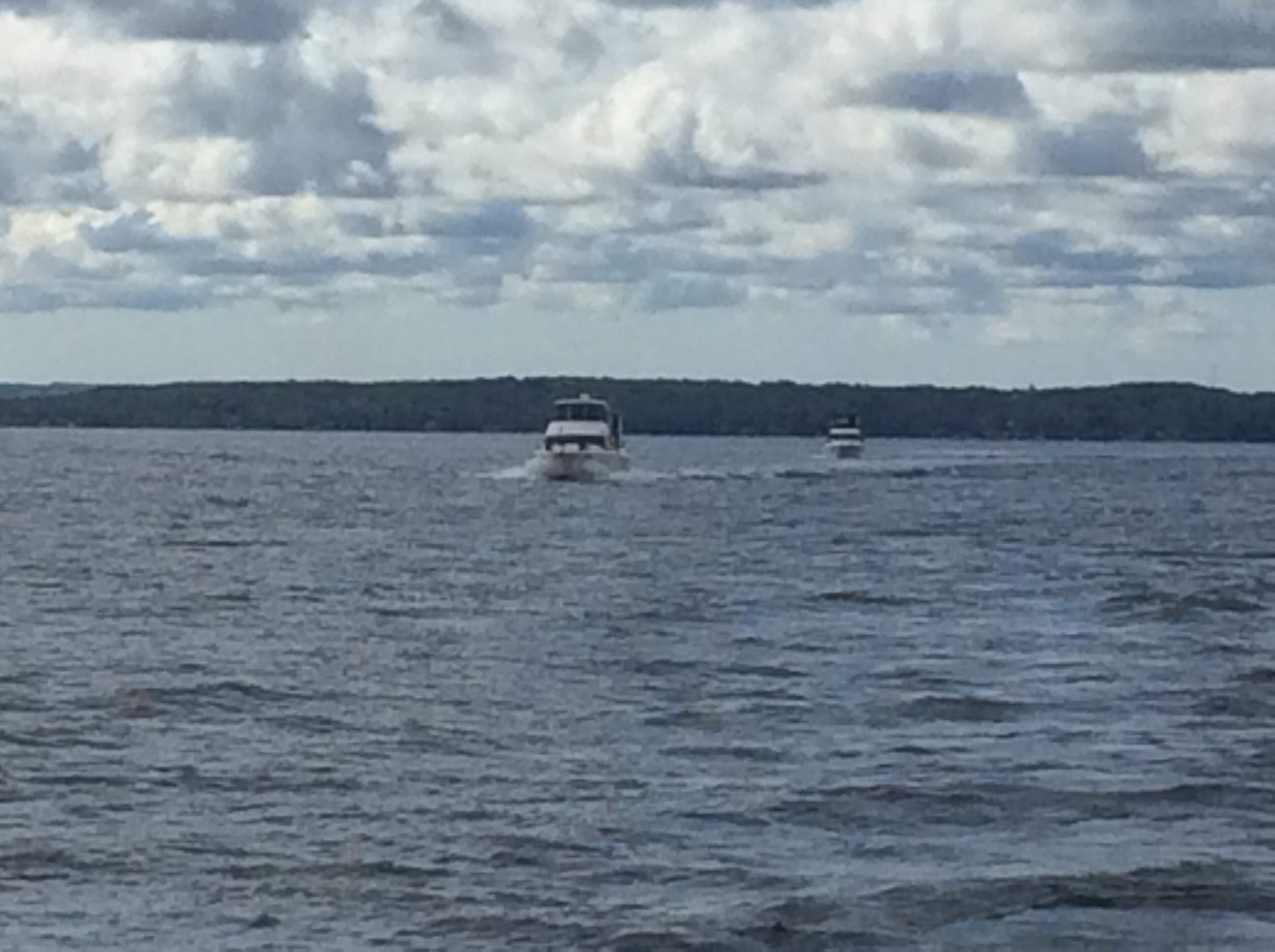 This is an image of our radar screen. Whisky Business’ location is at the bottom of the vertical white line. The large green blob is Golden Daze. It’s green because they are moving away from us at a faster speed. If we were moving faster and closing in on them, it would be red. Below the end of the white line in the center of the image you can see 2 red-ish blobs. Captains Dan and Sam were doing such a splendid job of matching WB’s warp like speed (that would be 9 MPH) that the doppler effect built in to our radar isn’t really sure if we are going faster or slower. Maybe fast-ish.