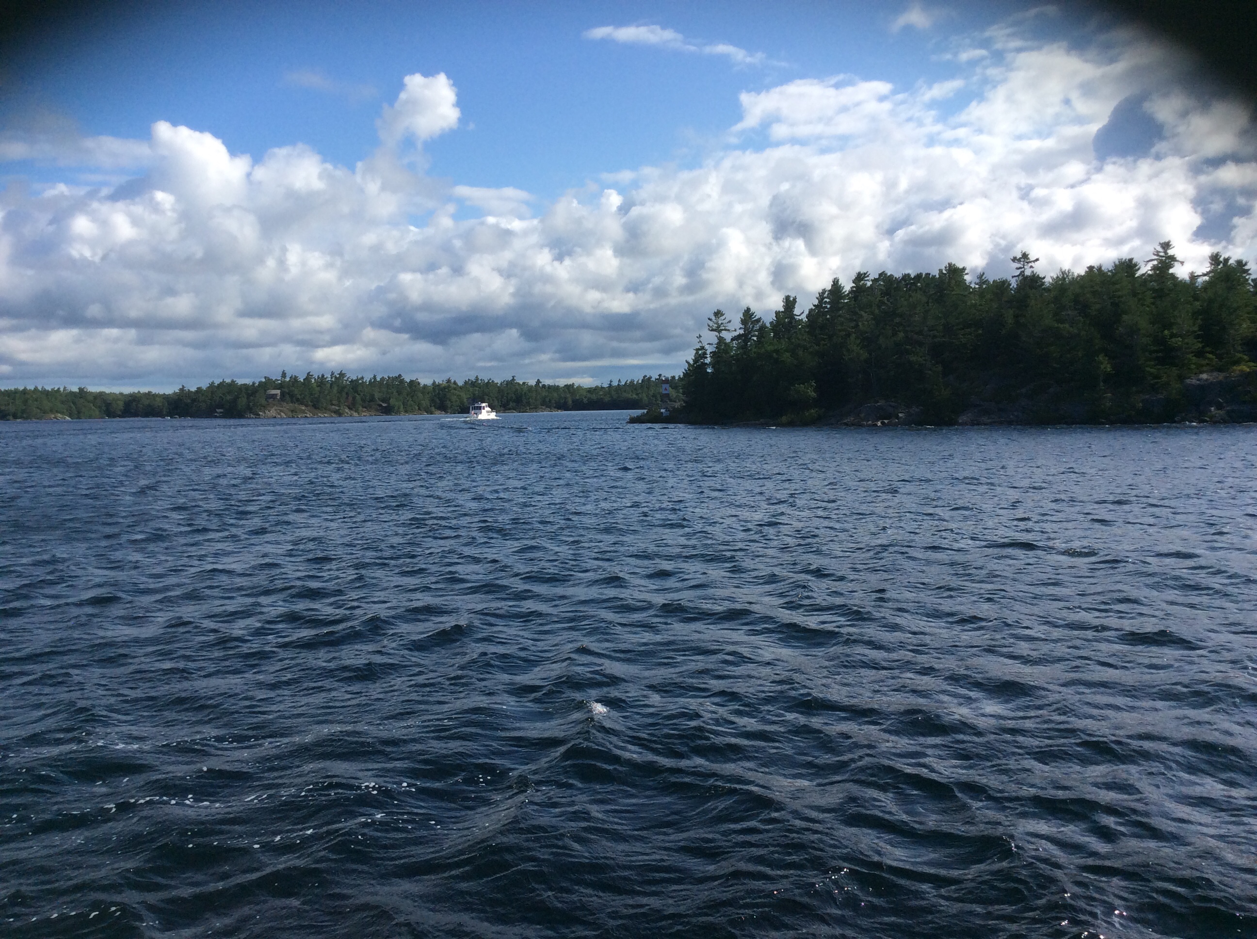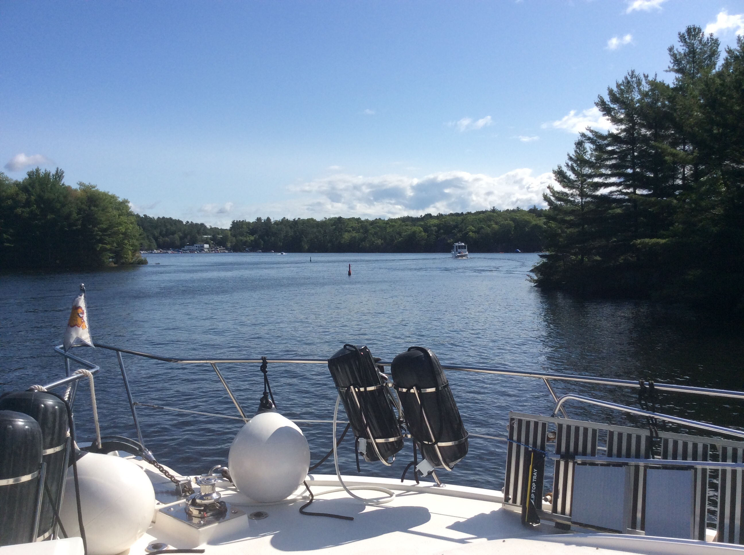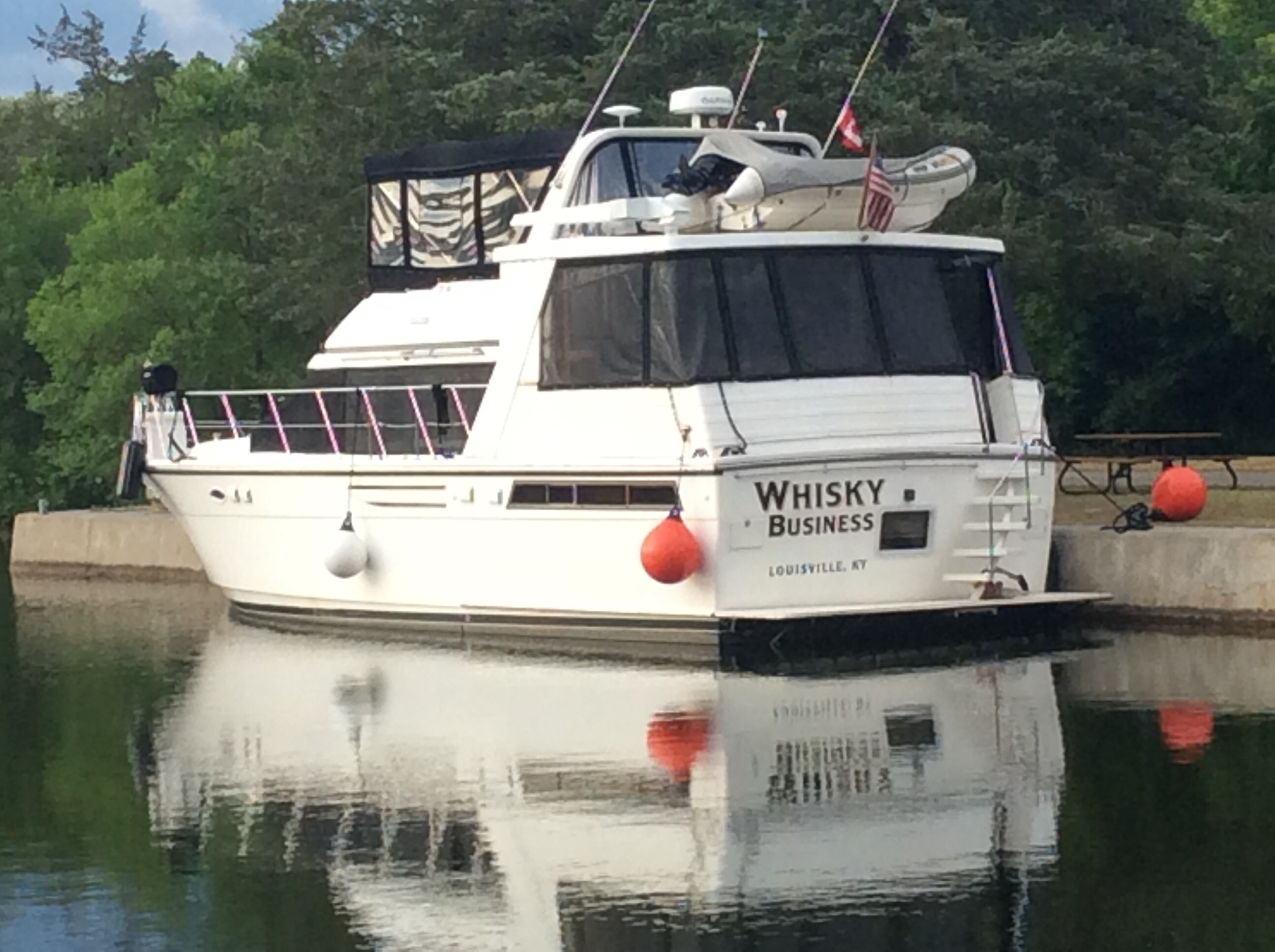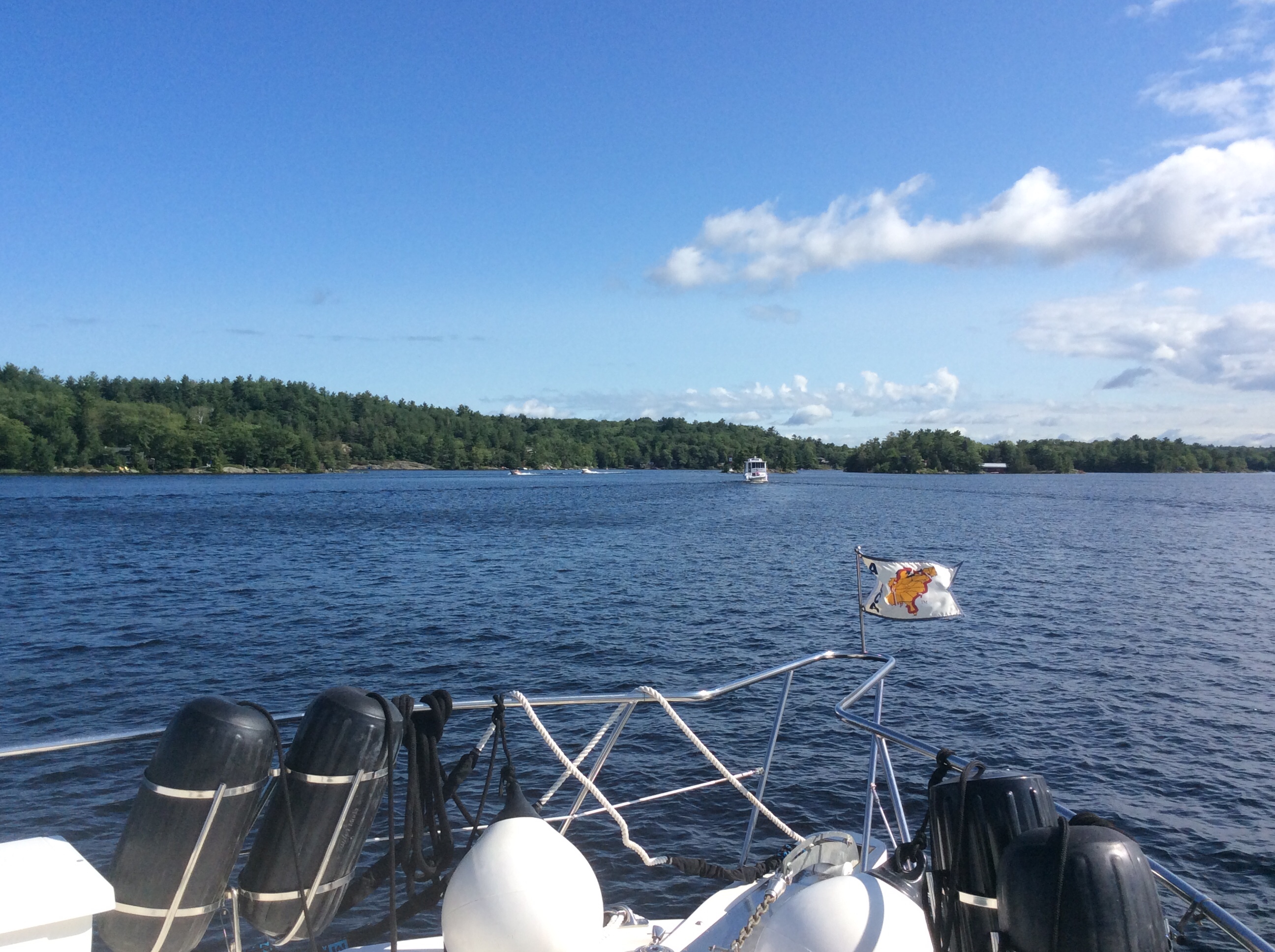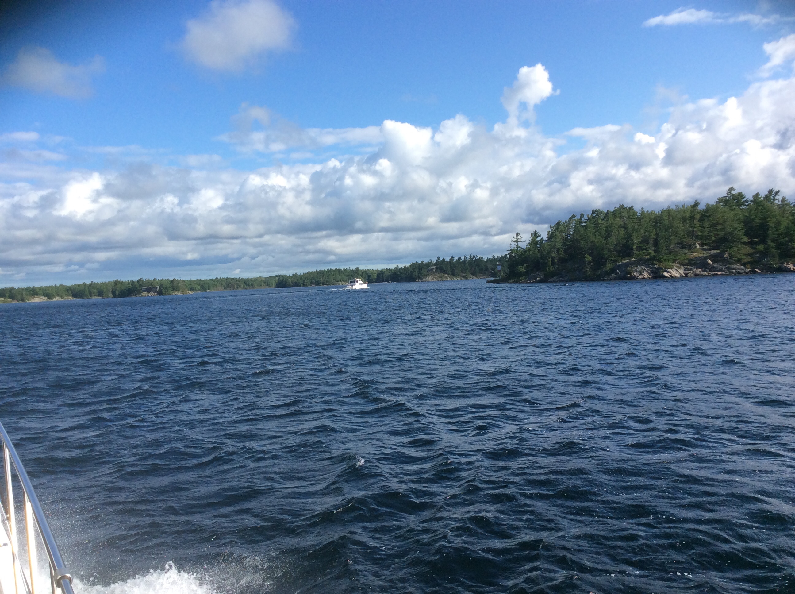 This is an image of our radar screen. Whisky Business’ location is at the bottom of the vertical white line. The large green blob is Golden Daze. It’s green because they are moving away from us at a faster speed. If we were moving faster and closing in on them, it would be red. Below the end of the white line in the center of the image you can see 2 red-ish blobs. Captains Dan and Sam were doing such a splendid job of matching WB’s warp like speed (that would be 9 MPH) that the doppler effect built in to our radar isn’t really sure if we are going faster or slower. Maybe fast-ish.