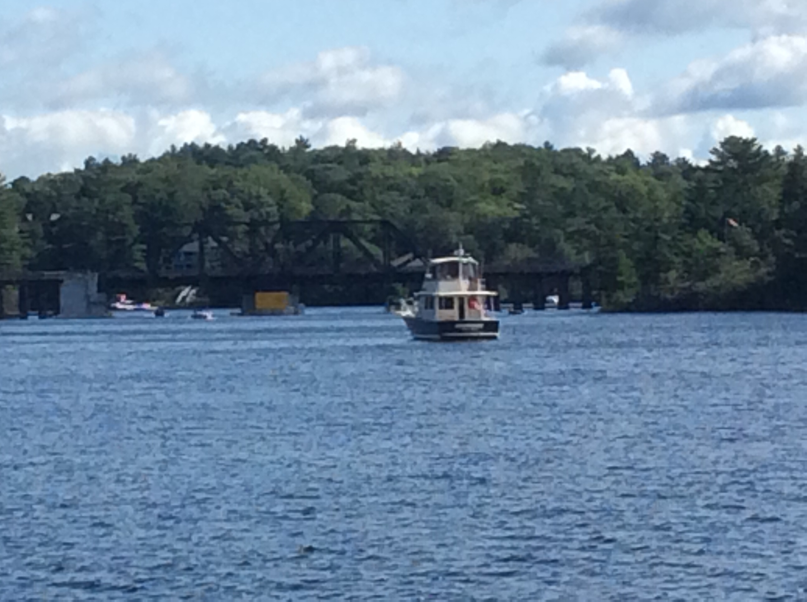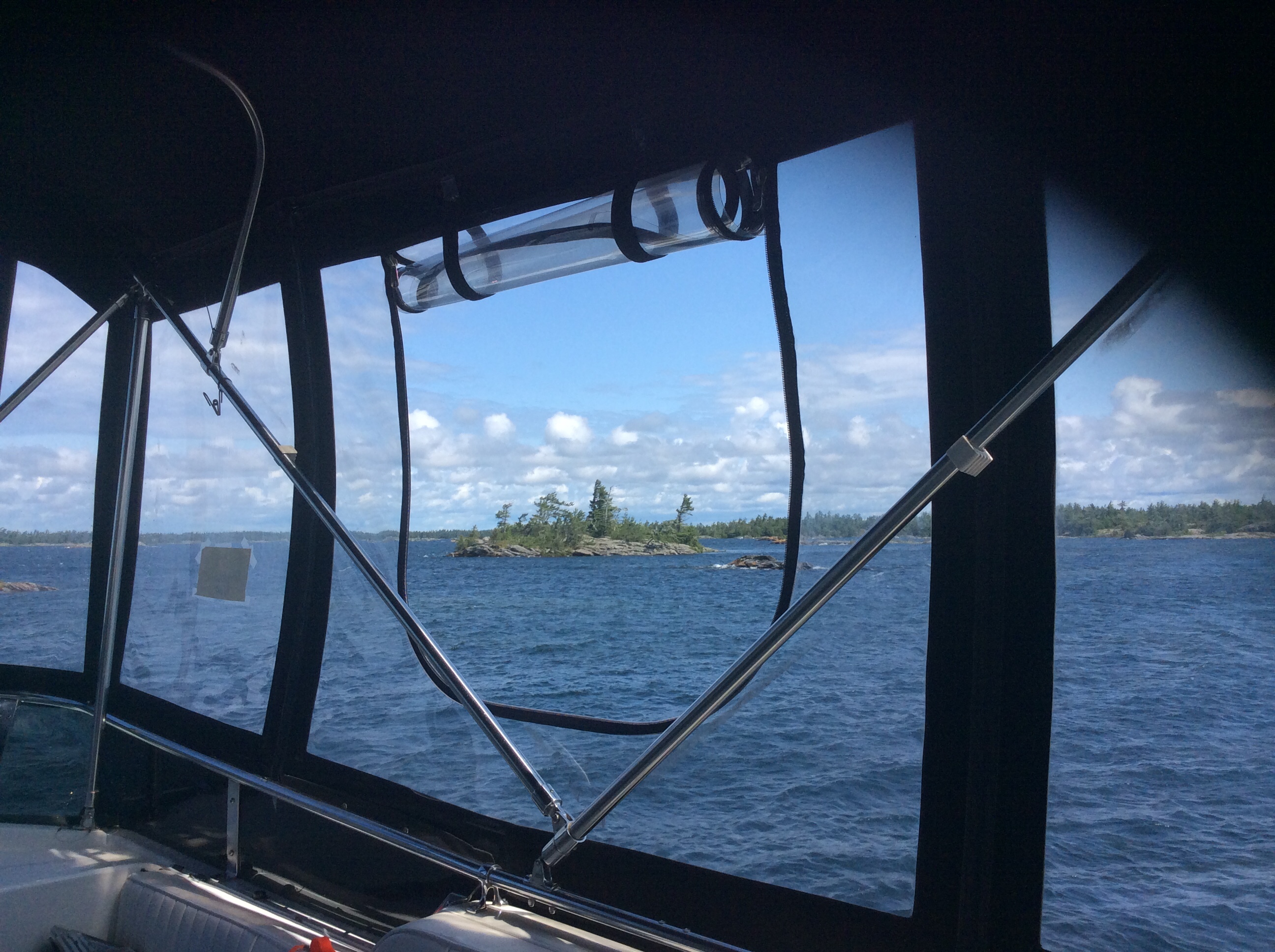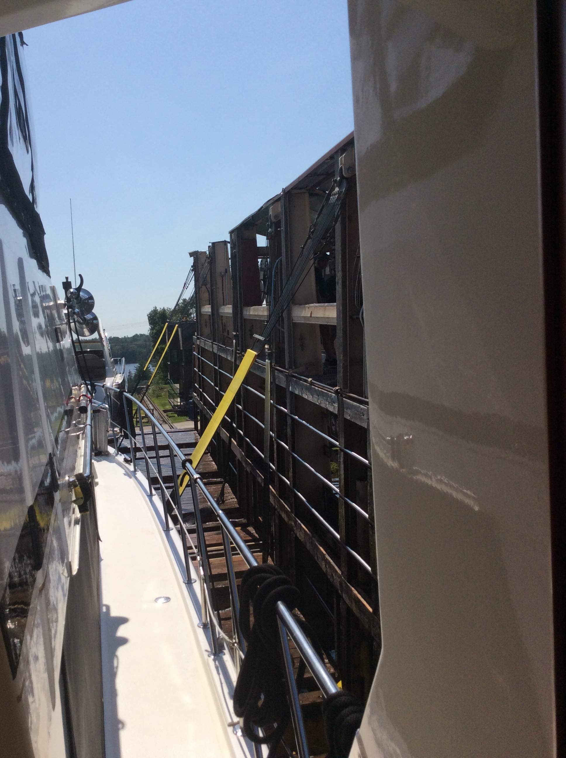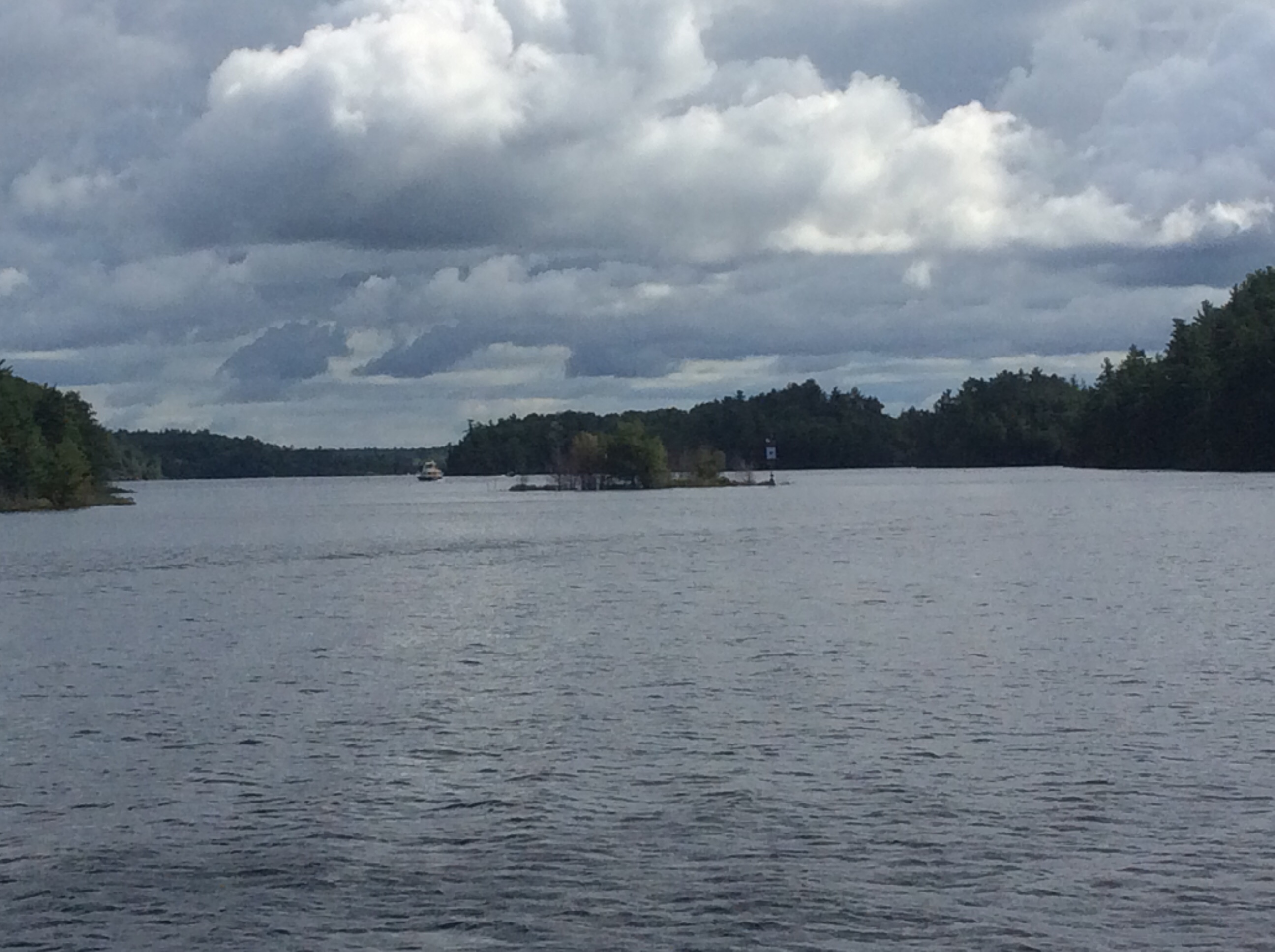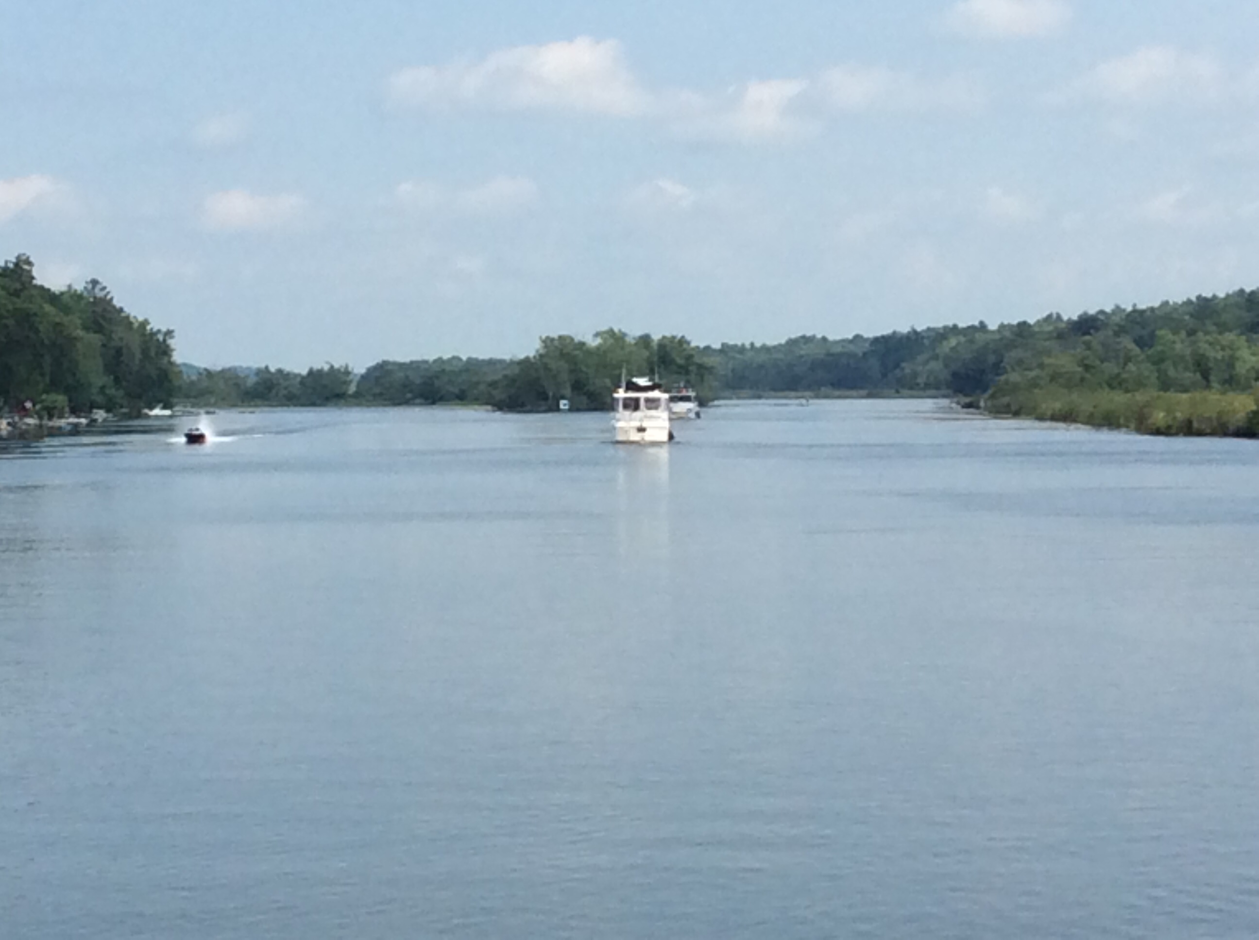 This is an image of our radar screen. Whisky Business’ location is at the bottom of the vertical white line. The large green blob is Golden Daze. It’s green because they are moving away from us at a faster speed. If we were moving faster and closing in on them, it would be red. Below the end of the white line in the center of the image you can see 2 red-ish blobs. Captains Dan and Sam were doing such a splendid job of matching WB’s warp like speed (that would be 9 MPH) that the doppler effect built in to our radar isn’t really sure if we are going faster or slower. Maybe fast-ish.