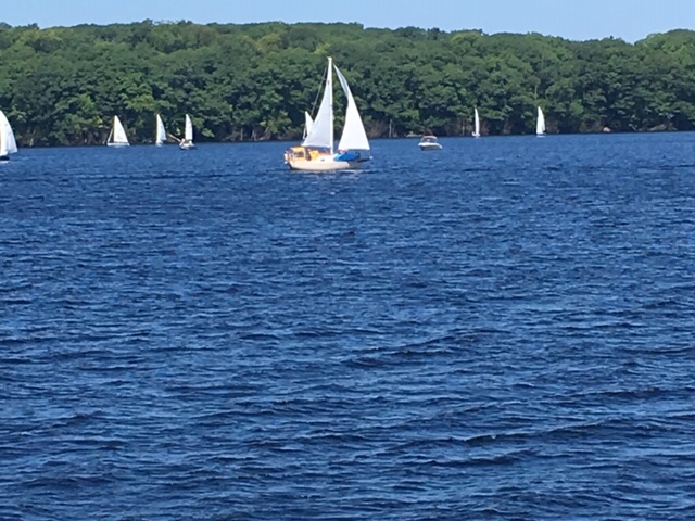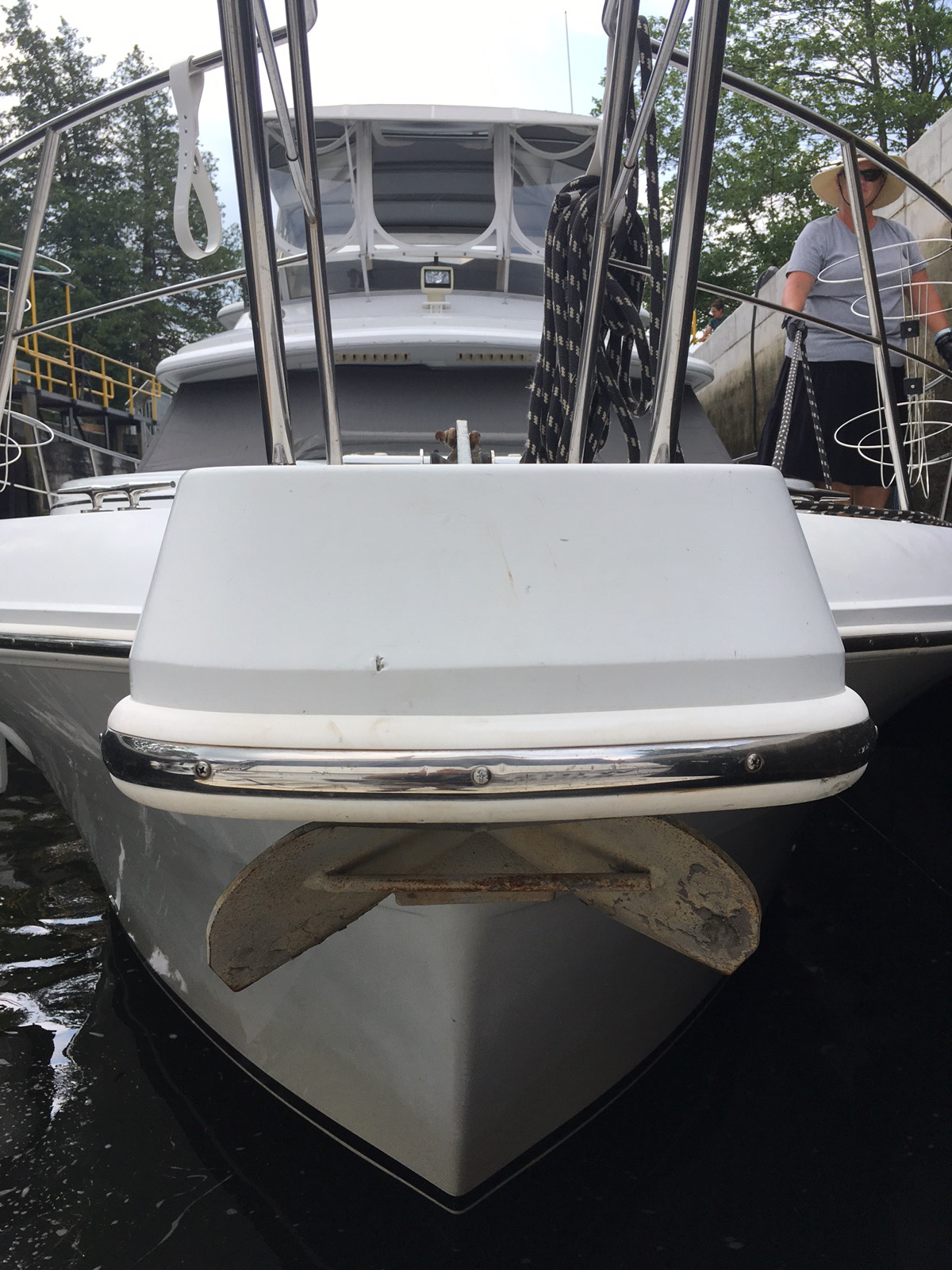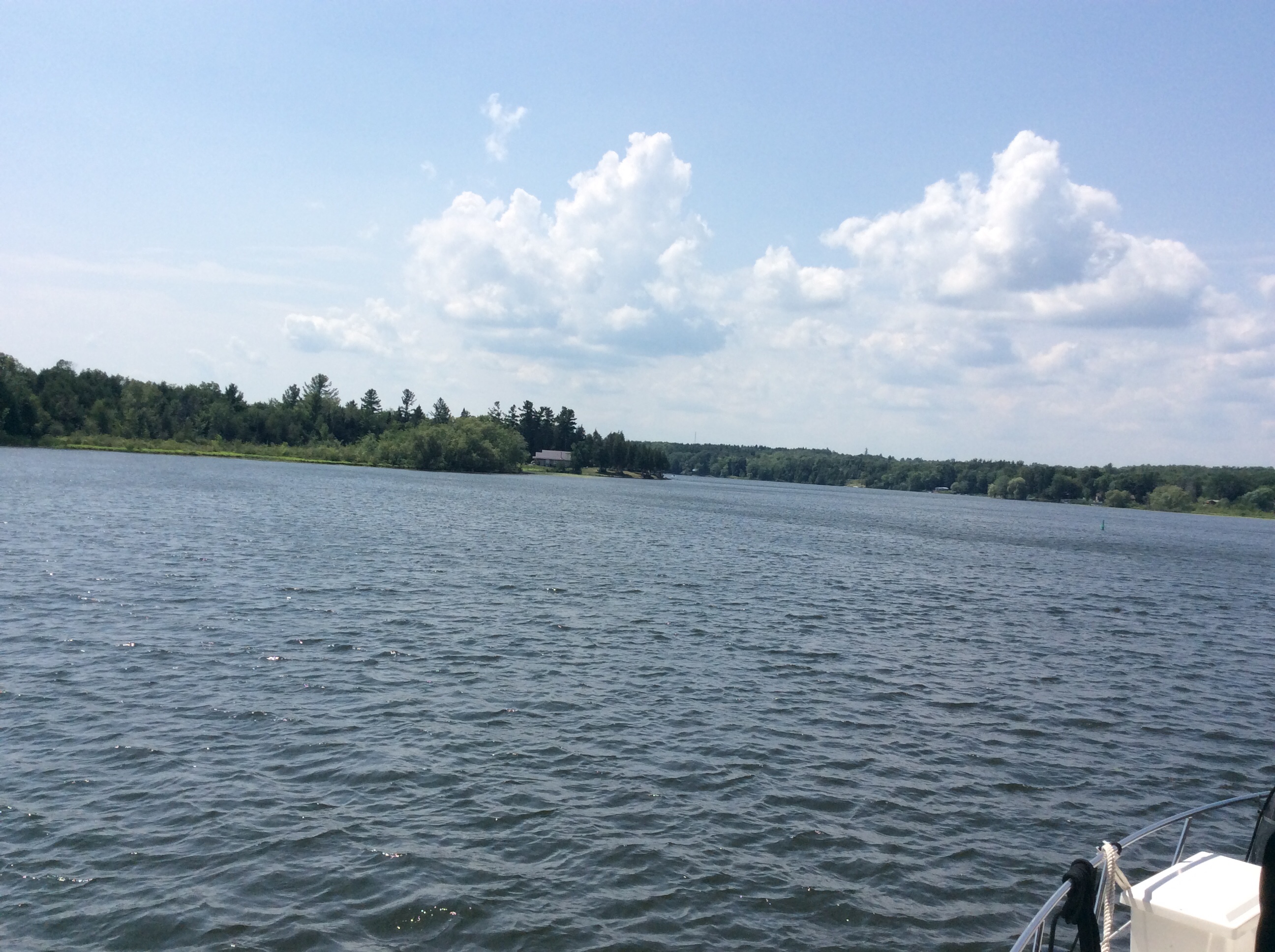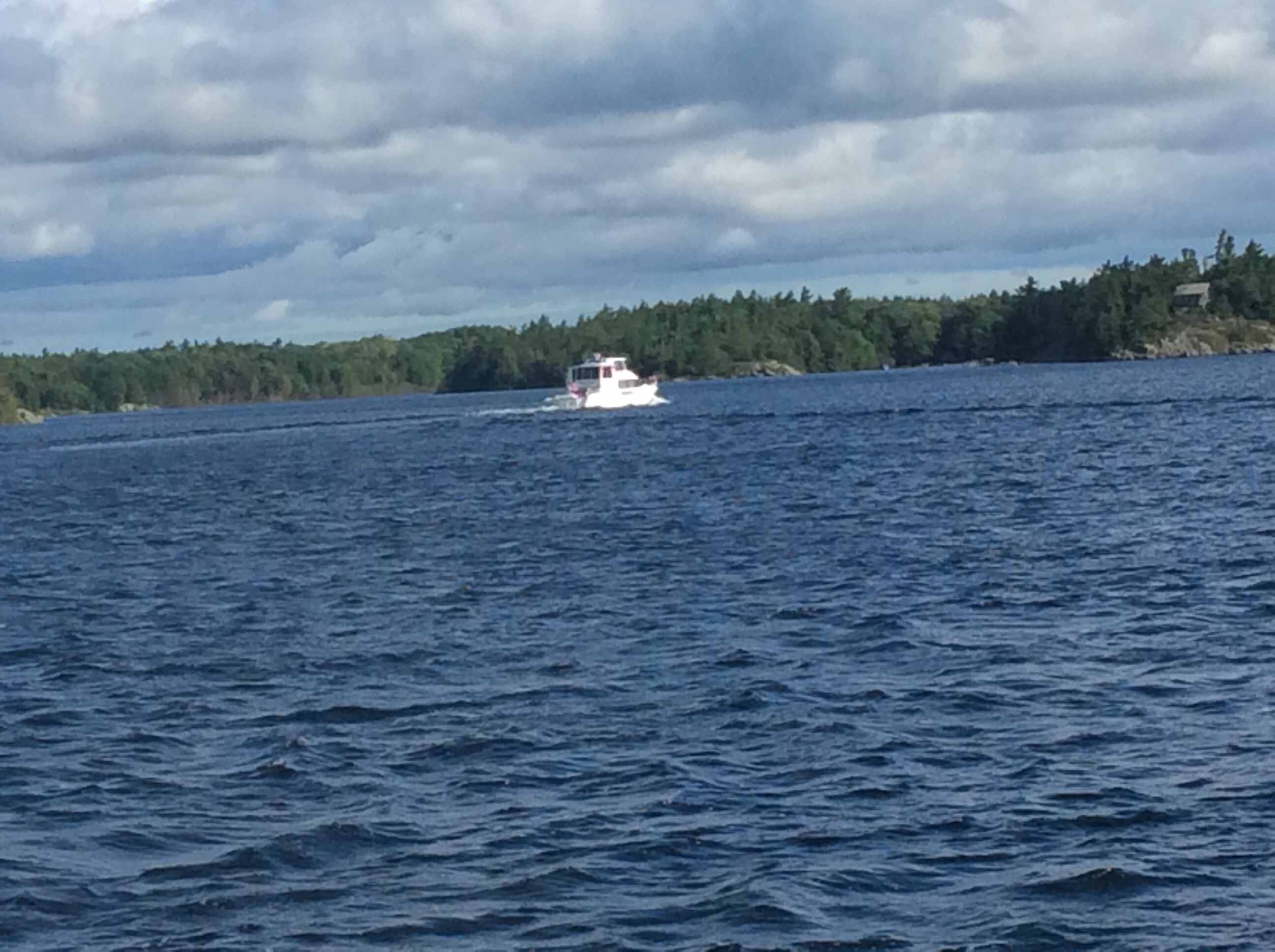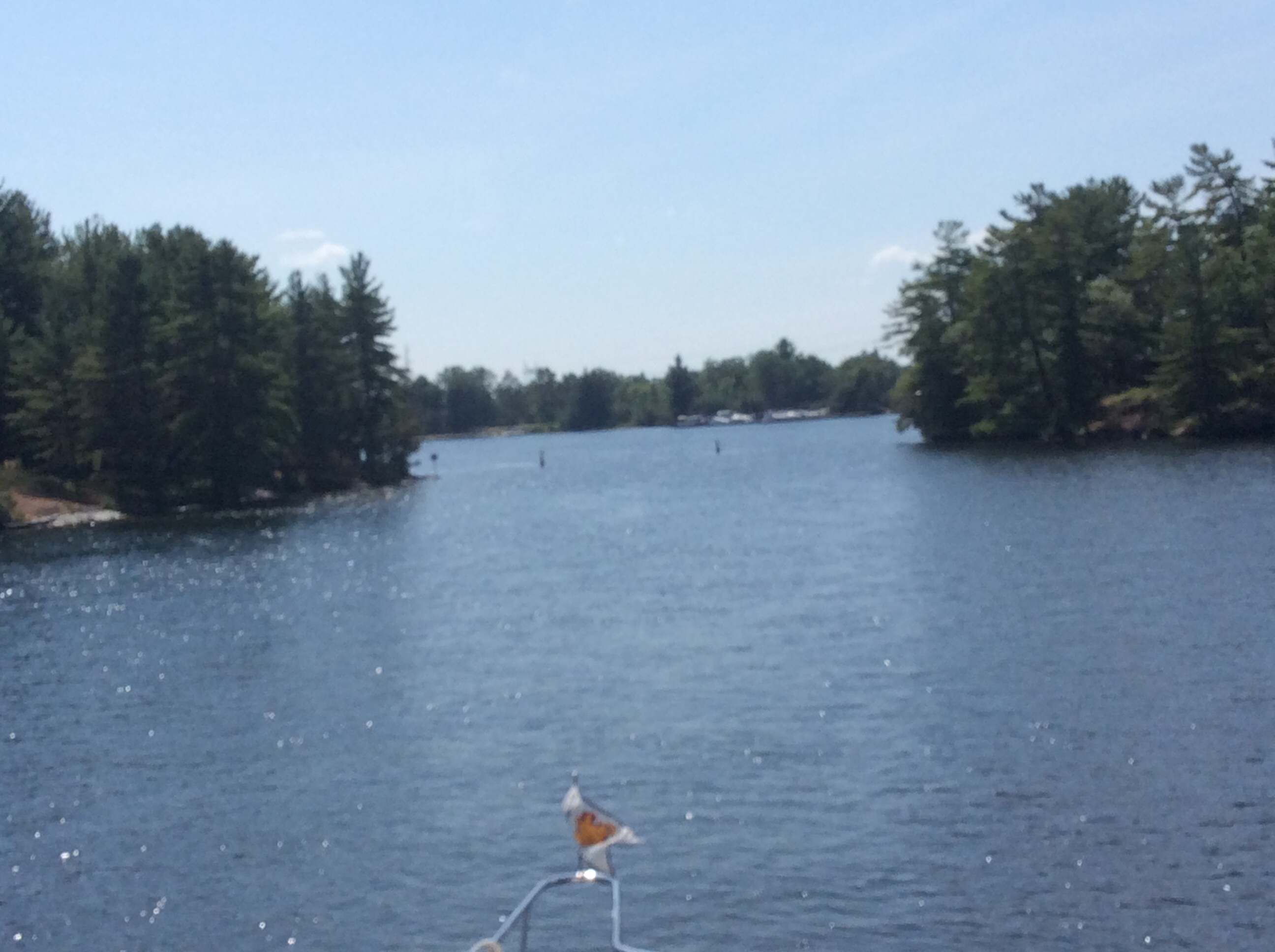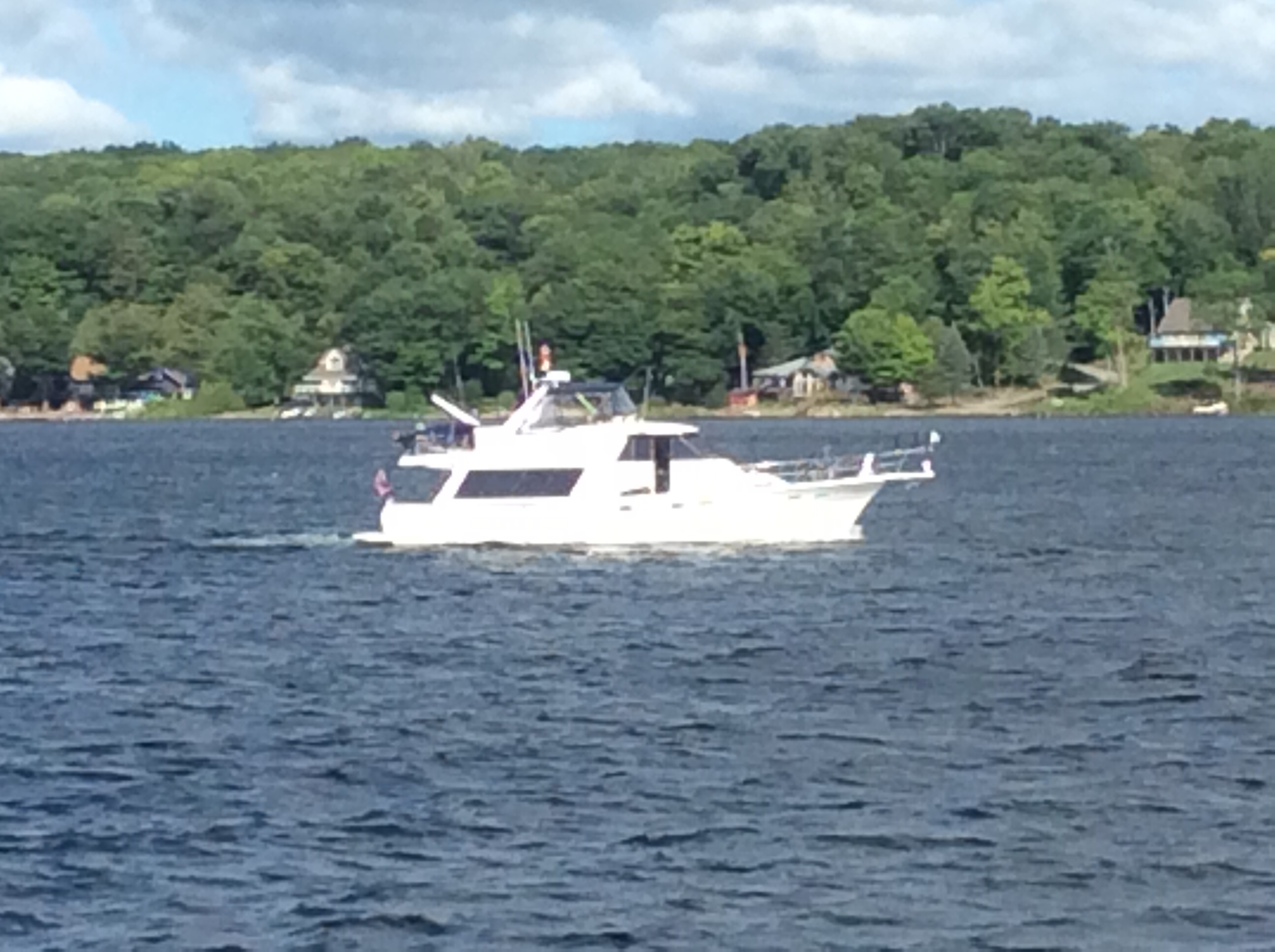 This is an image of our radar screen. Whisky Business’ location is at the bottom of the vertical white line. The large green blob is Golden Daze. It’s green because they are moving away from us at a faster speed. If we were moving faster and closing in on them, it would be red. Below the end of the white line in the center of the image you can see 2 red-ish blobs. Captains Dan and Sam were doing such a splendid job of matching WB’s warp like speed (that would be 9 MPH) that the doppler effect built in to our radar isn’t really sure if we are going faster or slower. Maybe fast-ish.