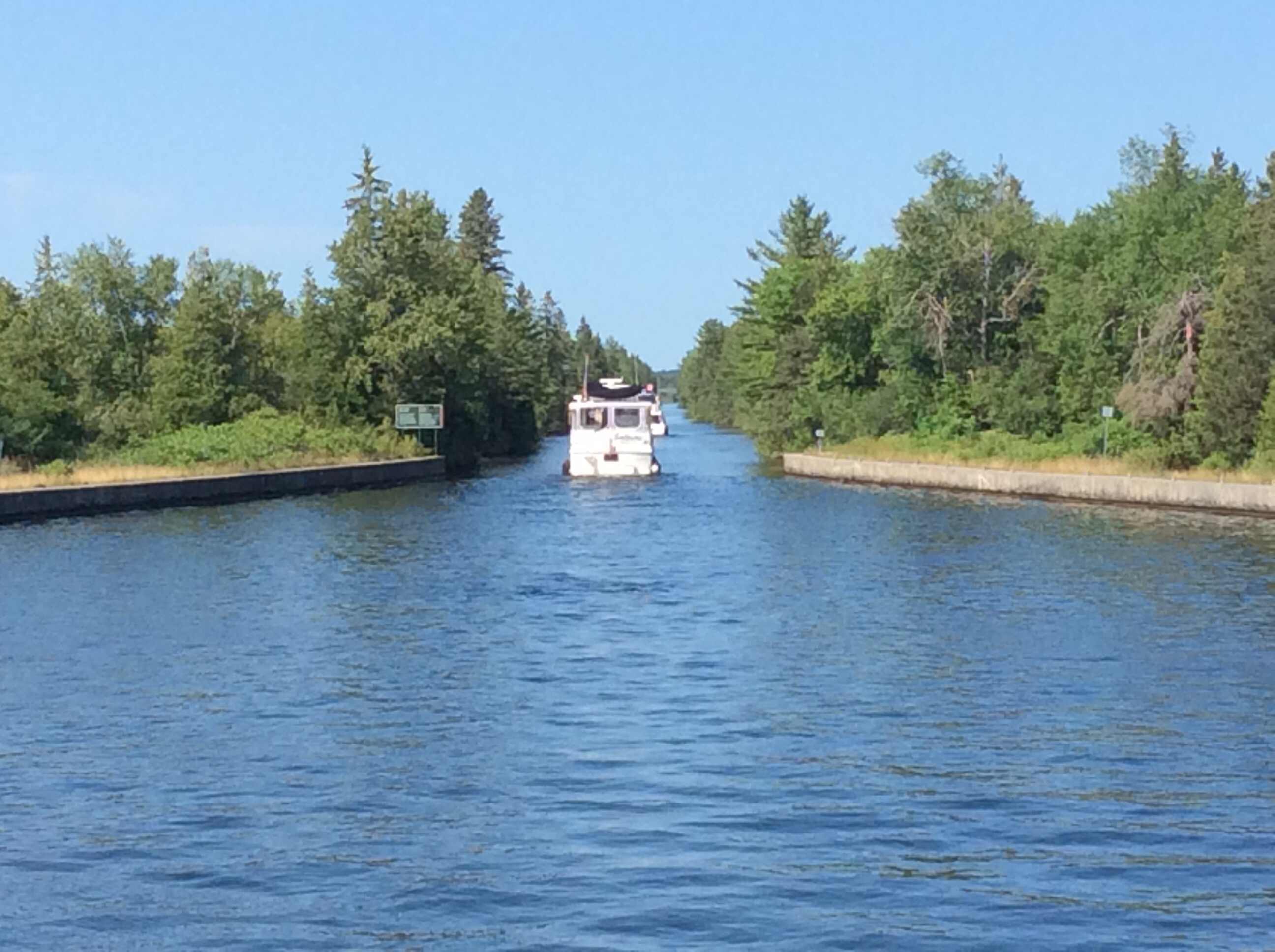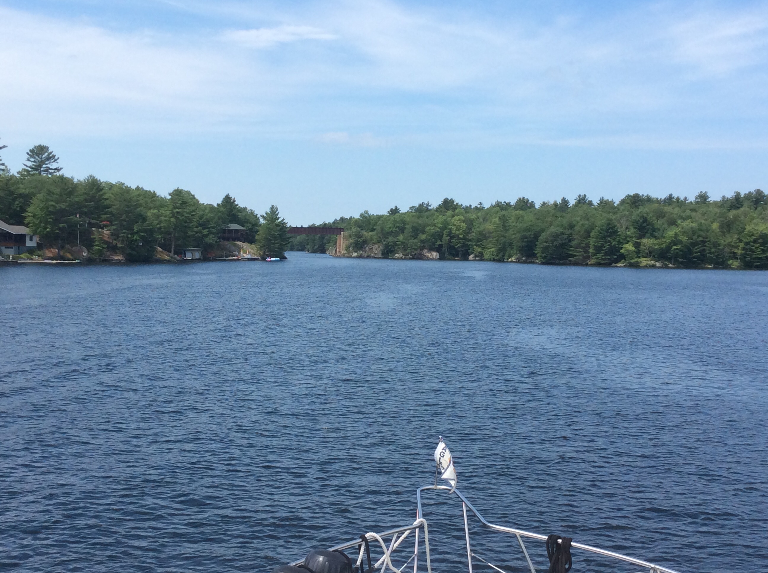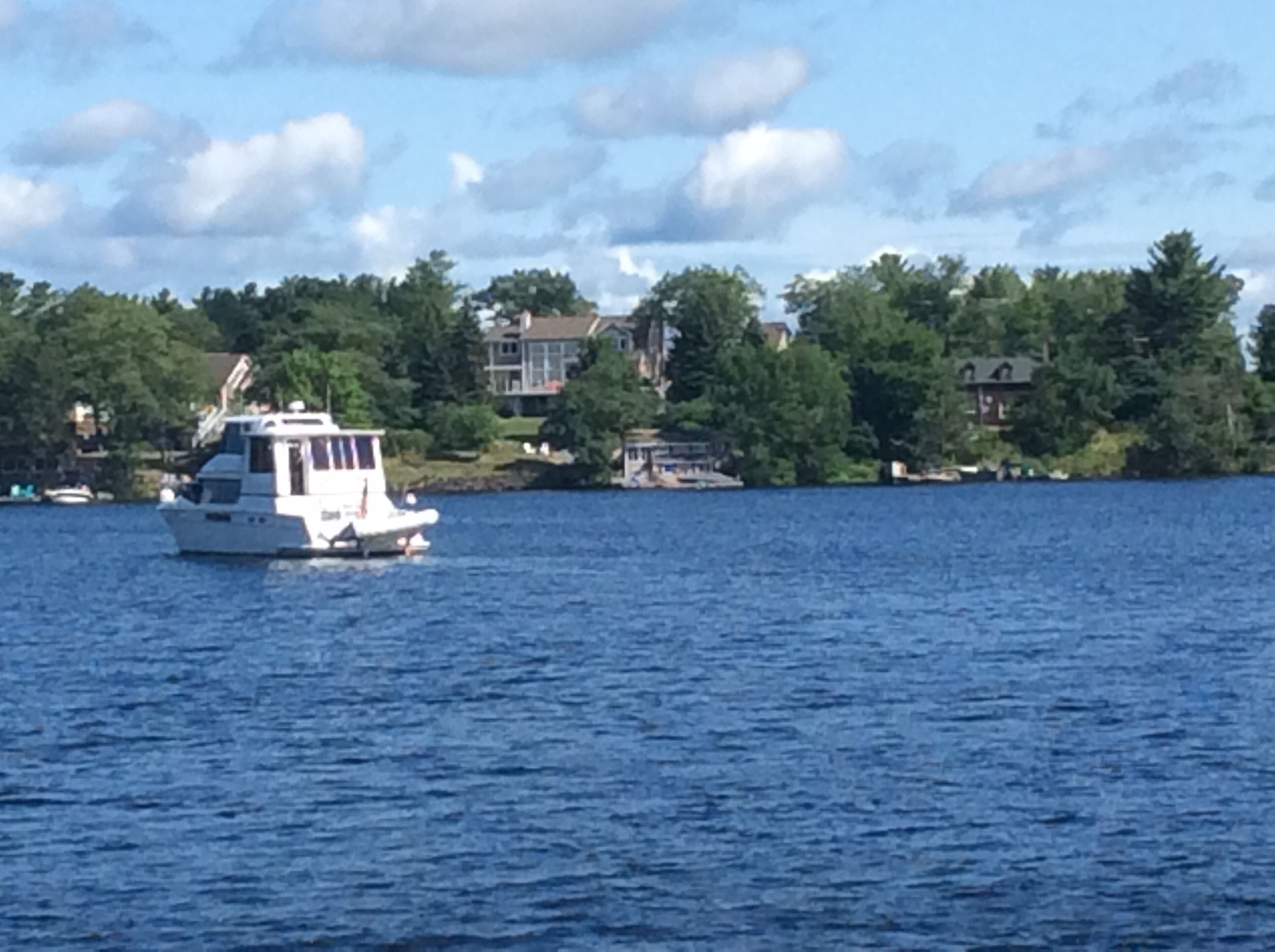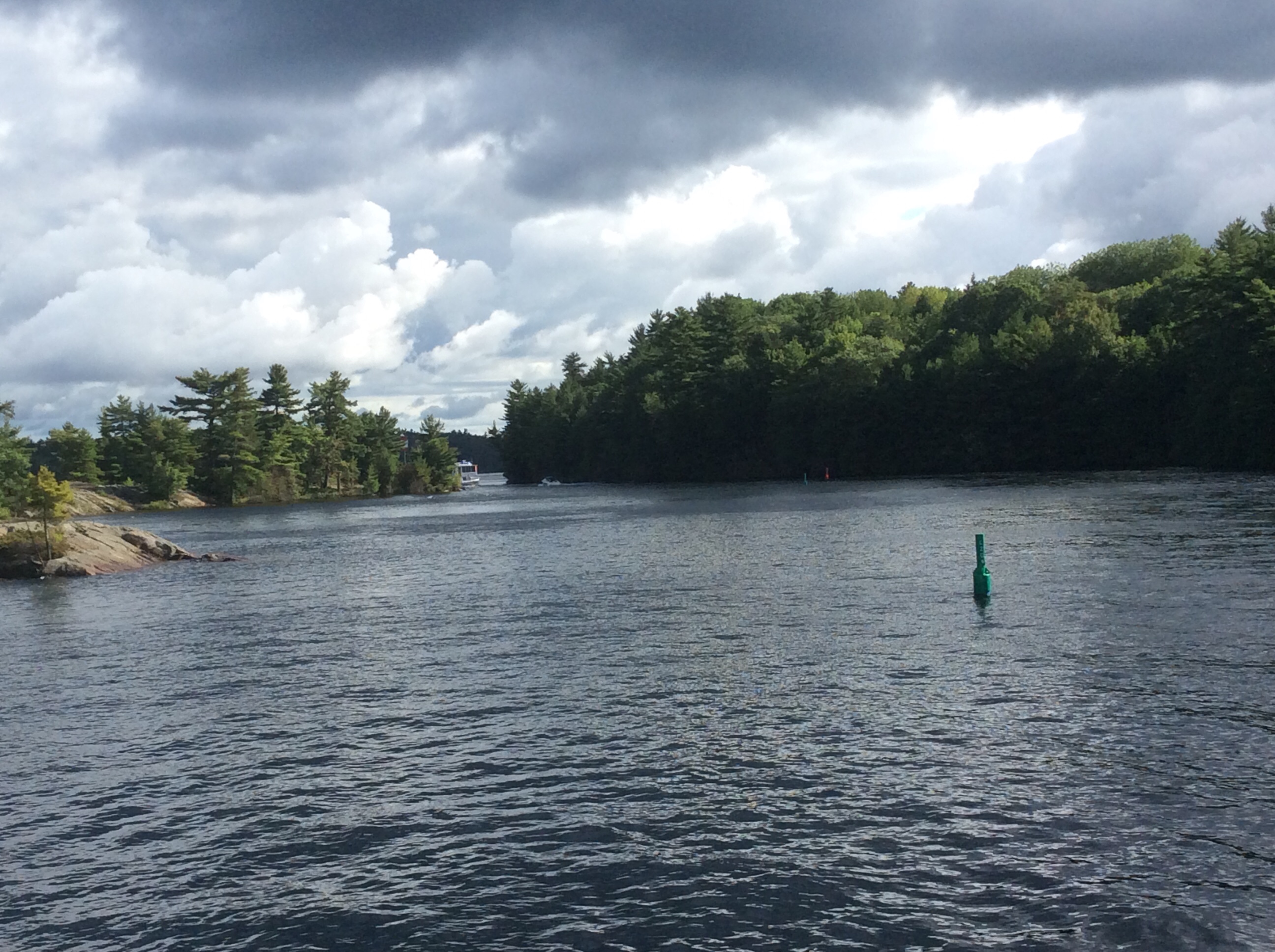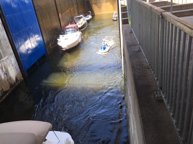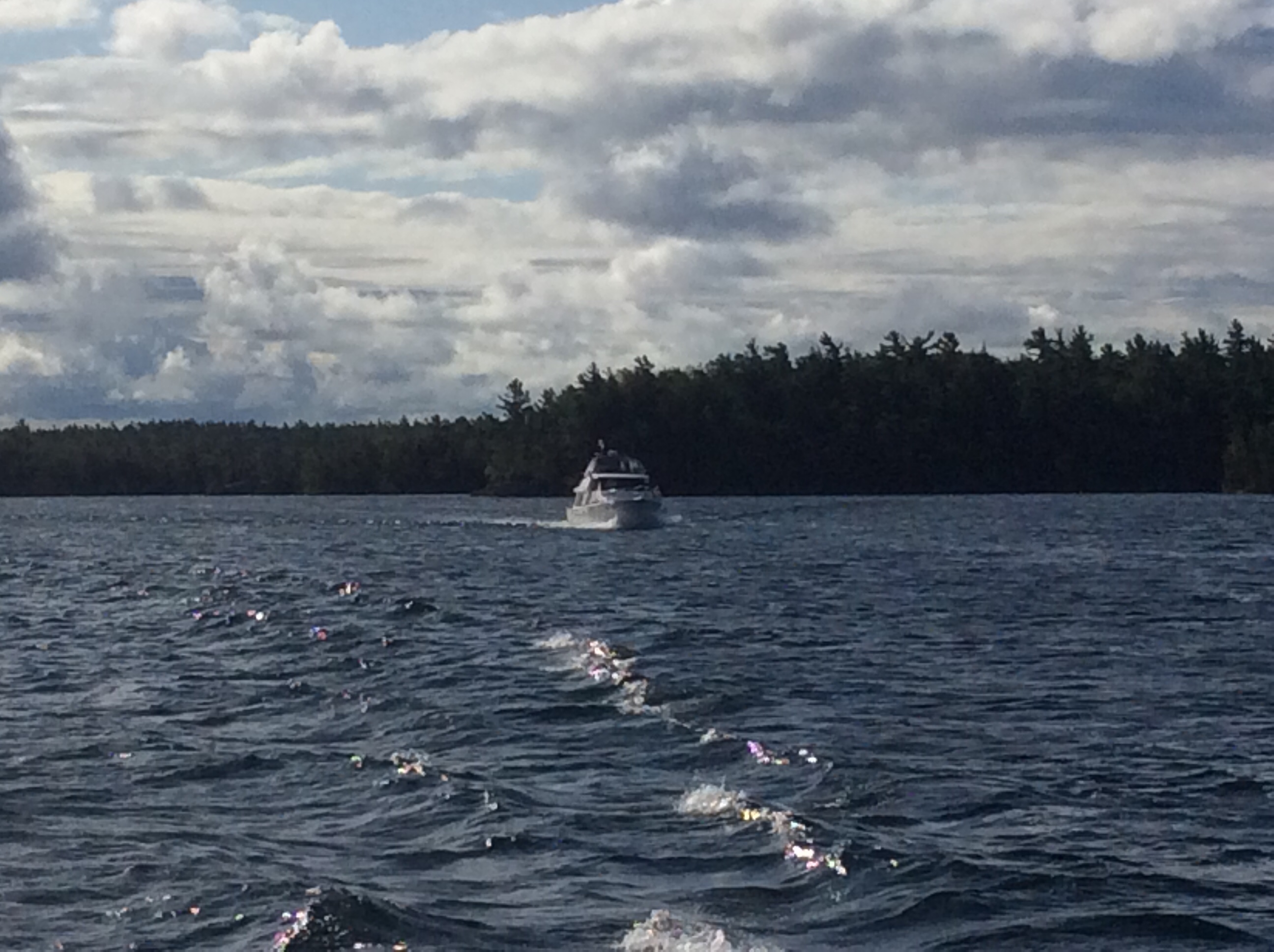 This is an image of our radar screen. Whisky Business’ location is at the bottom of the vertical white line. The large green blob is Golden Daze. It’s green because they are moving away from us at a faster speed. If we were moving faster and closing in on them, it would be red. Below the end of the white line in the center of the image you can see 2 red-ish blobs. Captains Dan and Sam were doing such a splendid job of matching WB’s warp like speed (that would be 9 MPH) that the doppler effect built in to our radar isn’t really sure if we are going faster or slower. Maybe fast-ish.