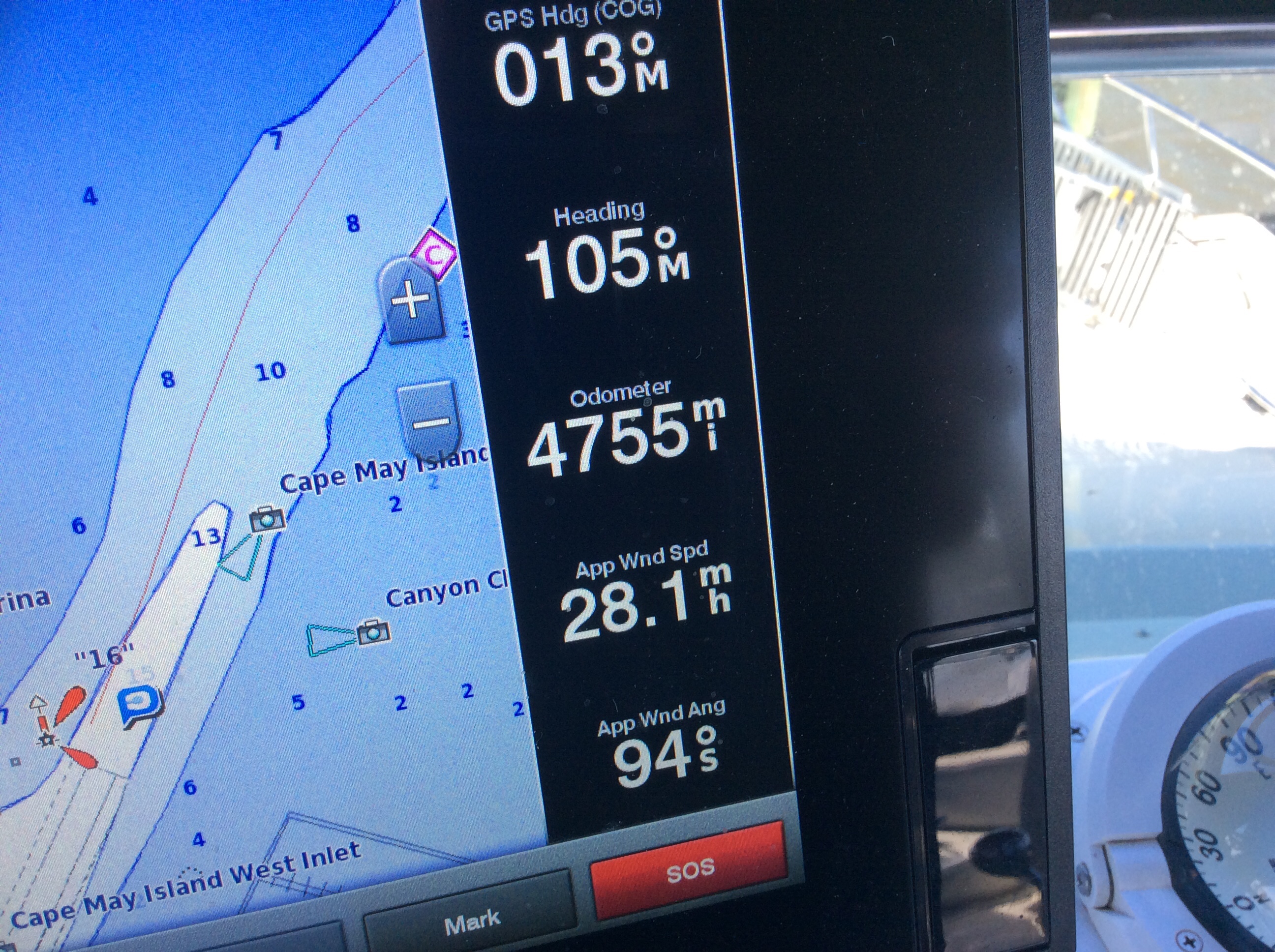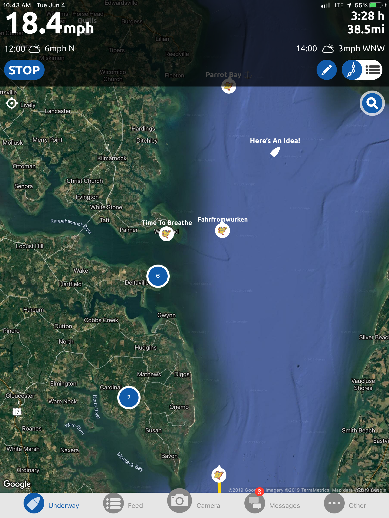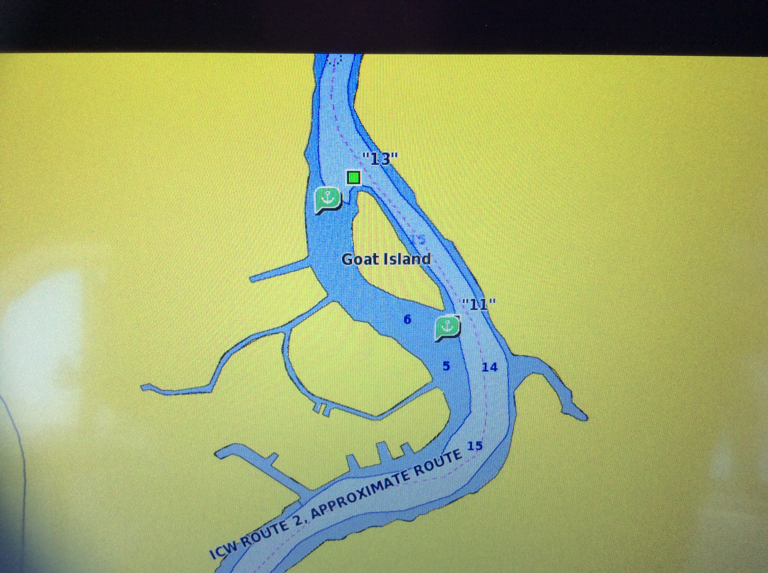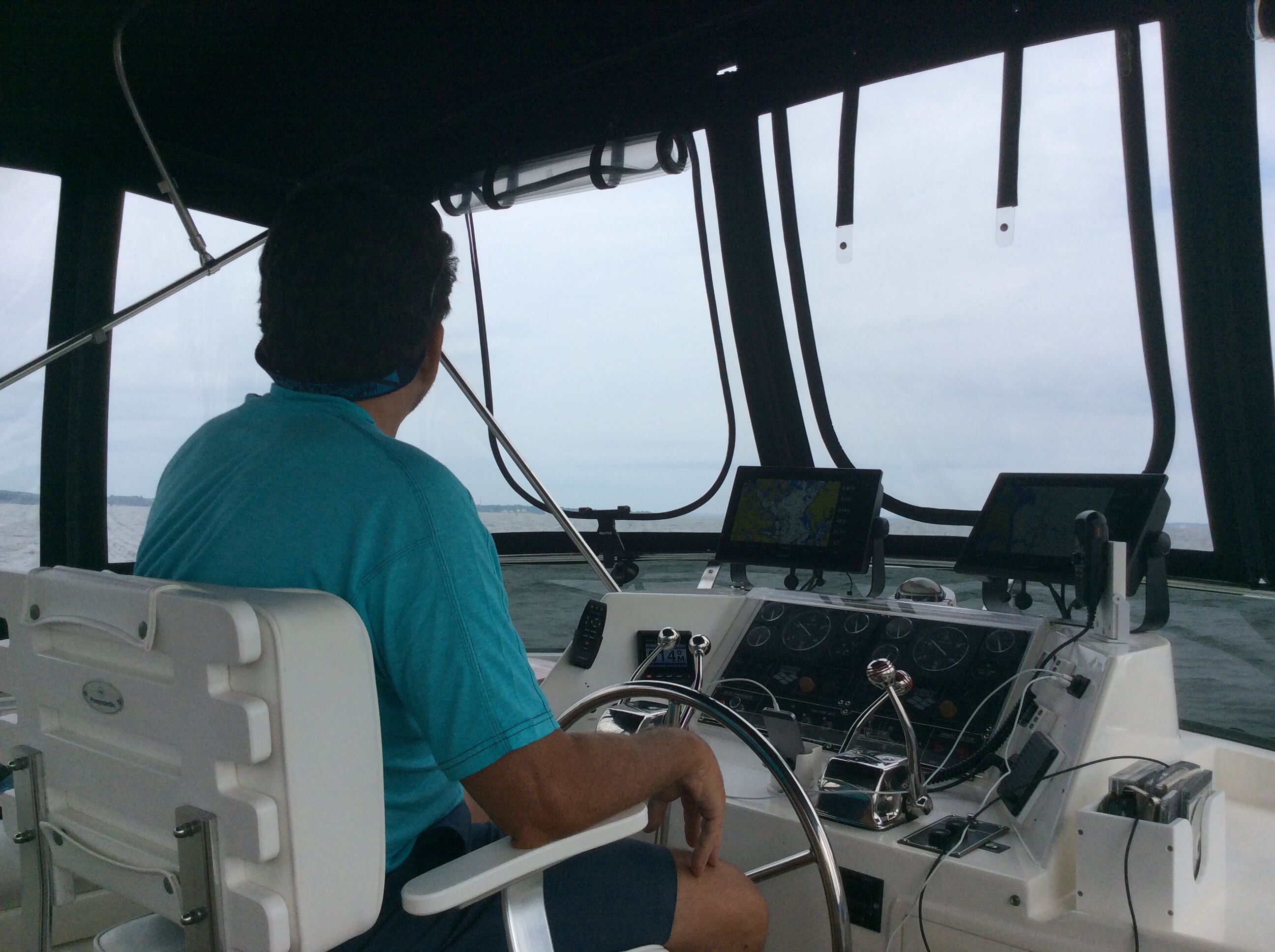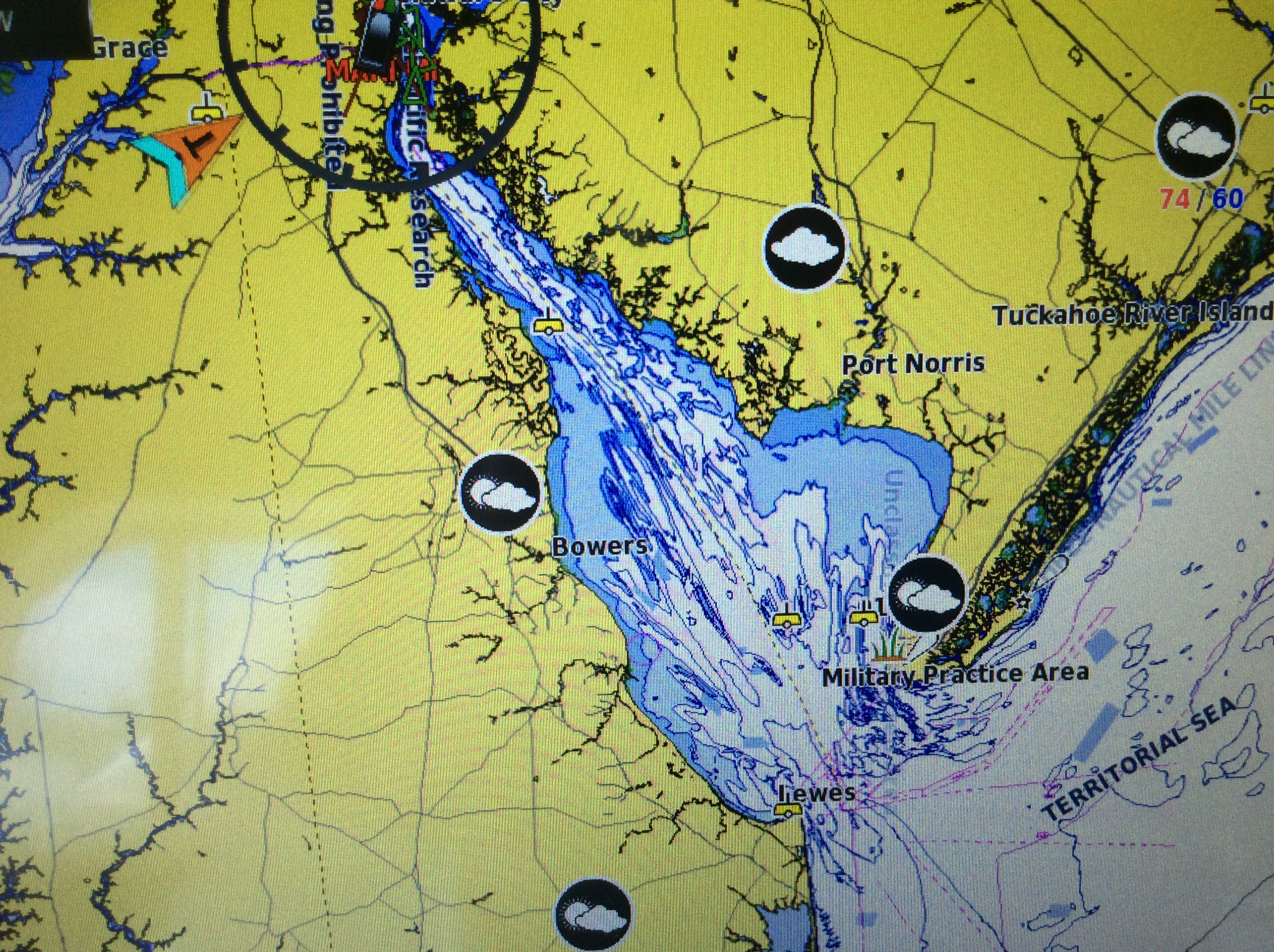 This is a view from the NEBO app of our trip yesterday. The color green denotes our speed at over 10 MPH, yellow at over 15 and red at over 20. On flat water at our “cruise speed” we are running around 18-19 MPH. Had we been running flat and calm water yesterday at cruise the line would have been an unbroken yellow line. Since we had those “swells” or really wide waves we would slow down as we “climbed” the nearest side of the wave but our speed would increase to over 20 as we “sped” down the other side. Close to the top of the photo you can see where we went into “stealth” mode. Not really, NEBO just dropped us for a bit, maybe poor cell signal. We ran 11 hours and covered 135 miles. One Hundred, Thirty Five miles in 11 hours and burned over 100 gallons of fuel. Coulda done it in a car in 2 hours burning less than 5 gallons of gas. ??????????????????????????????????????????????????????????????????????????