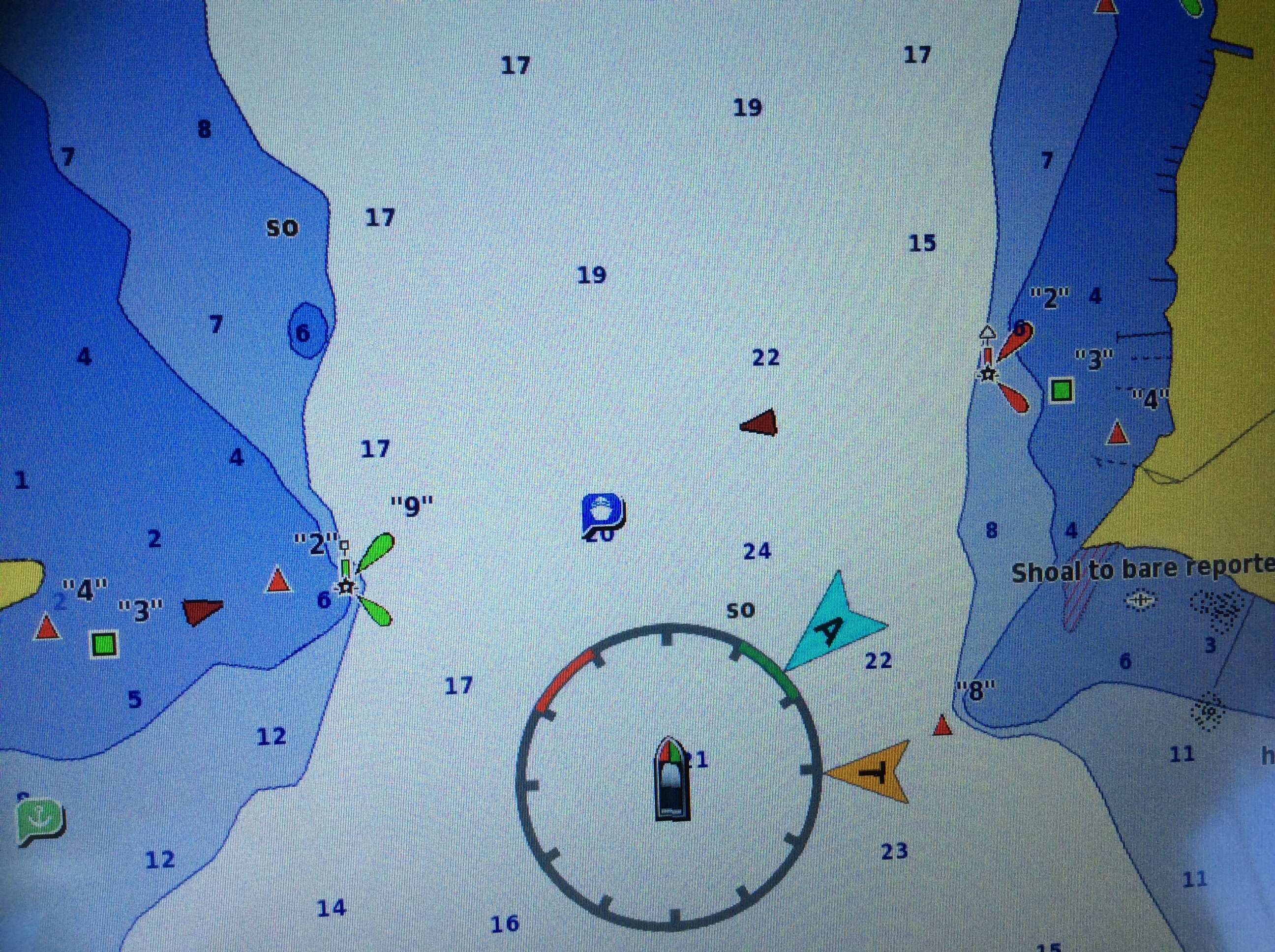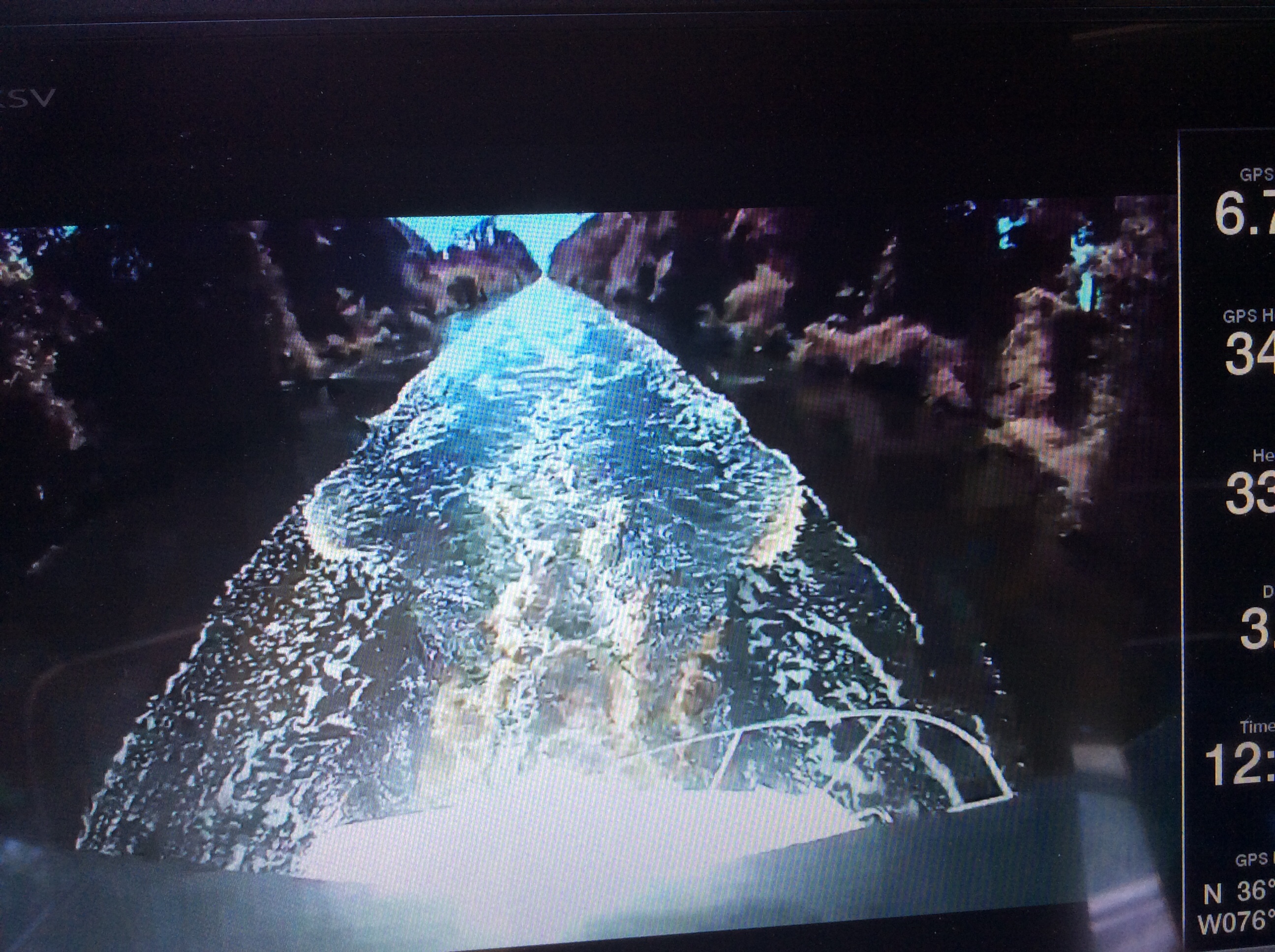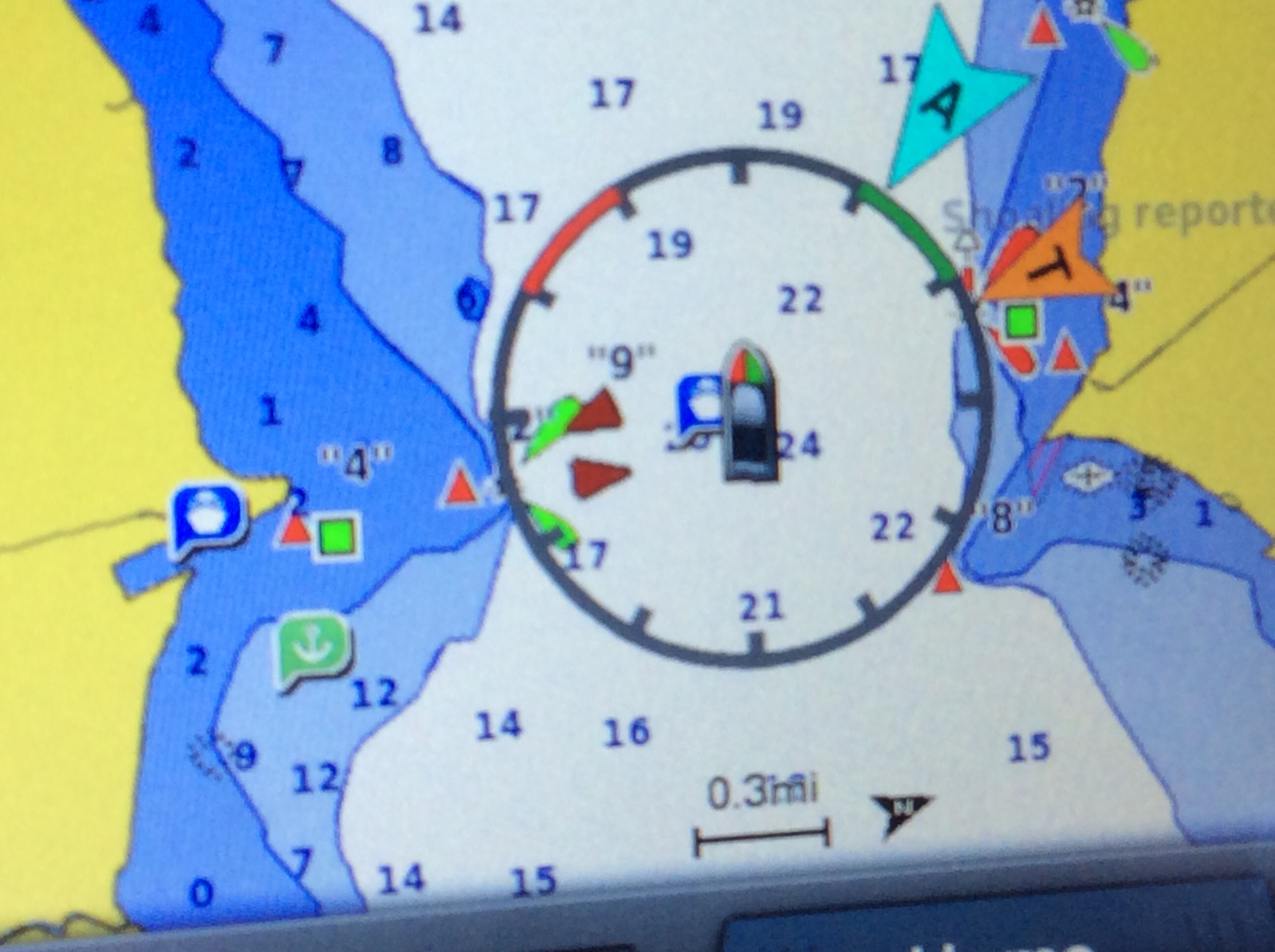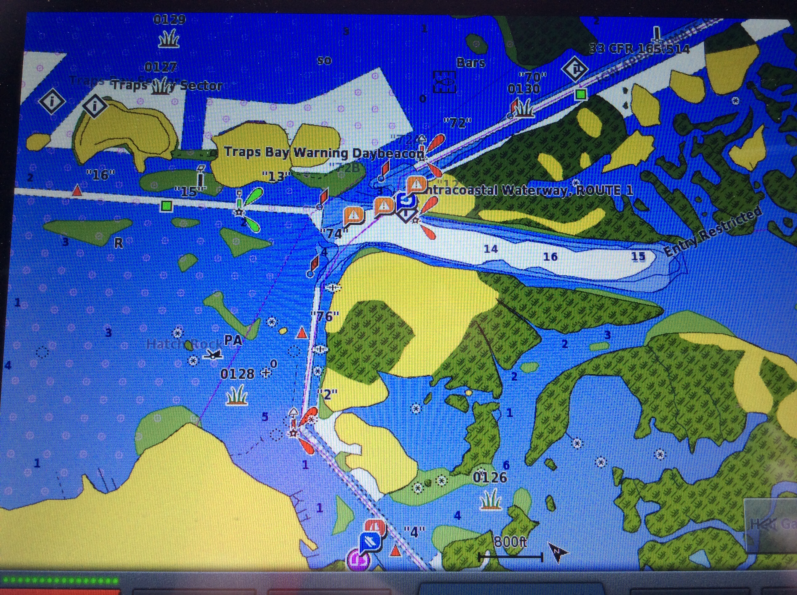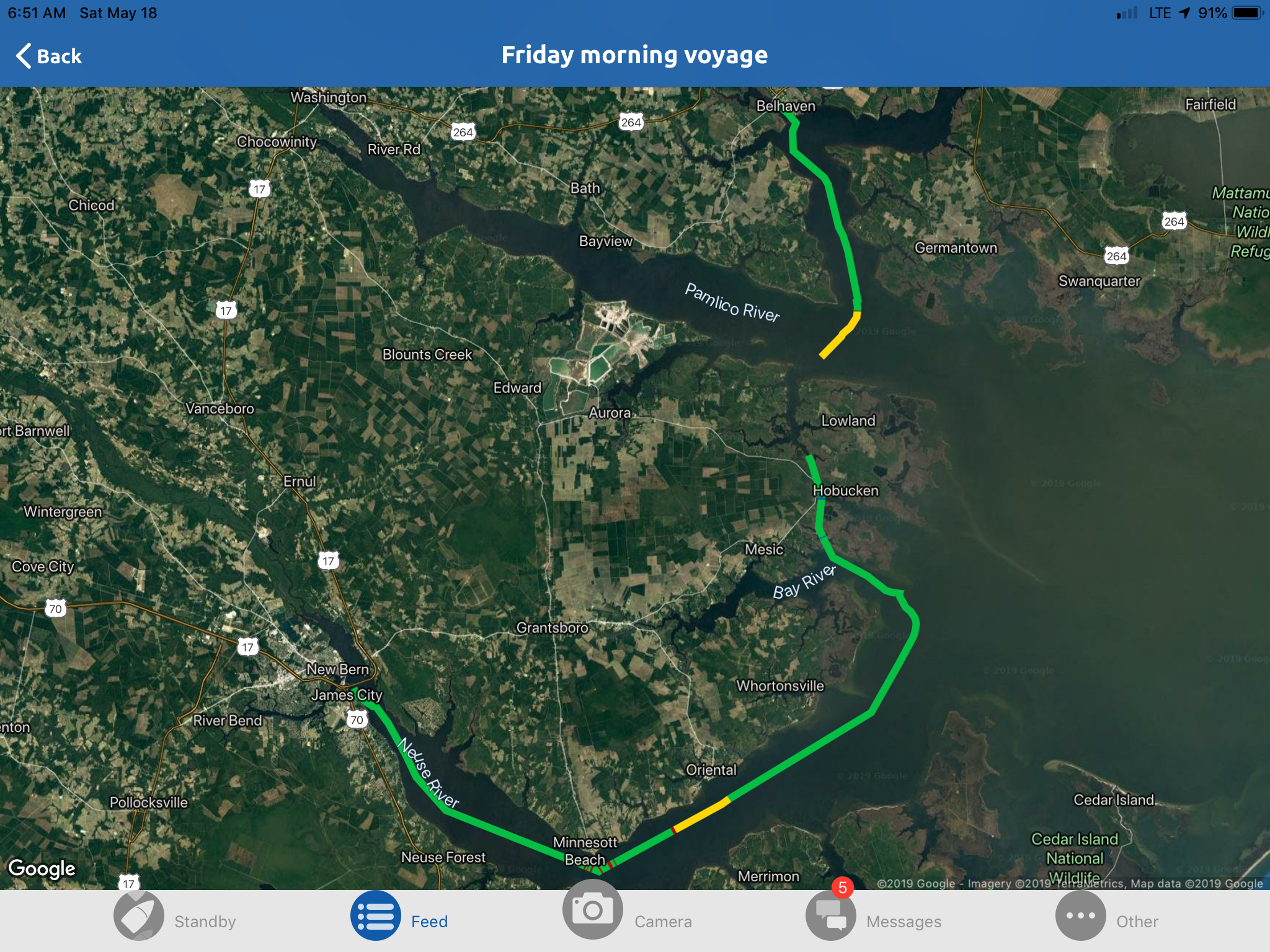 This is a view from the NEBO app of our trip yesterday. The color green denotes our speed at over 10 MPH, yellow at over 15 and red at over 20. On flat water at our “cruise speed” we are running around 18-19 MPH. Had we been running flat and calm water yesterday at cruise the line would have been an unbroken yellow line. Since we had those “swells” or really wide waves we would slow down as we “climbed” the nearest side of the wave but our speed would increase to over 20 as we “sped” down the other side. Close to the top of the photo you can see where we went into “stealth” mode. Not really, NEBO just dropped us for a bit, maybe poor cell signal. We ran 11 hours and covered 135 miles. One Hundred, Thirty Five miles in 11 hours and burned over 100 gallons of fuel. Coulda done it in a car in 2 hours burning less than 5 gallons of gas. ??????????????????????????????????????????????????????????????????????????