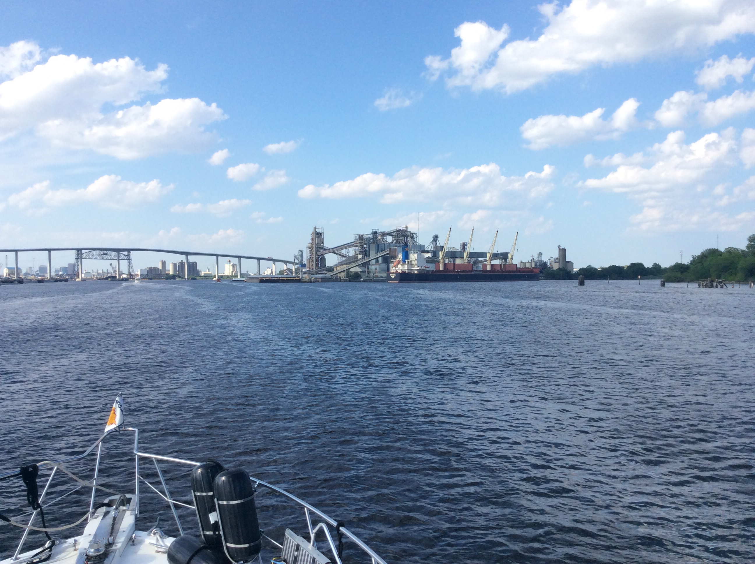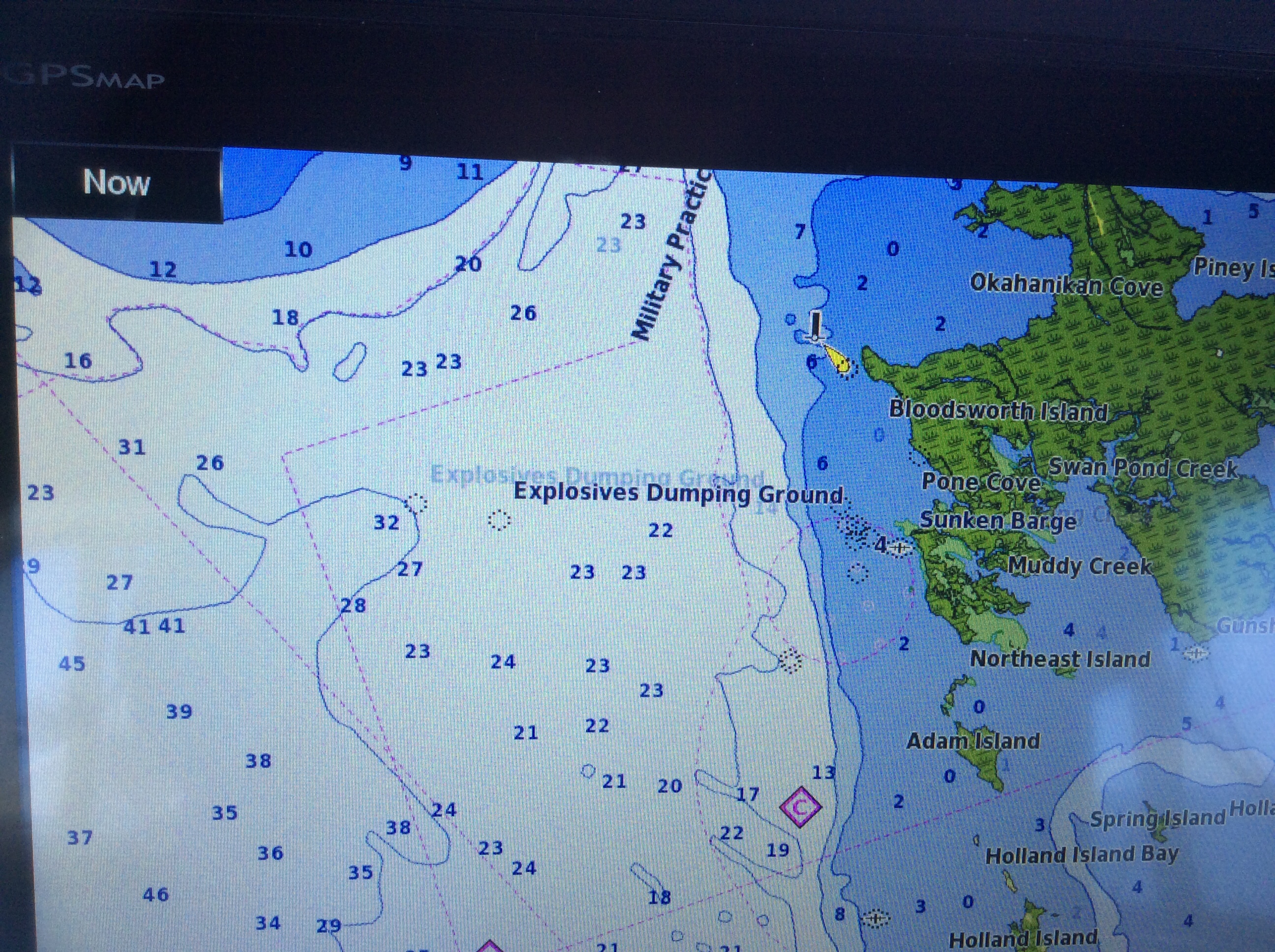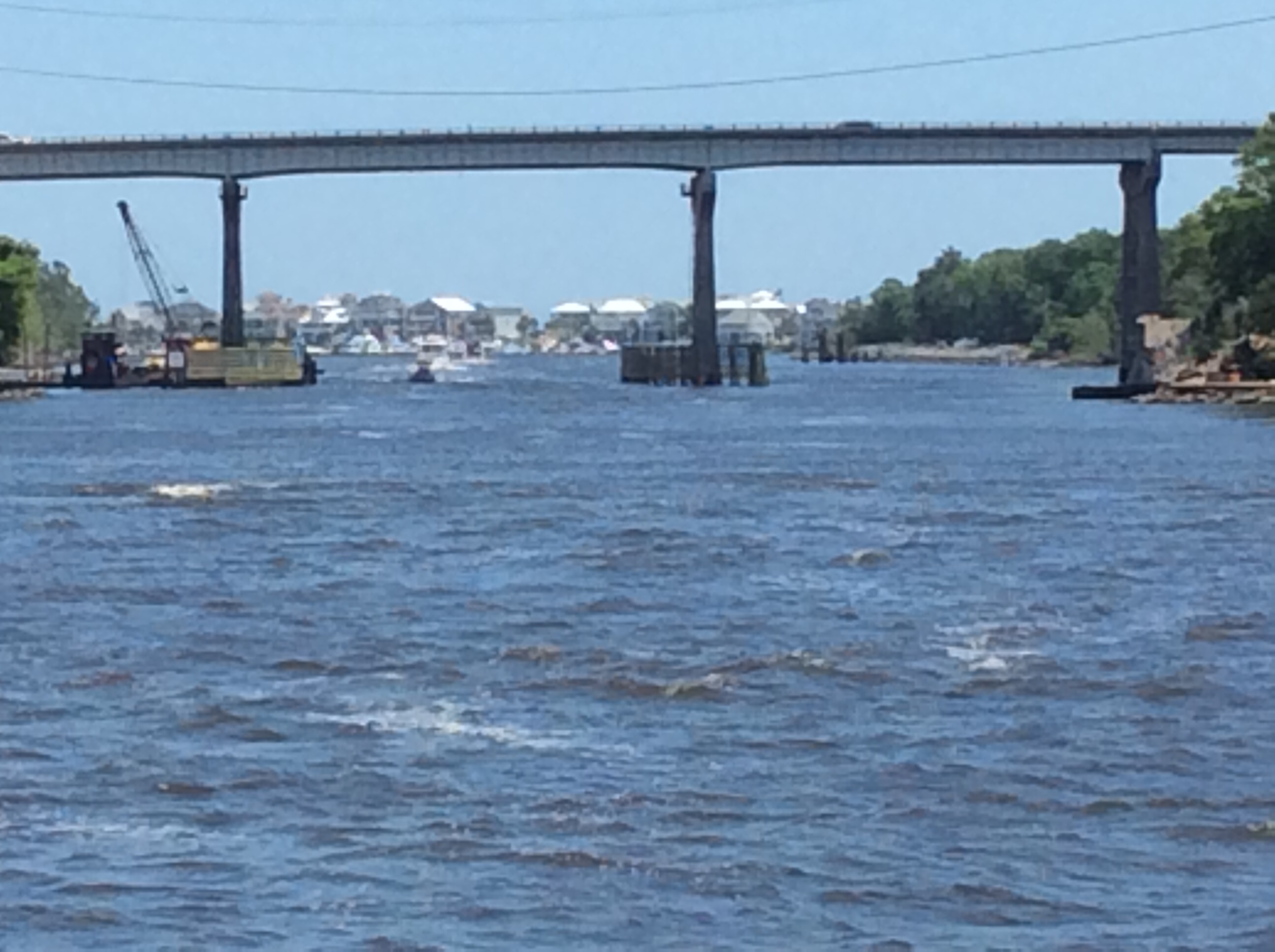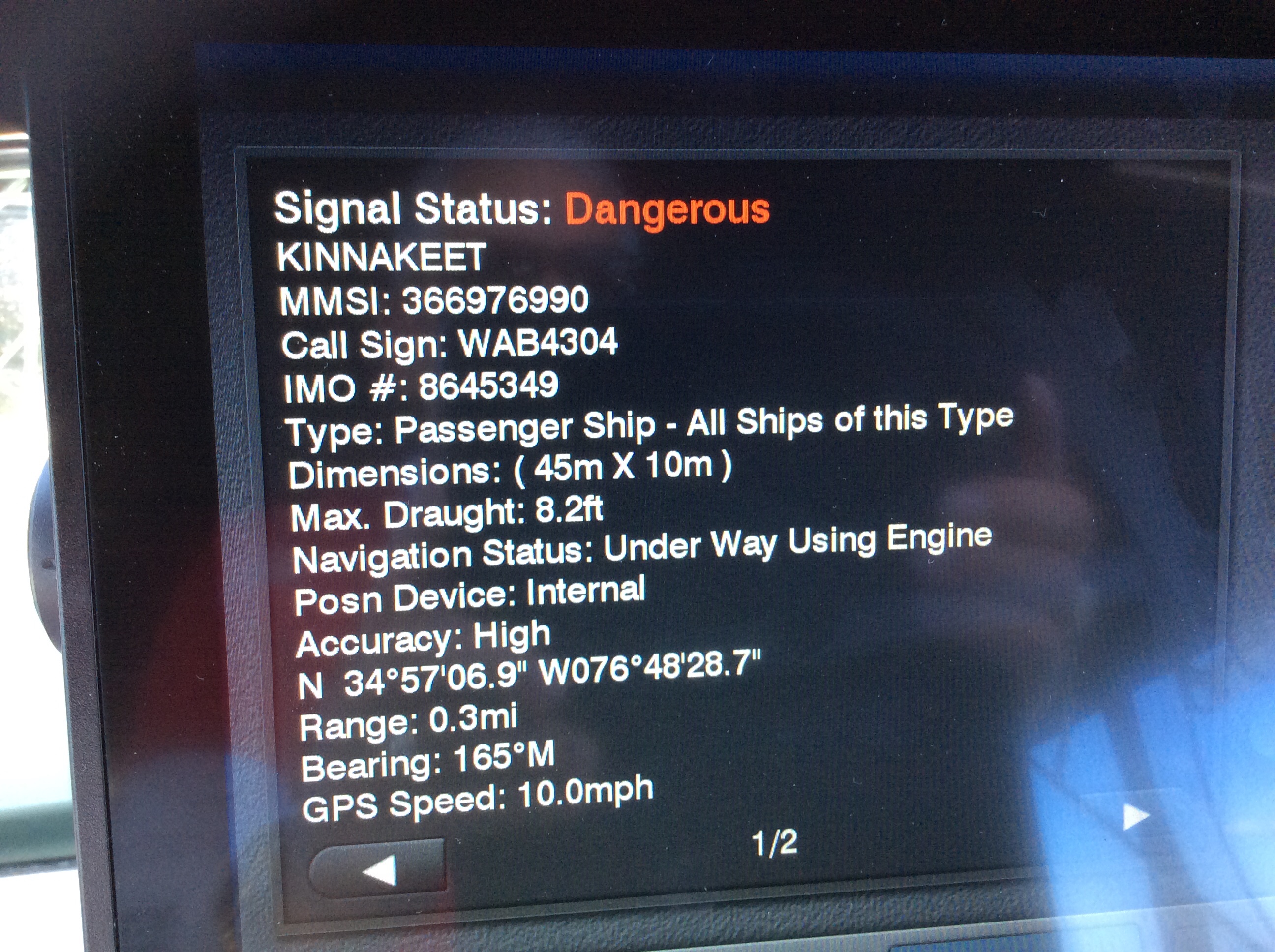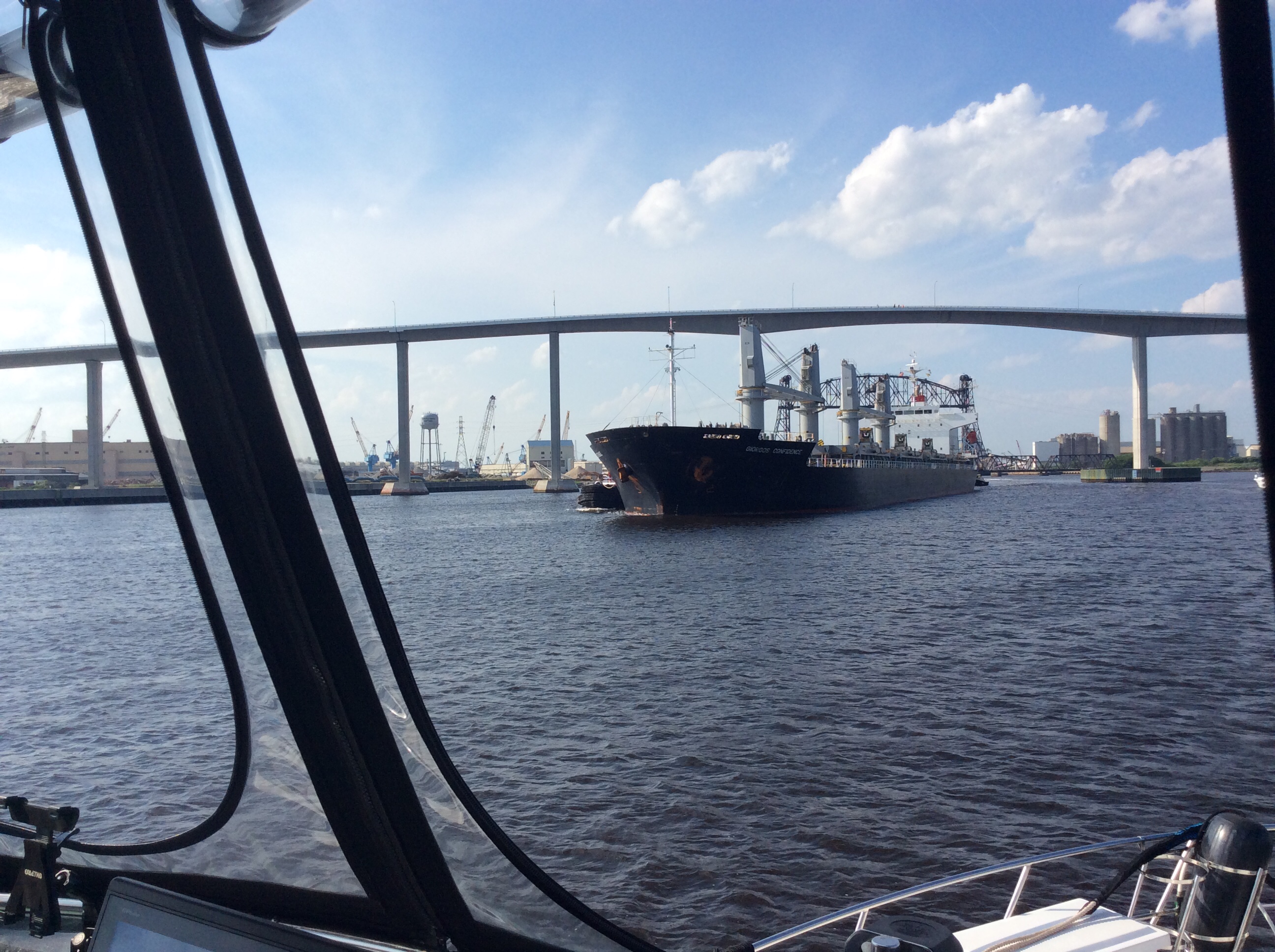 This is a view from the NEBO app of our trip yesterday. The color green denotes our speed at over 10 MPH, yellow at over 15 and red at over 20. On flat water at our “cruise speed” we are running around 18-19 MPH. Had we been running flat and calm water yesterday at cruise the line would have been an unbroken yellow line. Since we had those “swells” or really wide waves we would slow down as we “climbed” the nearest side of the wave but our speed would increase to over 20 as we “sped” down the other side. Close to the top of the photo you can see where we went into “stealth” mode. Not really, NEBO just dropped us for a bit, maybe poor cell signal. We ran 11 hours and covered 135 miles. One Hundred, Thirty Five miles in 11 hours and burned over 100 gallons of fuel. Coulda done it in a car in 2 hours burning less than 5 gallons of gas. ??????????????????????????????????????????????????????????????????????????