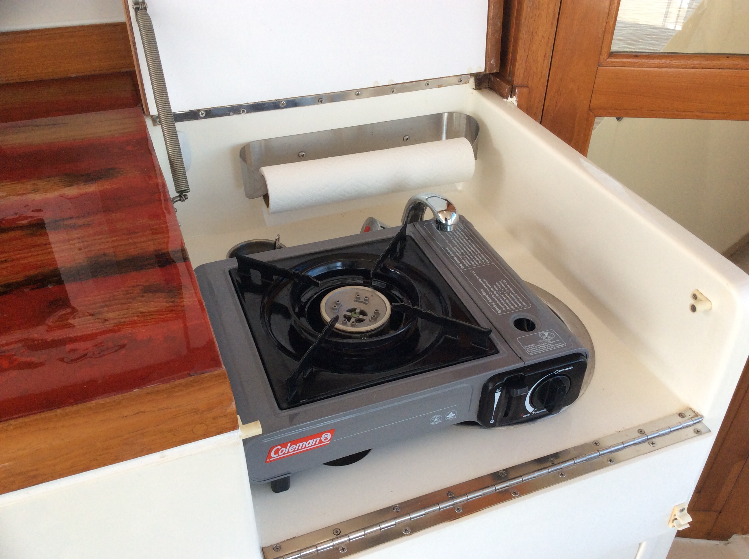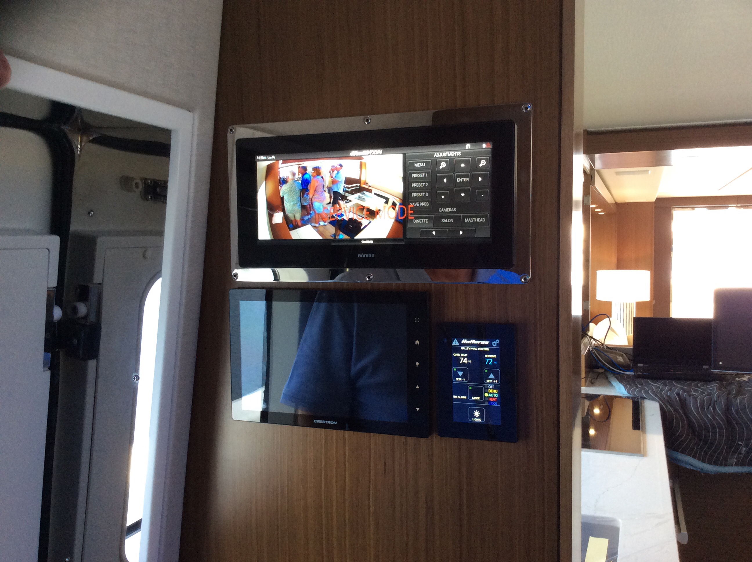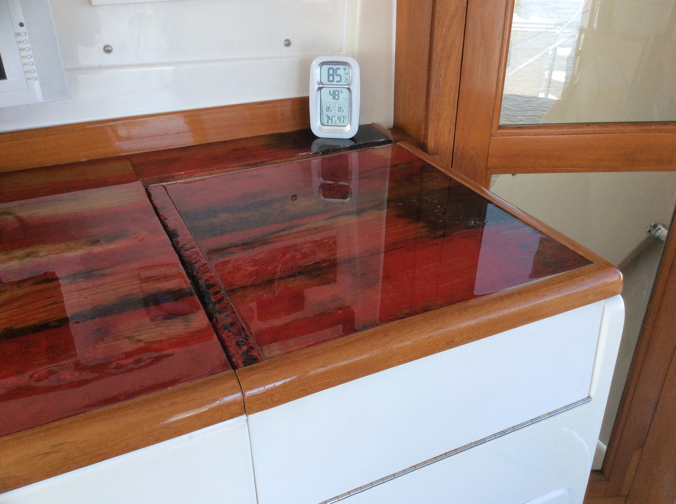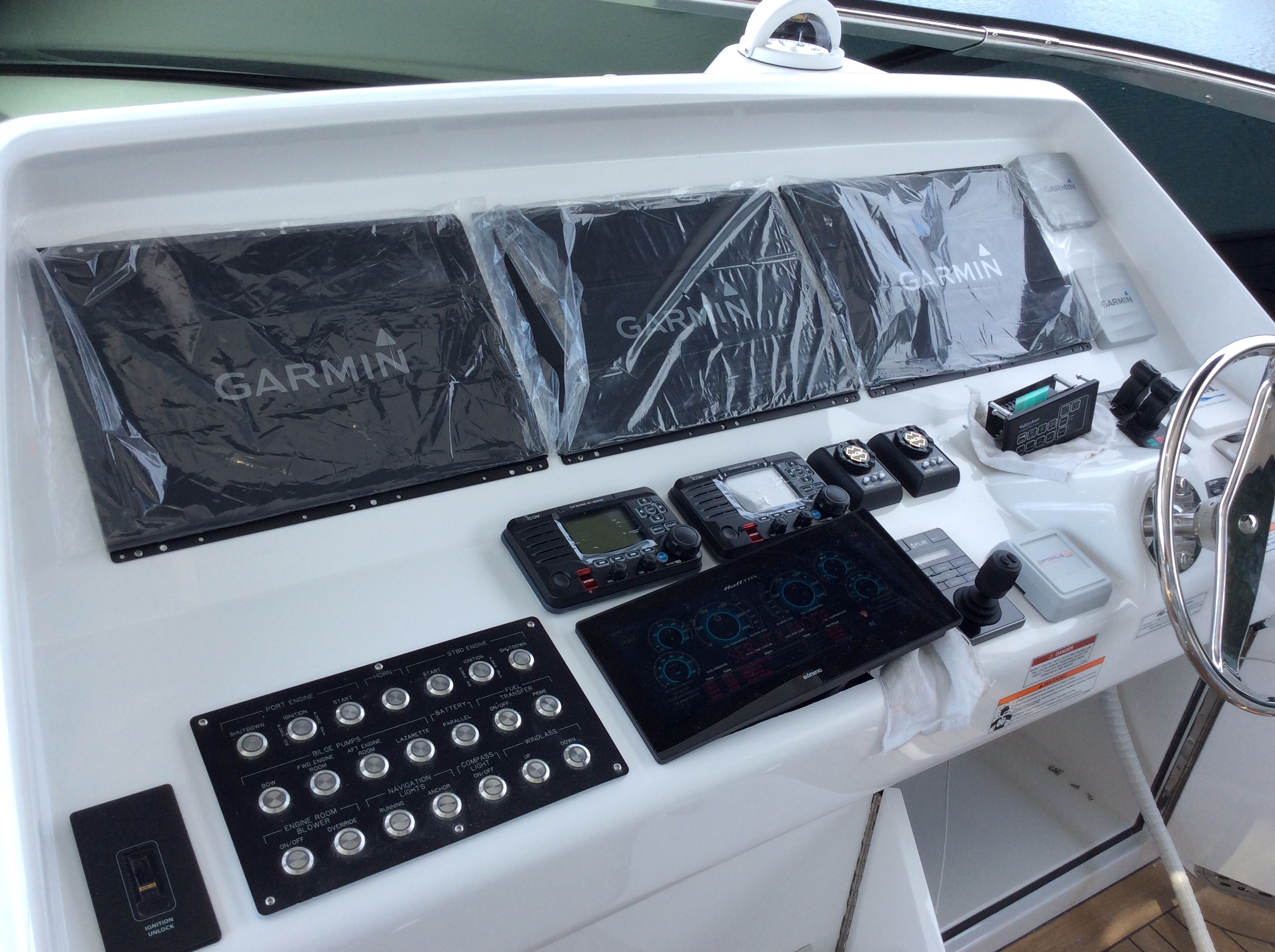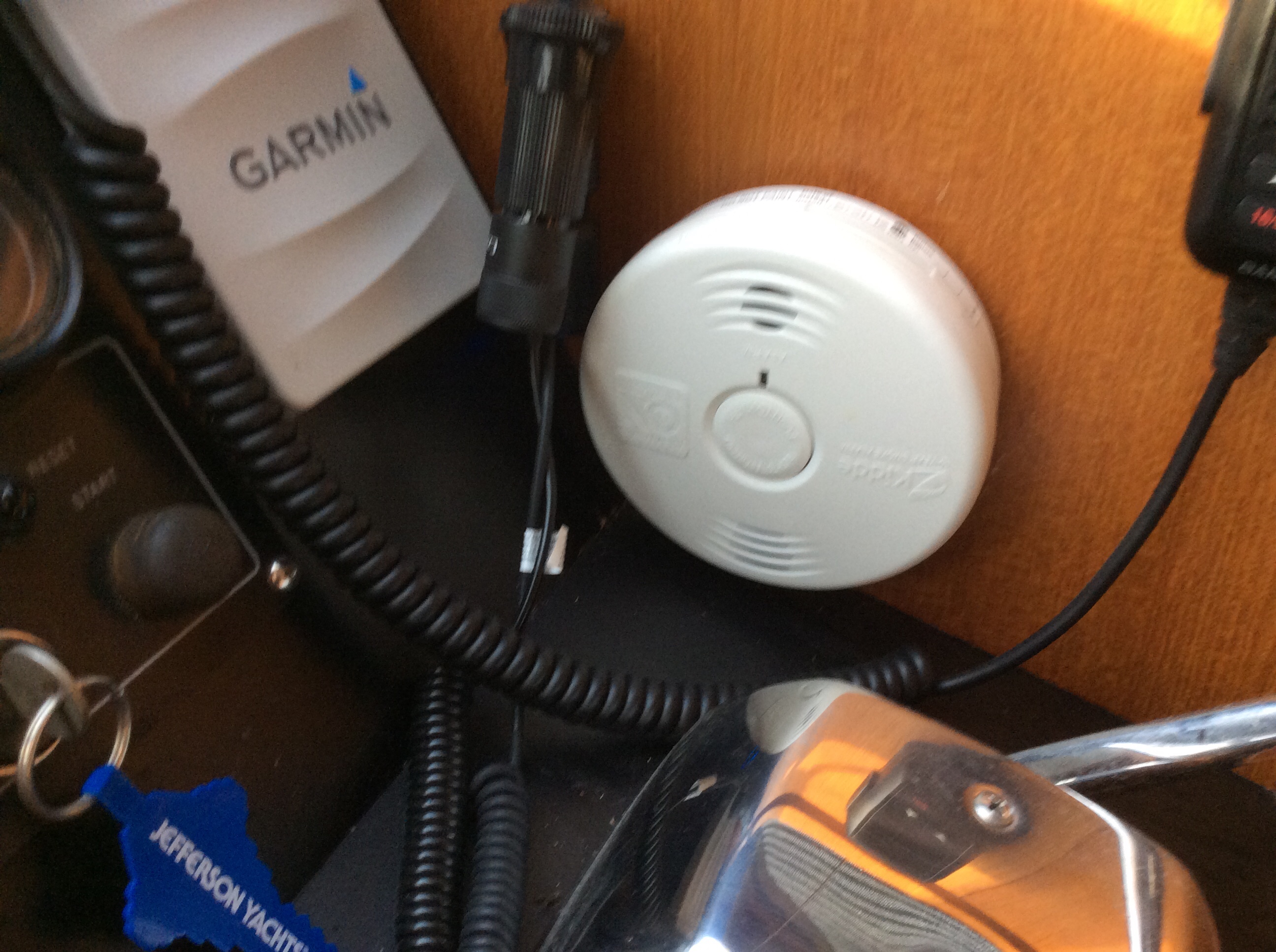 Y’all know what this is right? Smoke & Carbon Monoxide detector. One of the first things we put on the boat. Put one in the forward cabin, the one you see below at the lower helm and one in the aft cabin/master bedroom. As stated in the previous post of this august journal we had a helluva day yesterday, Up at 4:15, underway at 5:15, washed the boat, changed the oil, brief naps, went out for a slice of pizza and in bed by 10. Totally exhausted. Well, startng at midnight the lil’ bastard you see below starts goin’ off. First it’s hollerin’ FIRE! No fire. Then it starts hollerin’ CARBON MONOXIDE DETECTED! No damn carbon monoxide. Nuttin is running, not the main engines, not the generator and no other boats around us are running their engines or gensets. Push the shut up button and it stops. At 1 AM it starts acting up again. At 3 AM it starts acting up AGAIN.