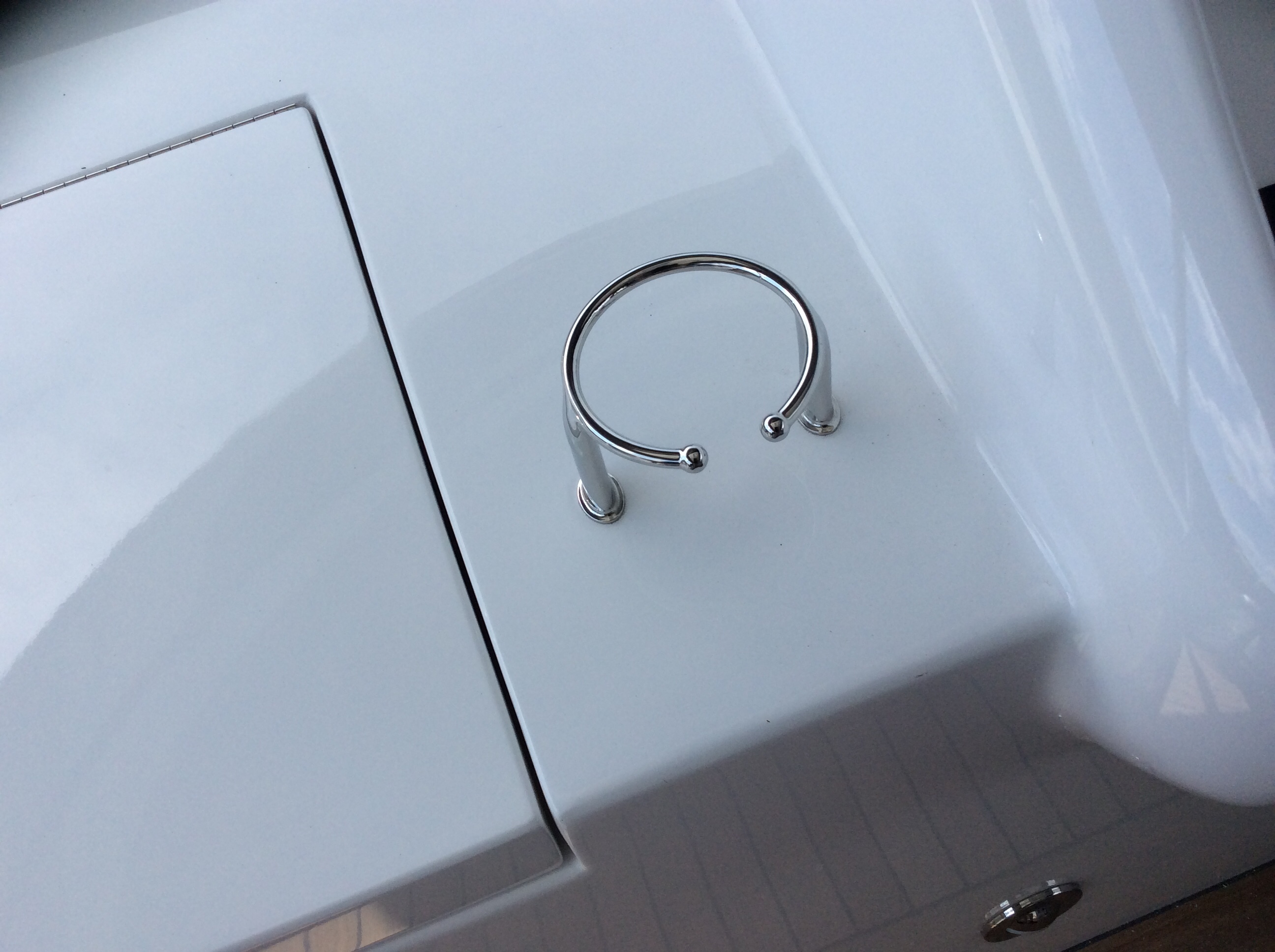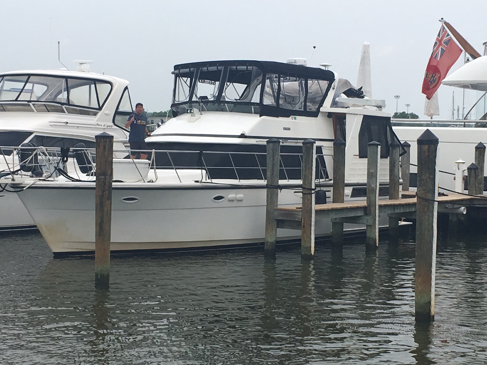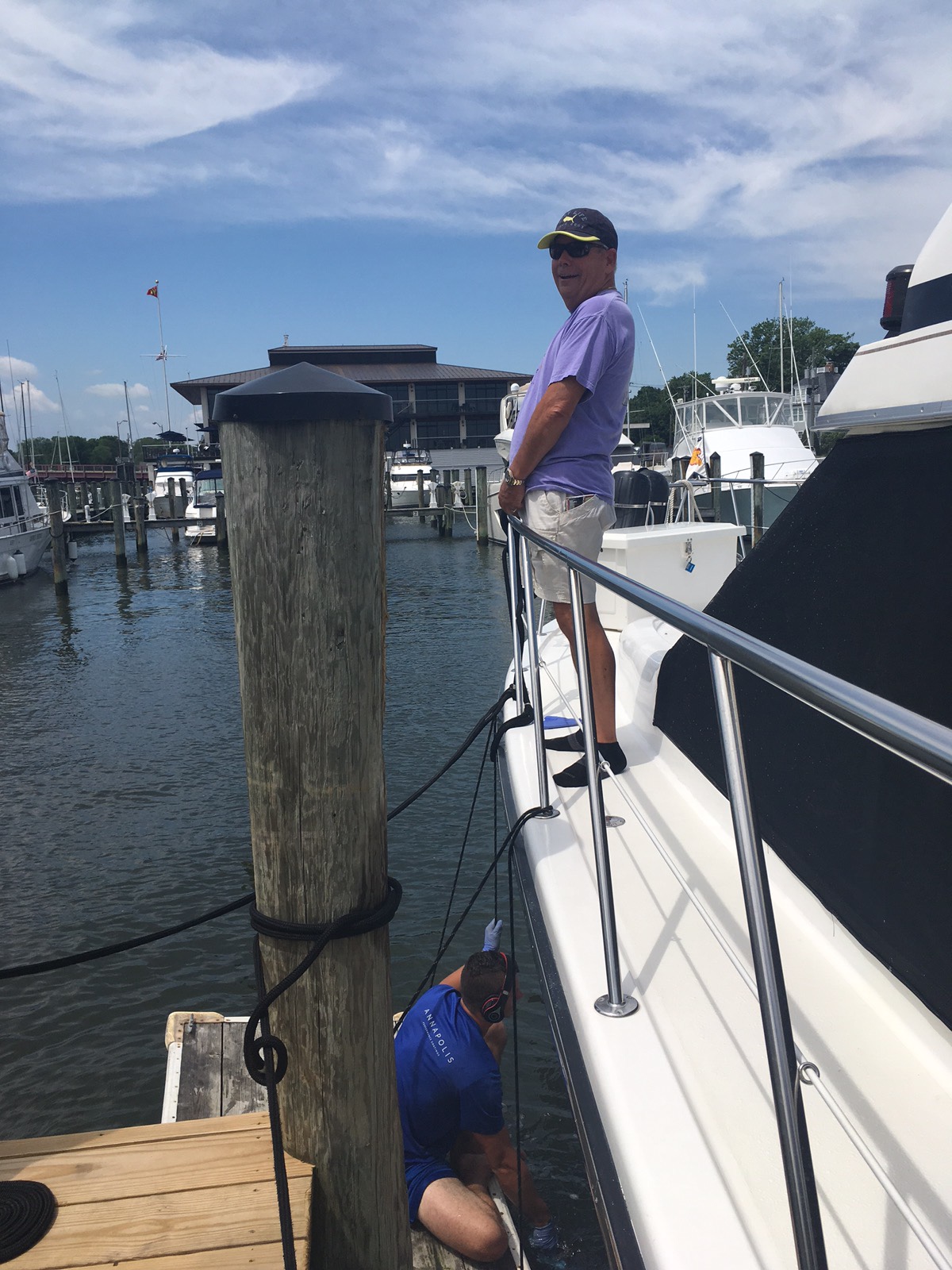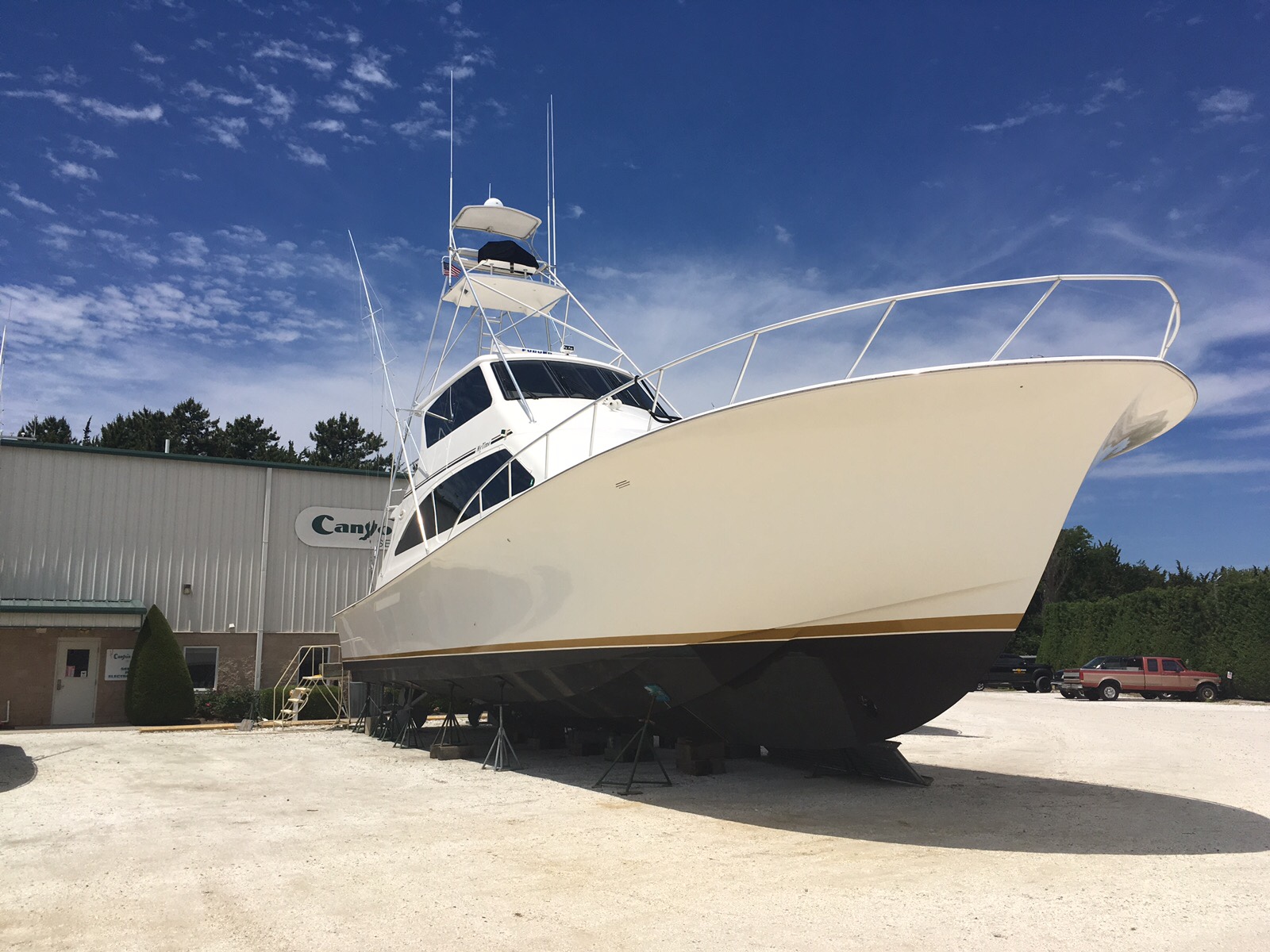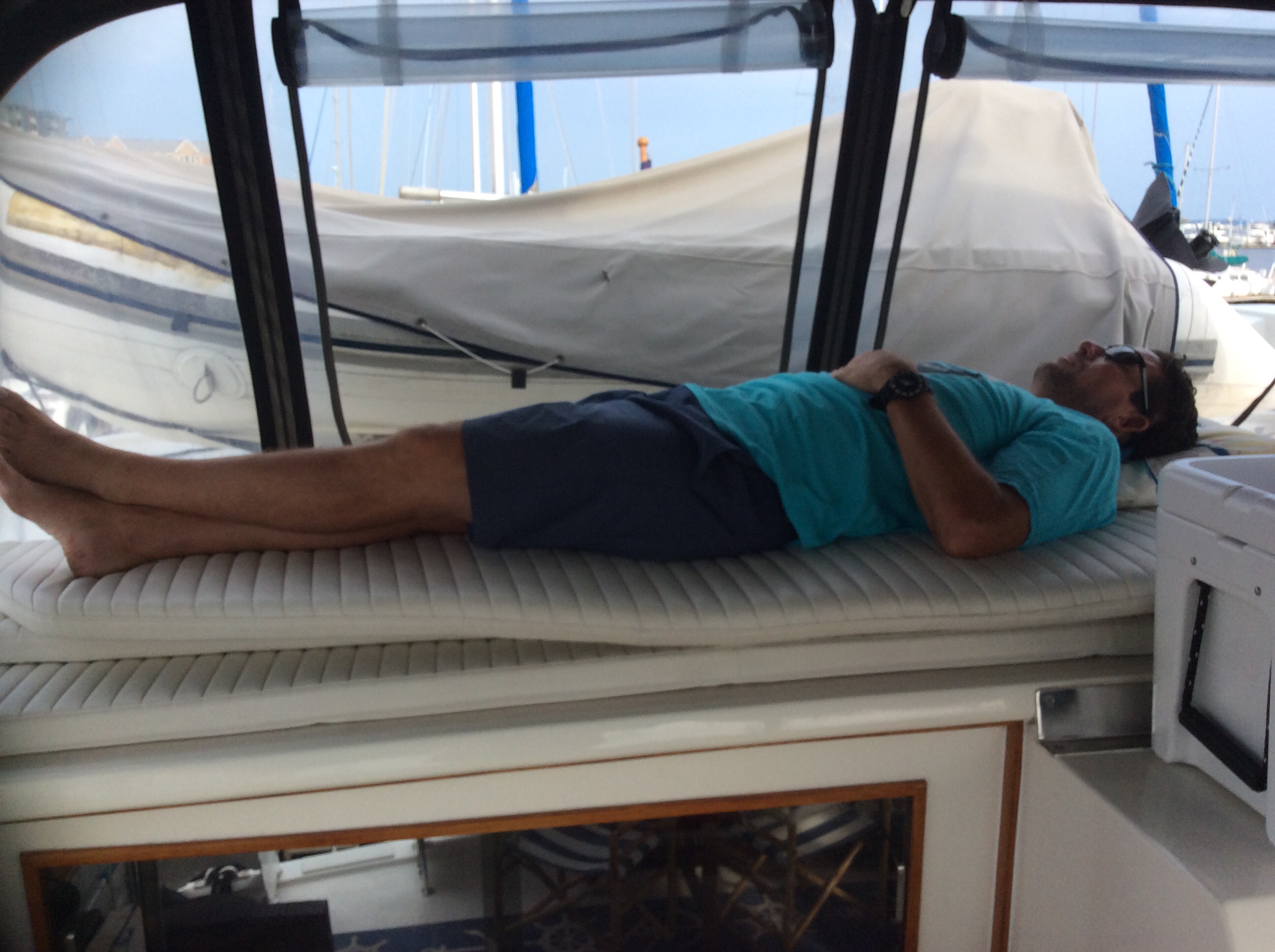 Took a walk around the marina yesterday to see if there was a receptacle to dispose of the 10 gallons of oil I drained from the engines yesterday. Came across this beautiful sport fisherman out of the water. Must be at least 70 feet long. Look at the top of the tower. Captain drives the boat from up there looking for fish. Imagine being up there in rough seas. Damn, I don’t even want to think about climbing up or down from there in rough seas.